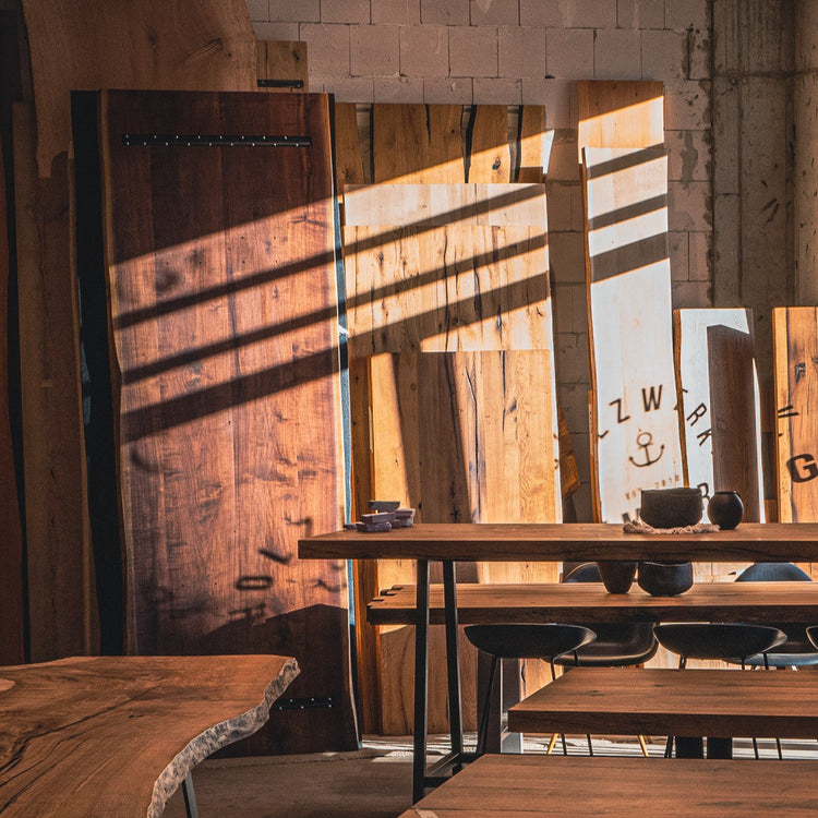 Jede Platte ist ein echtes Stück Natur. Ob rustikale Wildeiche mit Baumkante, edler Nussbaum oder charakterstarkes Altholz –
