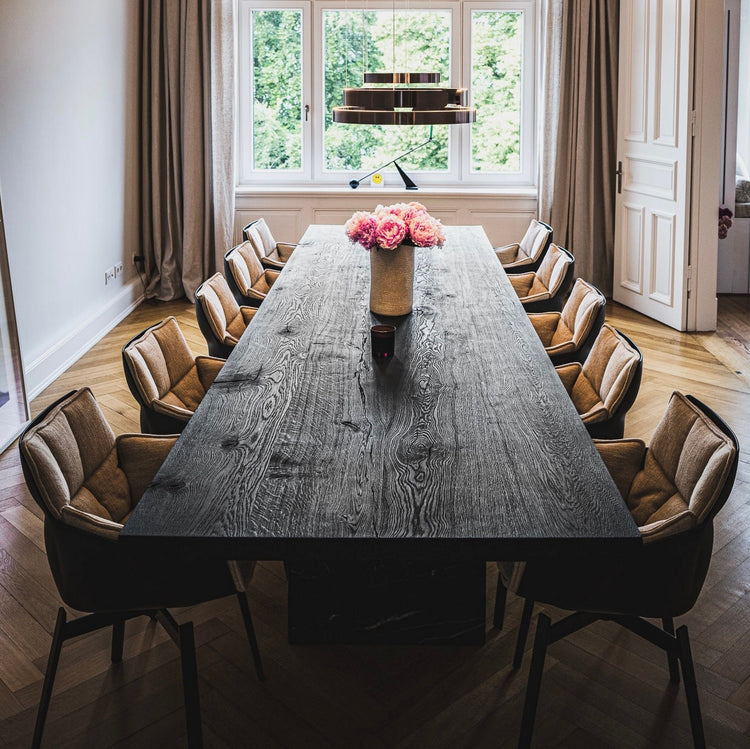 Jedes Stück wird individuell ausgewählt und in unserer Manufaktur mit Massivholz kombiniert. Das Ergebnis: Ein einzigartiges Spiel aus Schwere, Natürlichkeit und architektonischer Eleganz.