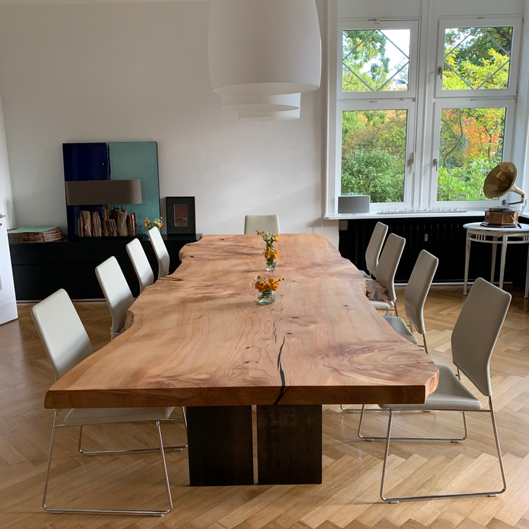 Wir fertigen deinen Tisch aus einer einzigen Baumscheibe – zugeschnitten, geschliffen und veredelt nach deinen Wünschen.