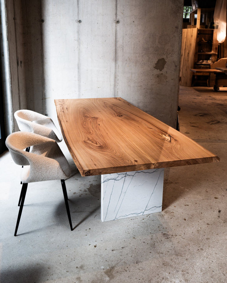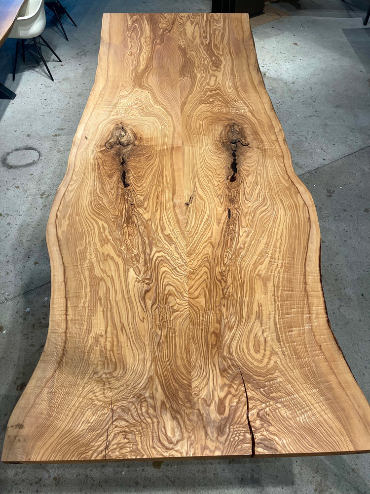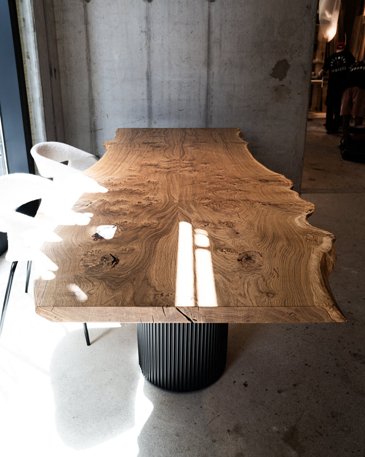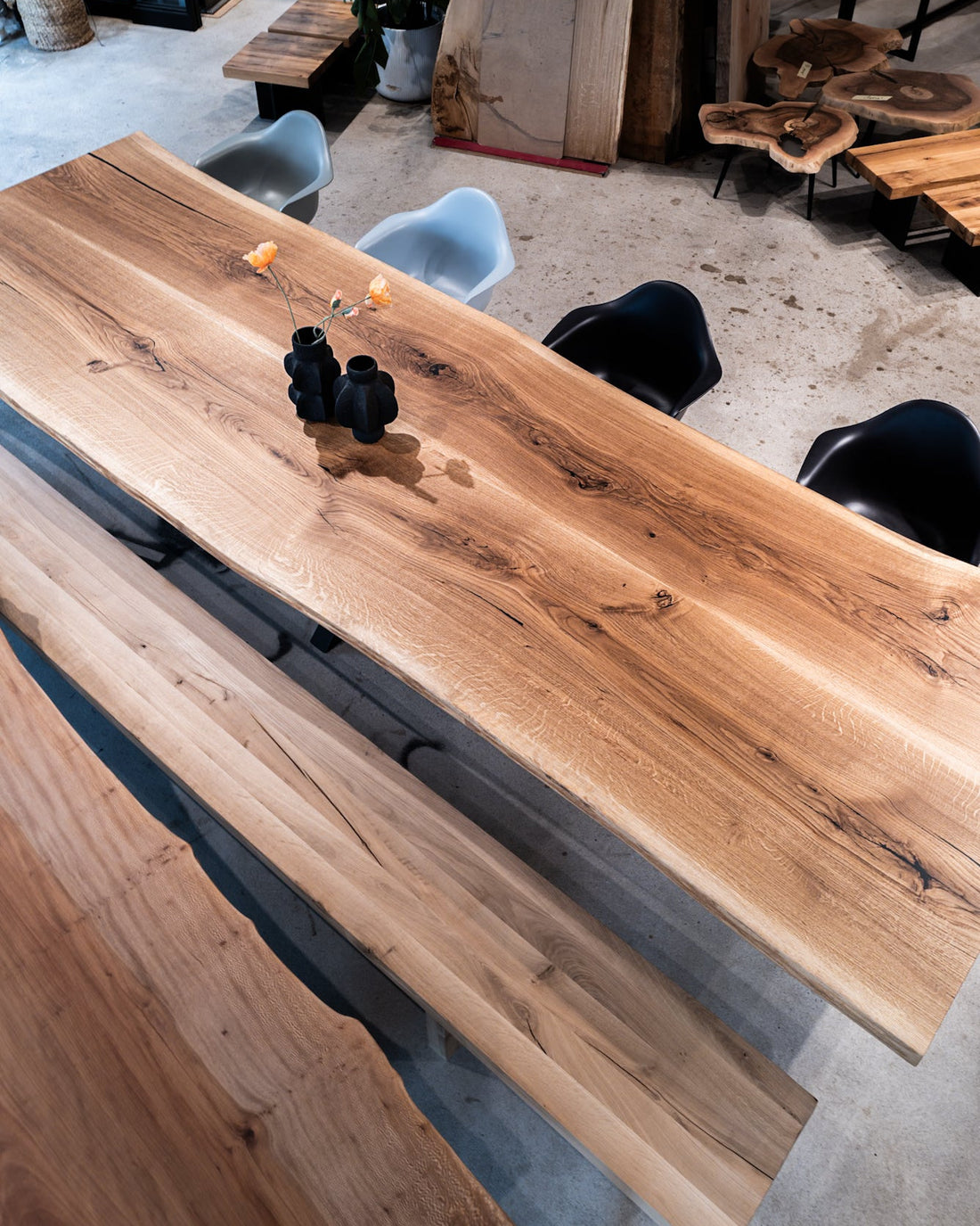 Alle Tische sind aus einem Stück gefertigt, ohne Leim, mit durchgehender Maserung – natürlich, kraftvoll, einzigartig.