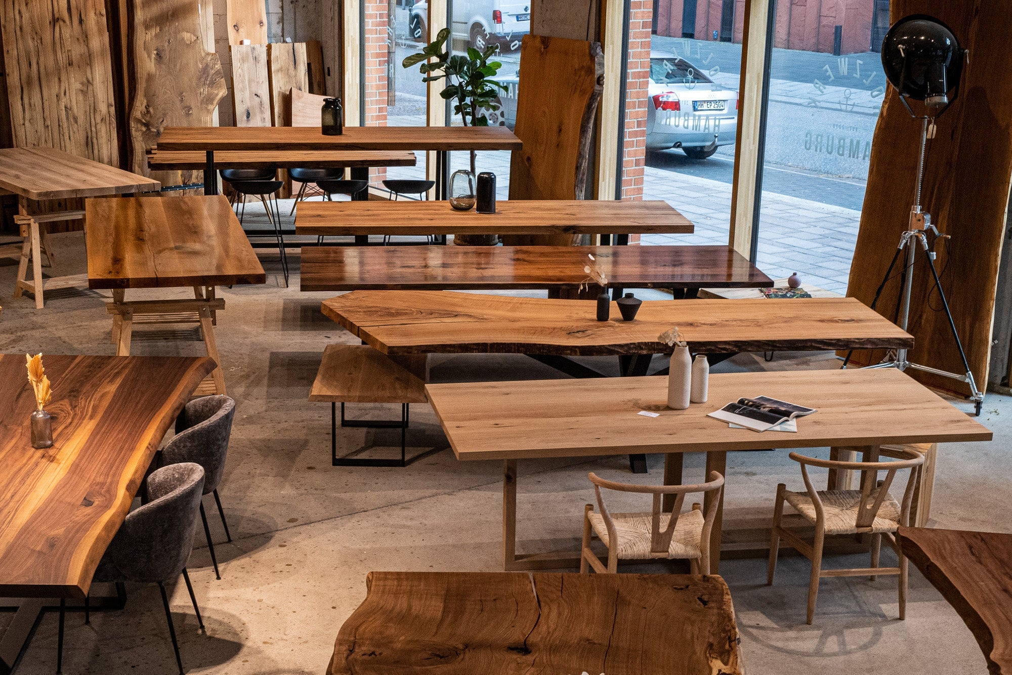 Besuche uns in Hamburg. Erlebe über 50 fertige Tische und mehr als 200 Unikat-Platten live. Wir beraten dich gemütlich bei einem Kaffee und finden gemeinsam dein neues Herzstück.