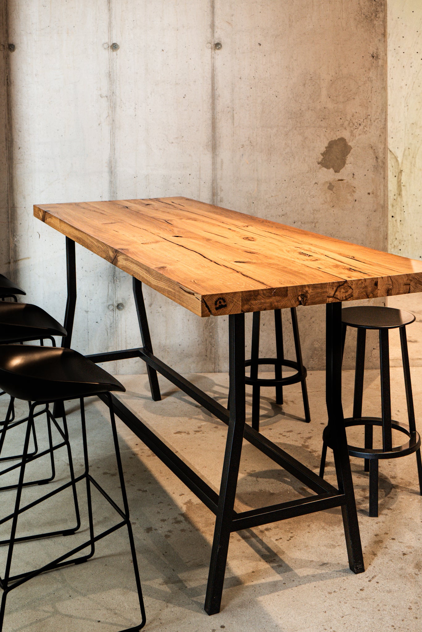 Dieser individuelle Hochtisch aus Massivholz überzeugt mit einer außergewöhnlichen Tischplatte aus massivem Altholz der Eiche. Die warme, leicht bräunliche Farbnuance in Kombination mit markanten Ästen und natürlichen Rissen verleiht jedem Stück eine charakterstarke, individuelle Ausstrahlung – jedes Exemplar ist ein echtes Unikat mit natürlichem Charme.