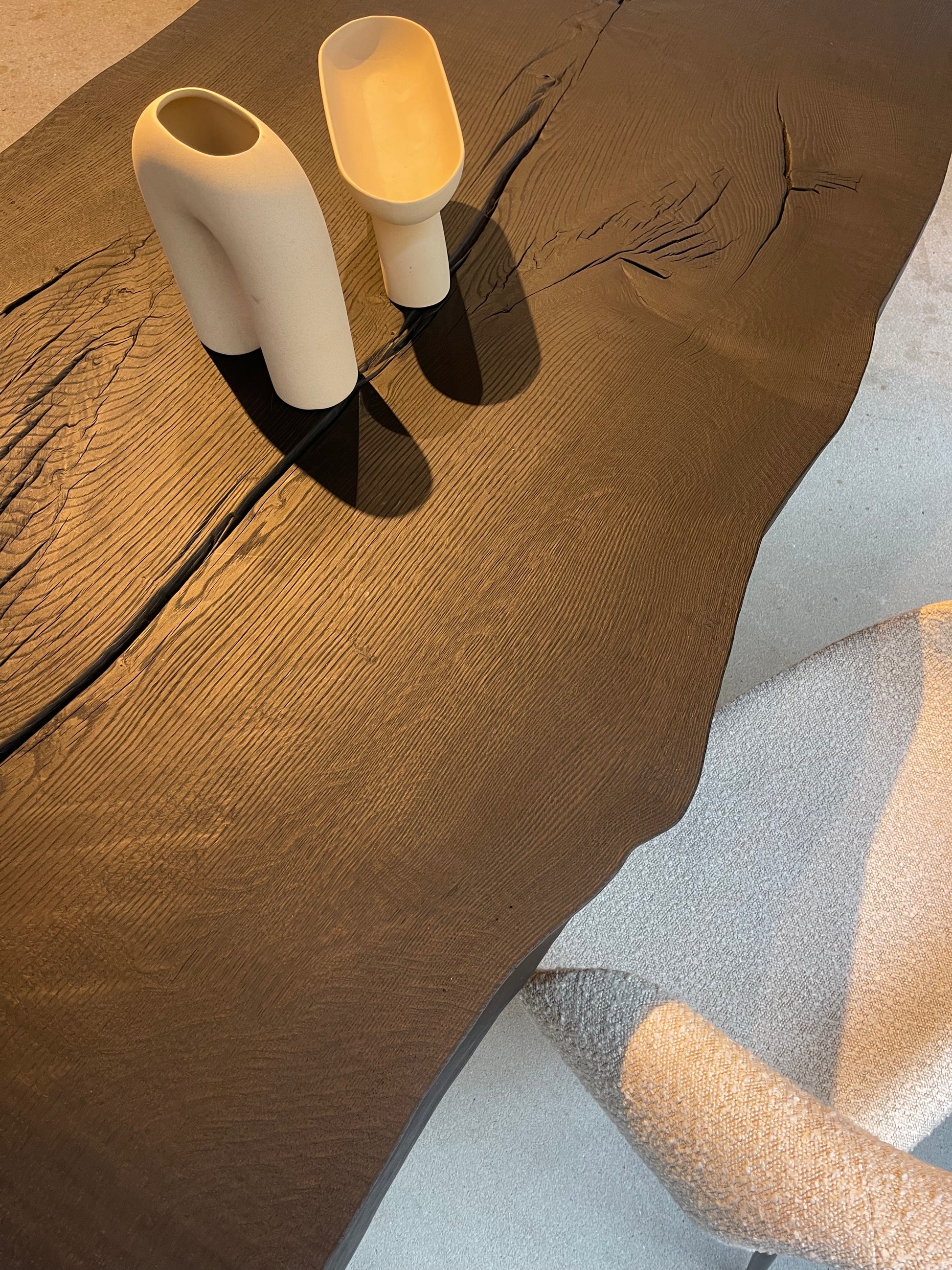Esstisch Unikat aus einem Stück Eichenholz mit schwarz geköhlter Oberfläche