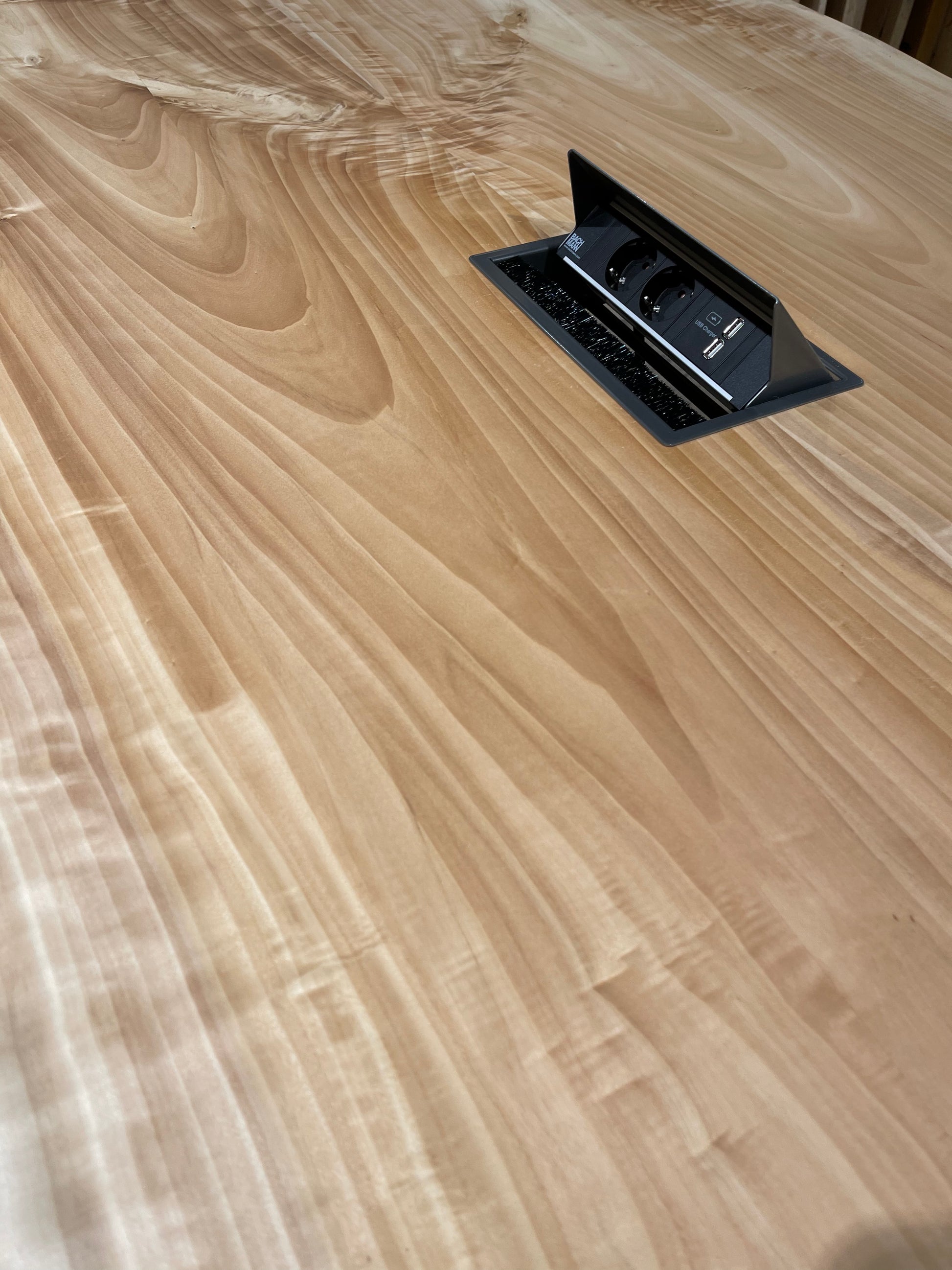 Ein hochwertiger Konferenztisch, der durch seine präzise Verarbeitung, technische Ausstattung und beeindruckende Holzmaserung überzeugt.