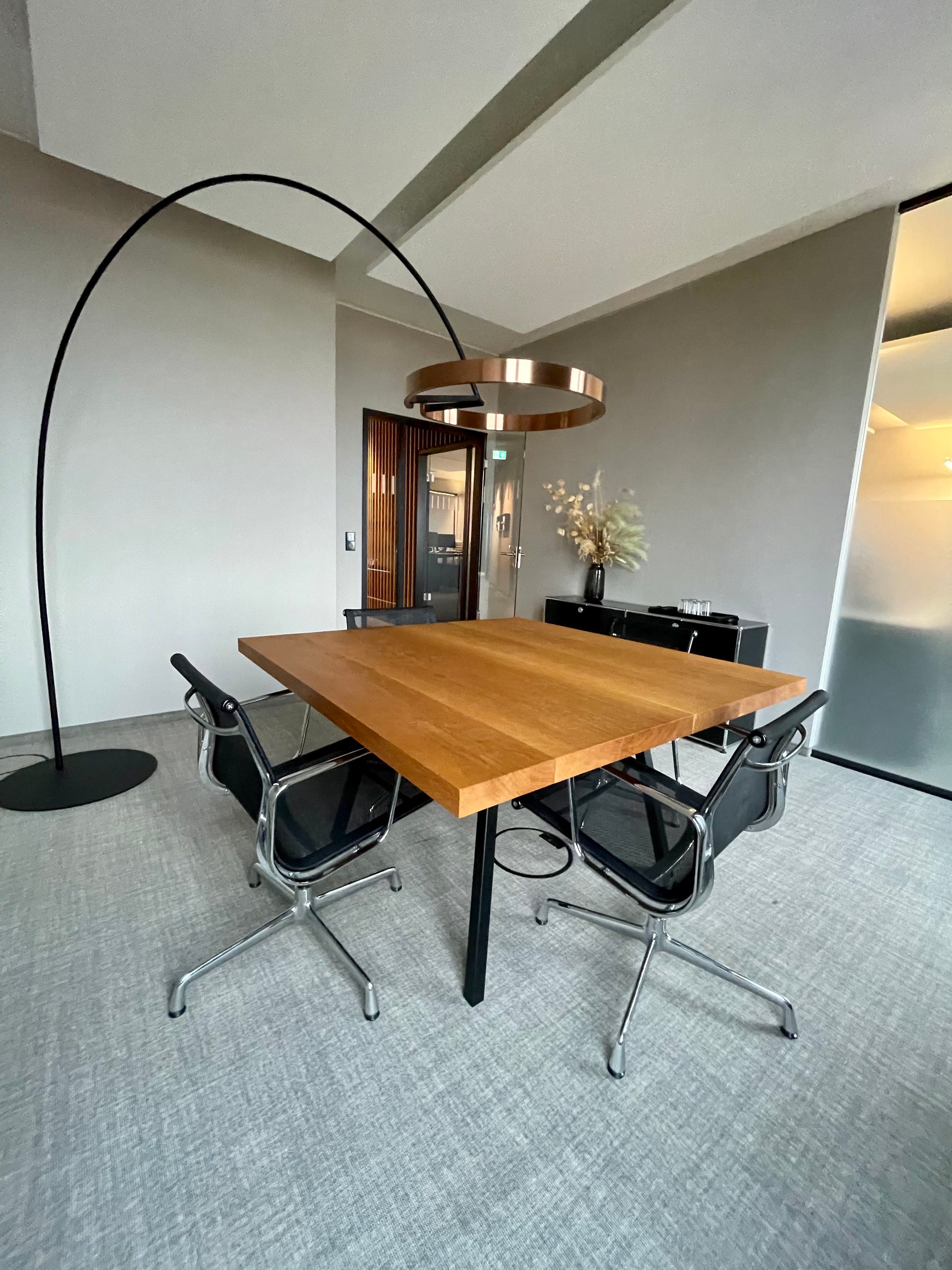 Dieser Konferenztisch wird nach Maß gefertigt. Neben den Standardgrößen können individuelle Anpassungen in Größe, Holzart und Gestellform vorgenommen werden.