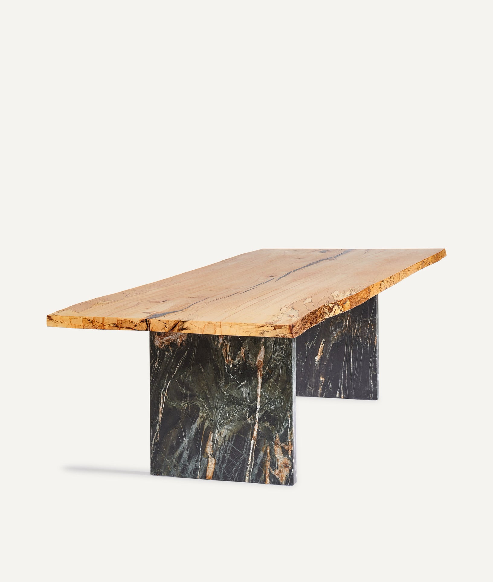Aussergewöhnlicher Massivholztisch aus gestockter Buche mit einem Tischgestell aus Mamor