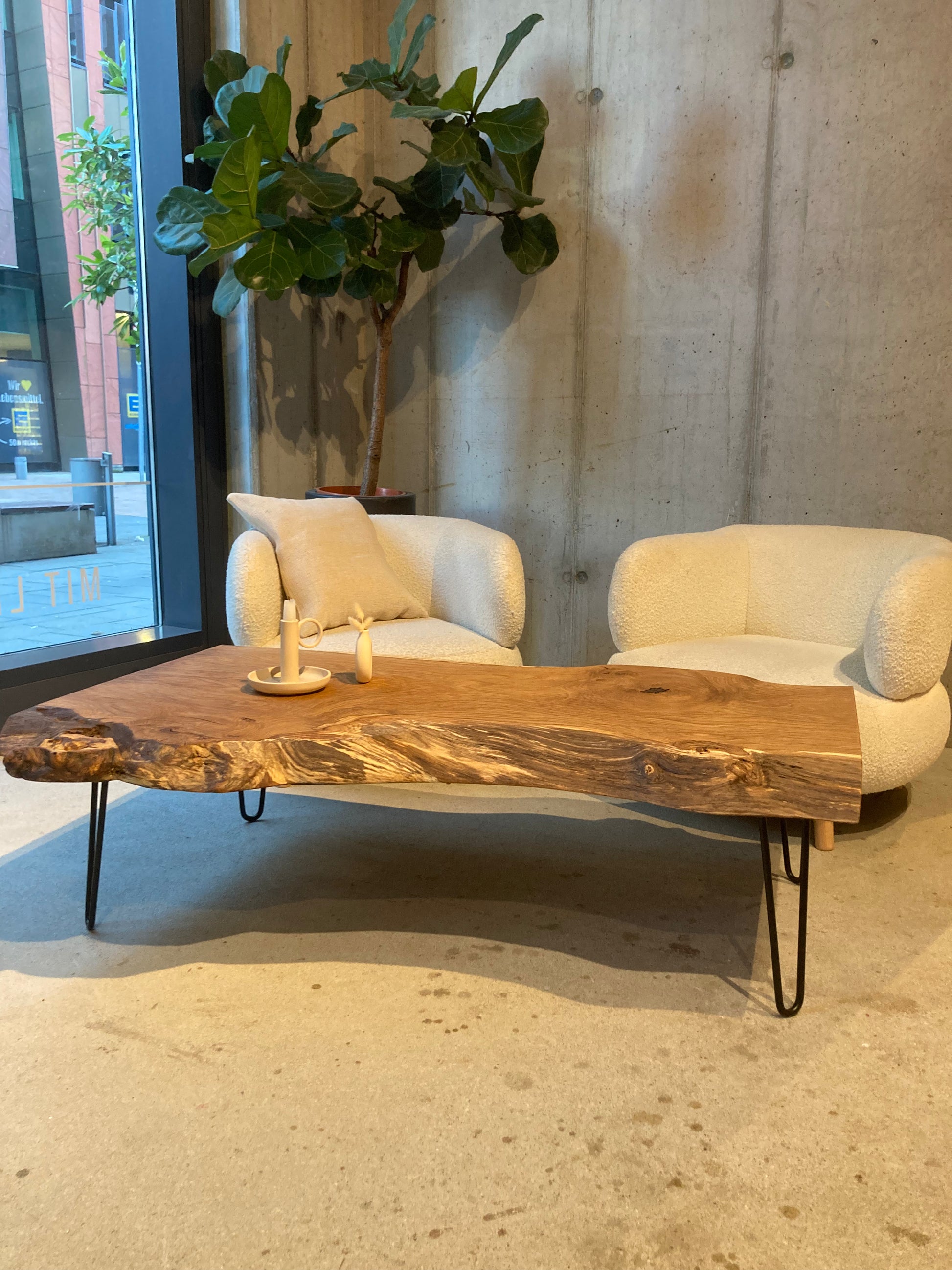 Das filigrane, schwarz pulverbeschichtete Metallgestell bildet einen stilvollen Kontrast zur rustikalen Holzplatte. Durch seine dezente Optik harmoniert es perfekt mit der organischen Form der Naturkante. Alternativ sind weitere Gestellvarianten oder Anpassungen der Höhe möglich.