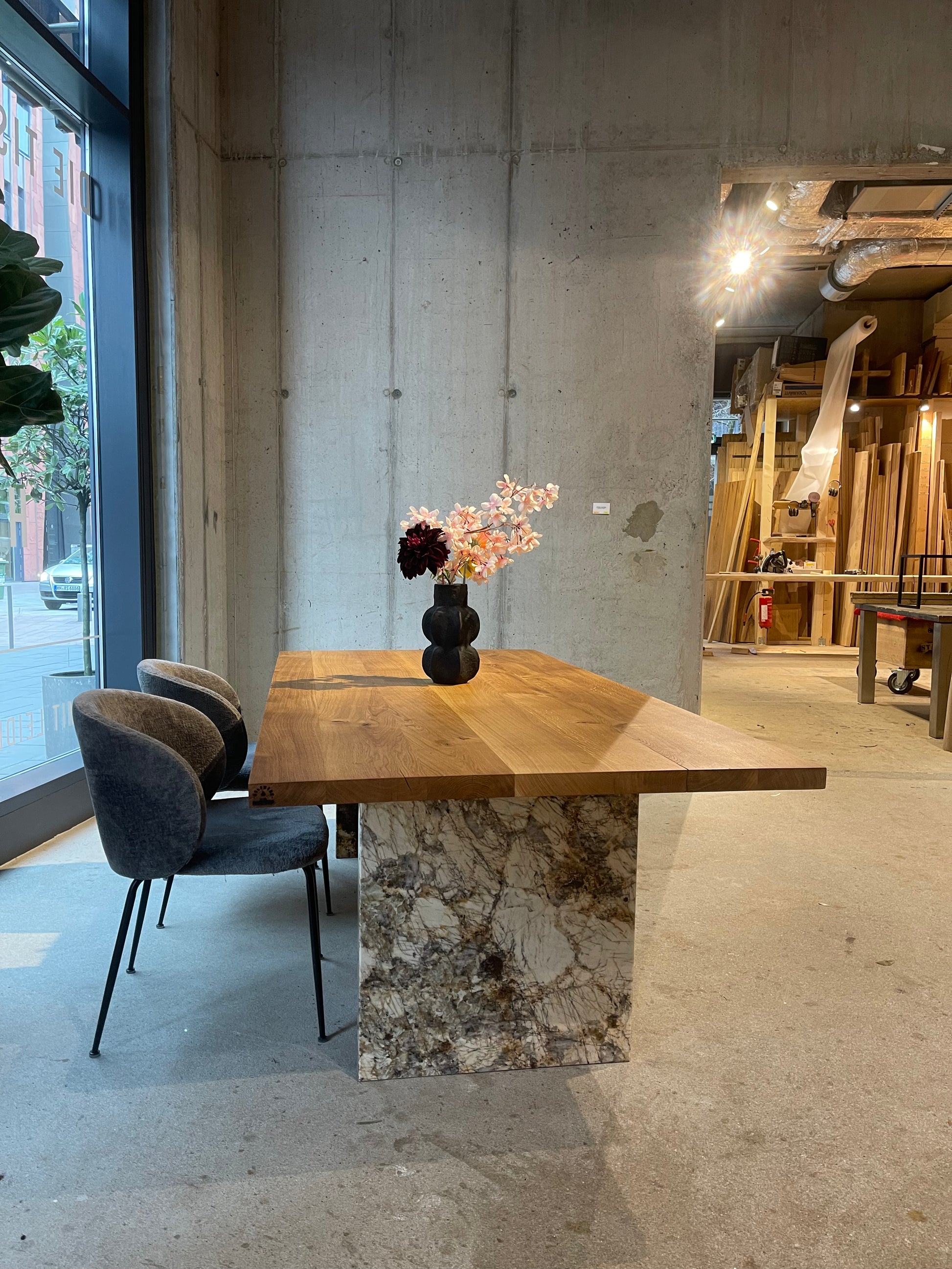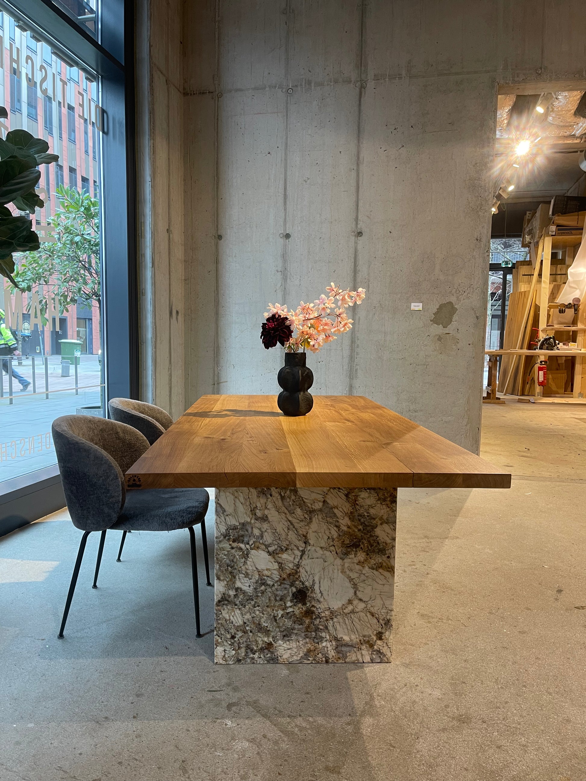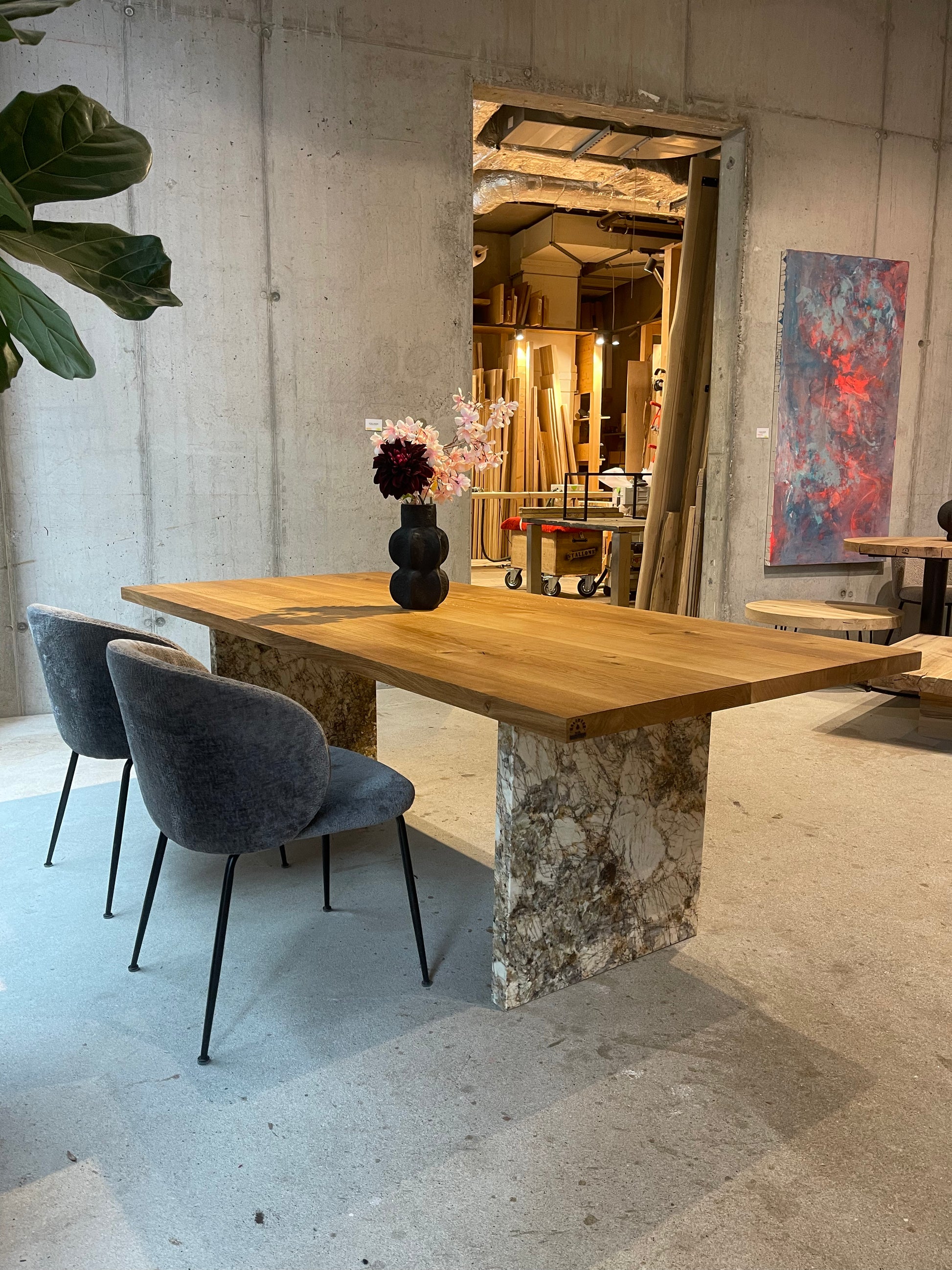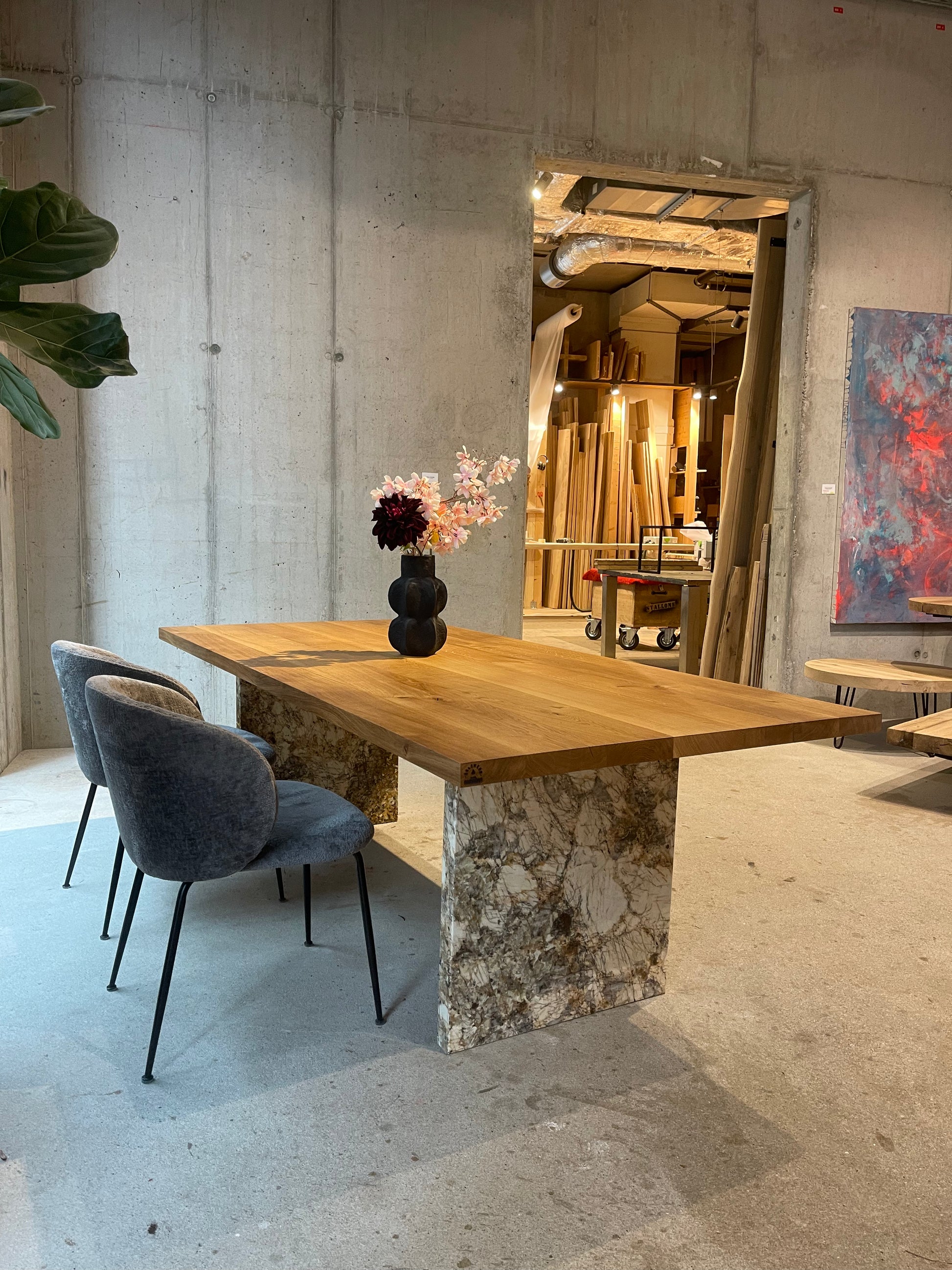 Erleben Sie den einzigartigen Materialmix aus hochwertigem Eichenholz und edlem Naturstein in unserem außergewöhnlichen Massivholztisch. Dieser Tisch vereint die natürliche Schönheit von Holz mit der Robustheit von Stein und schafft so ein beeindruckendes Design-Statement für jedes Zuhause.