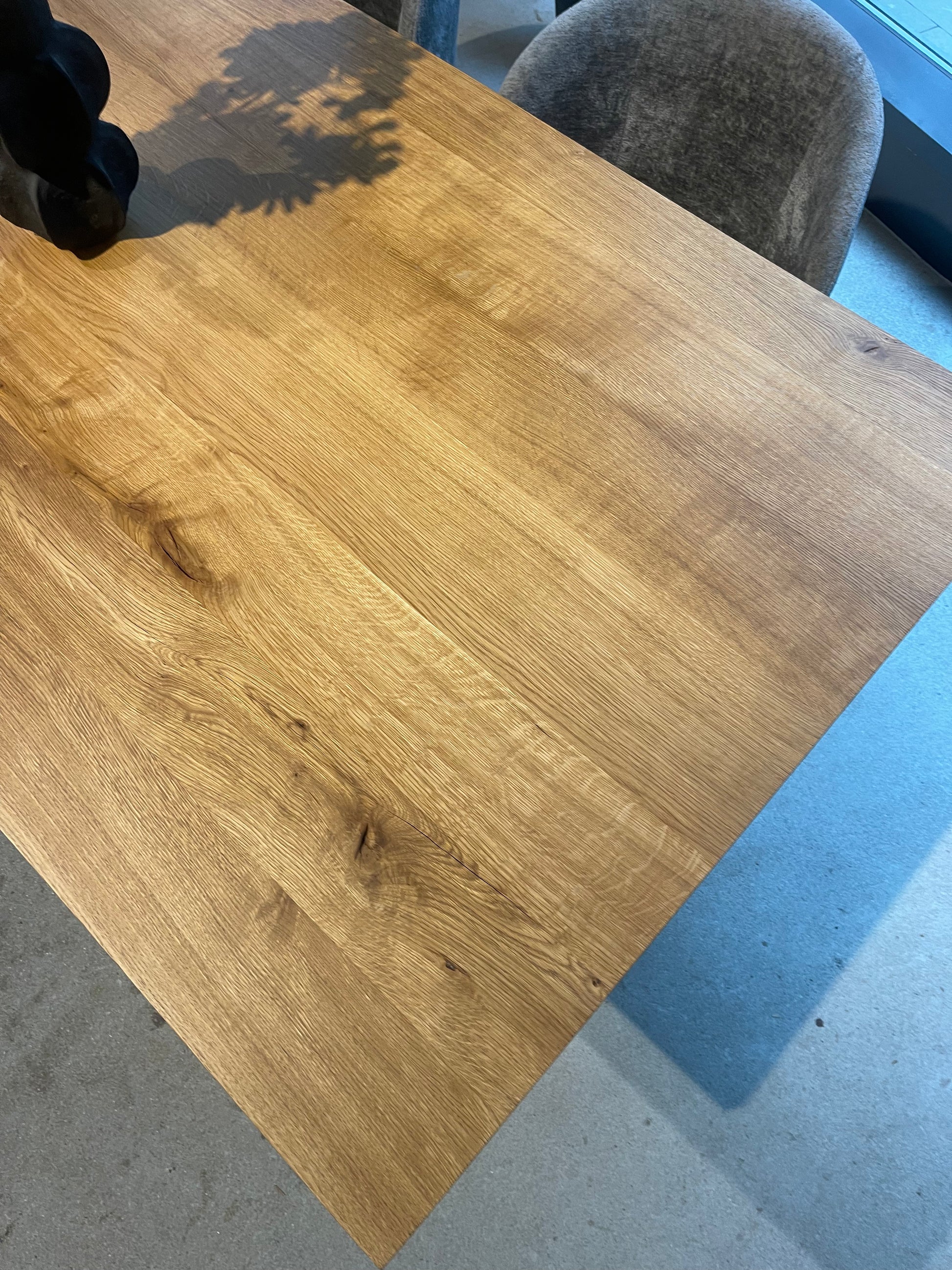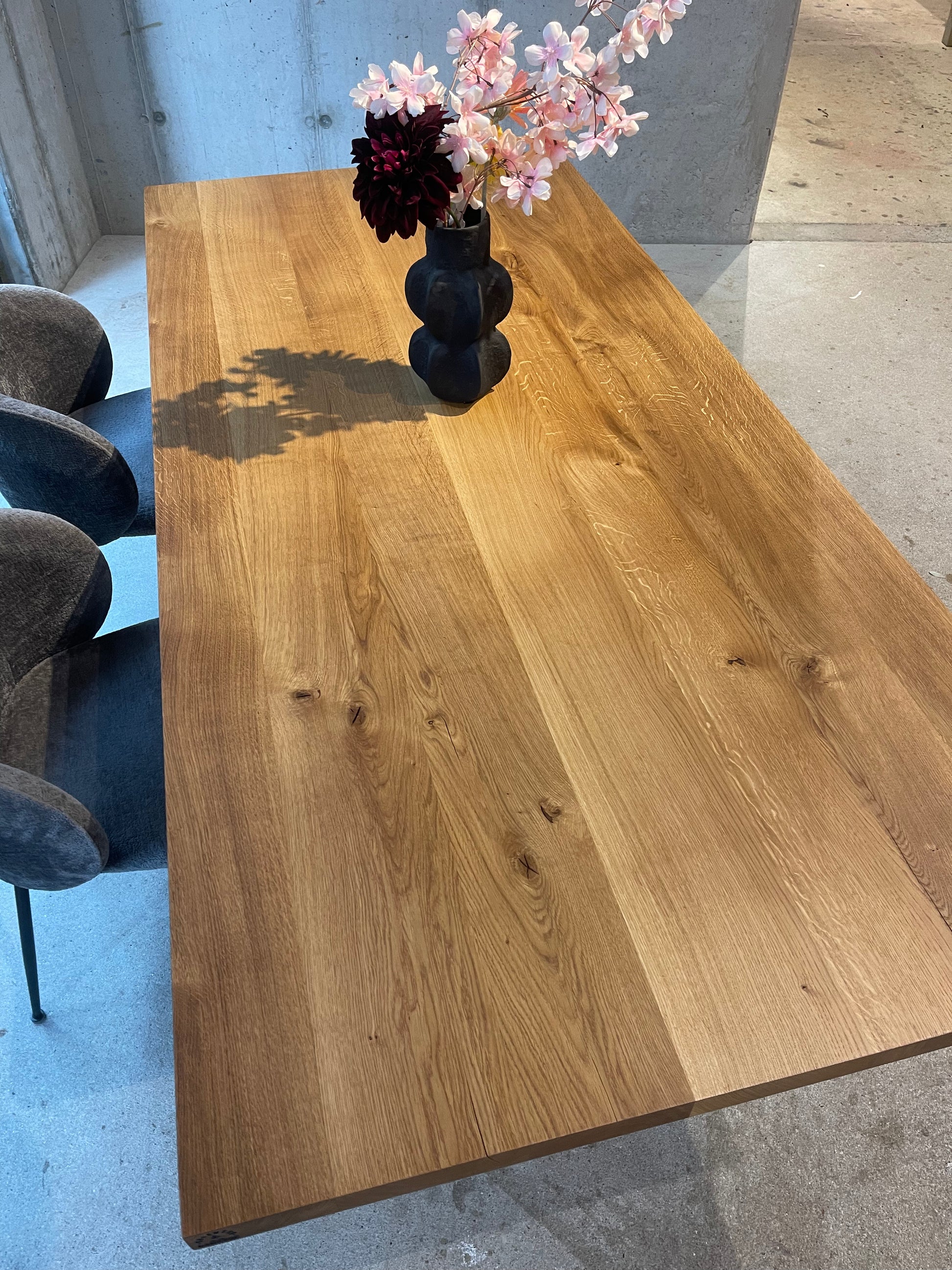 - Eichenholz-Tischplatte: Die sorgfältig ausgewählte Eiche bietet eine warme, einladende Ausstrahlung und betont die natürliche Maserung, die jeden Tisch zu einem Unikat macht. Plattenstärke 4cm, Oberfläche natürlich geölt und gewachst