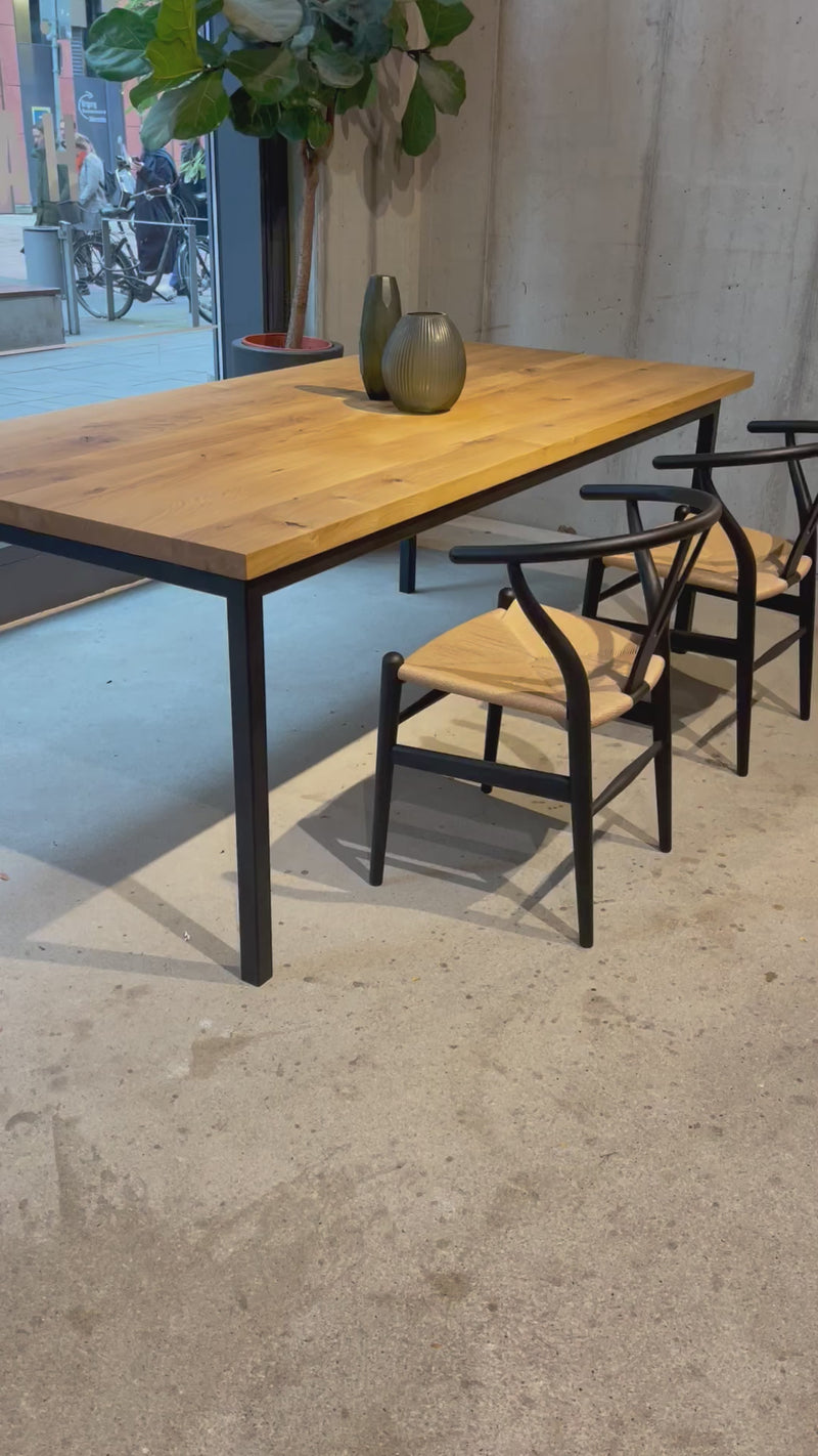 Dieser wunderschöne Esstisch aus massivem Eichenholz überzeugt mit seiner natürlichen Optik und hochwertigen Verarbeitung. Die Kombination aus massiver Holzplatte und einem stabilen Metallgestell verleiht dem Tisch eine harmonische Balance zwischen rustikaler Wärme und modernem Design.
