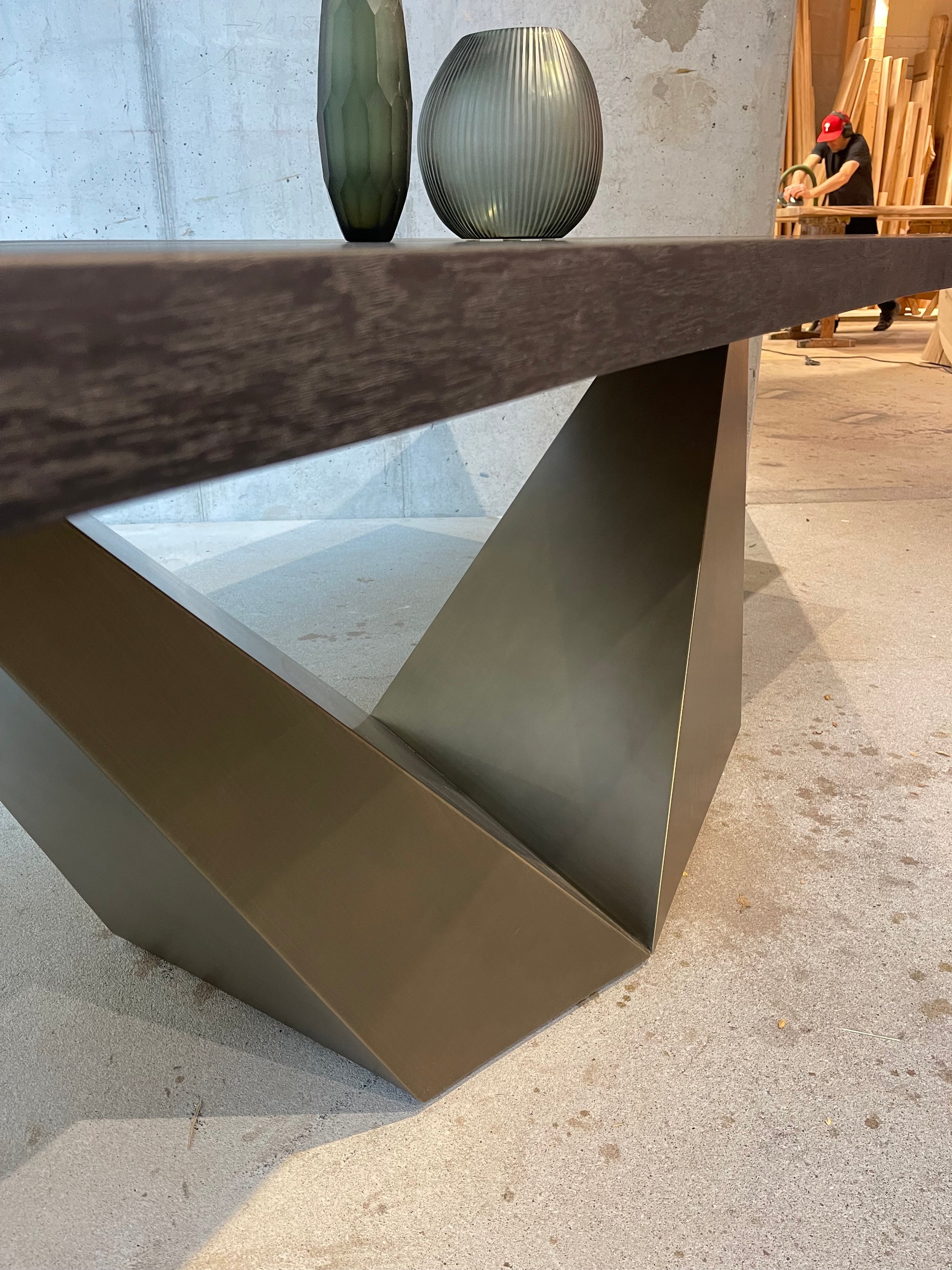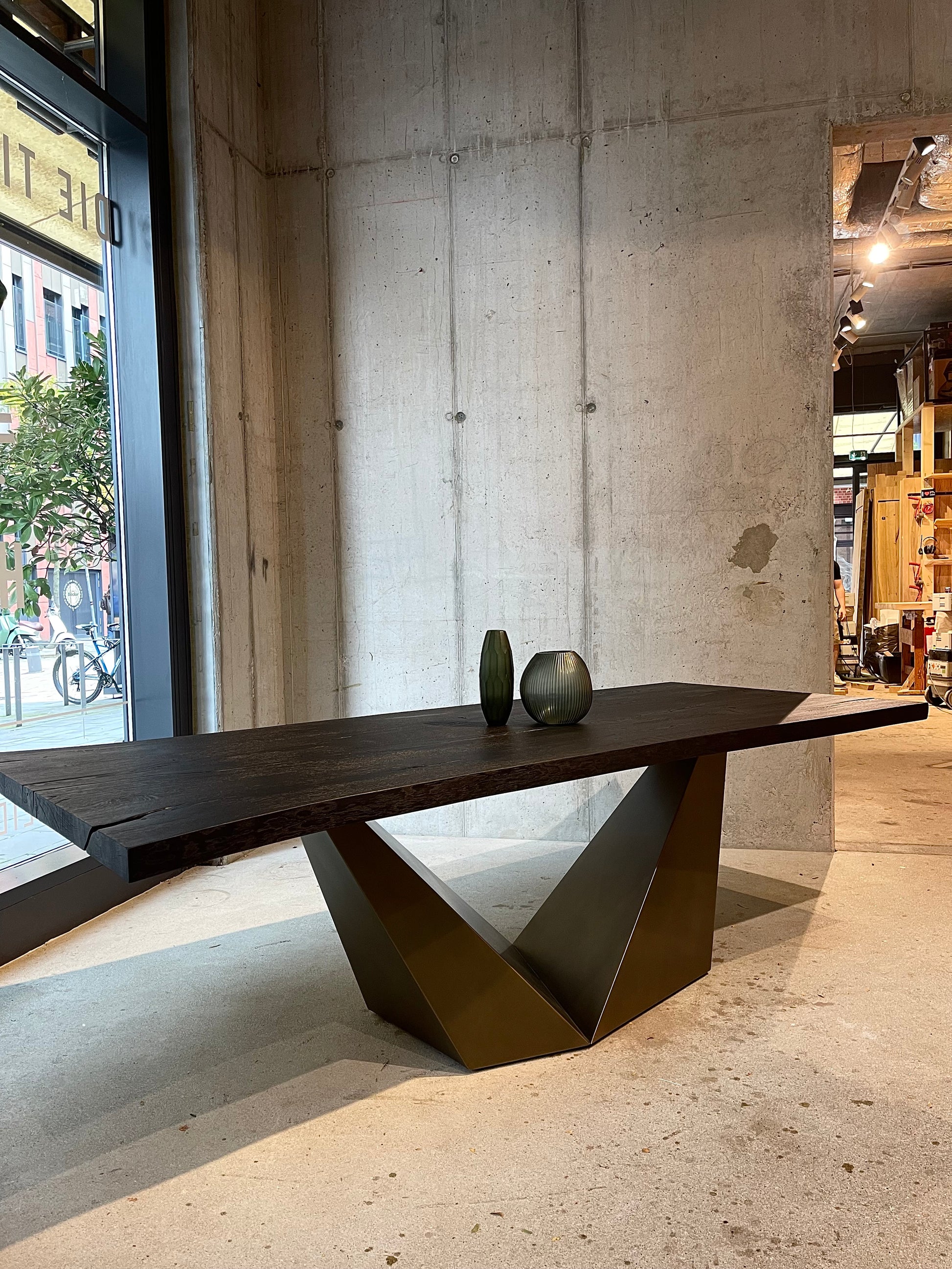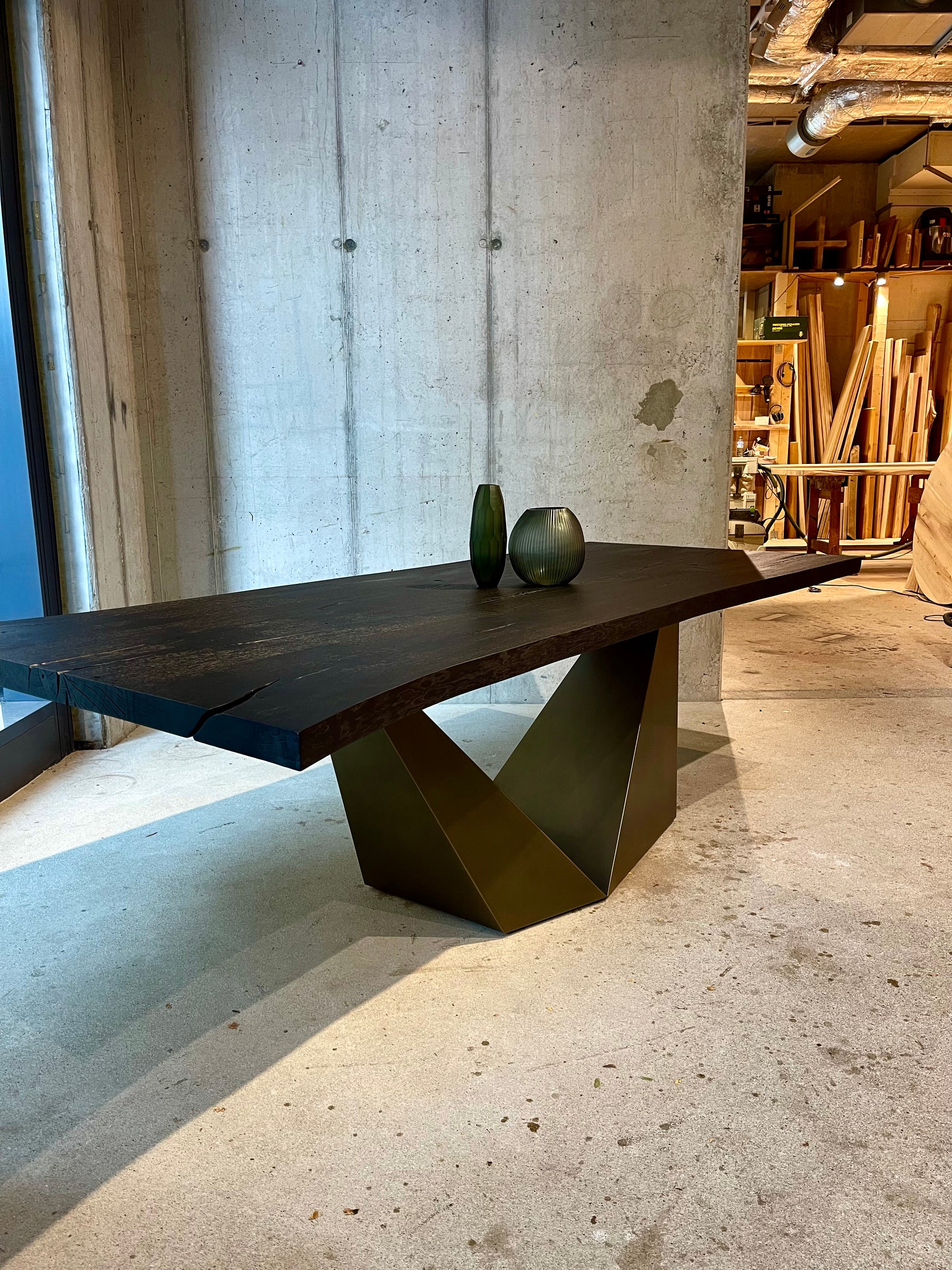 Das Tischgestell ist individuell angefertigt und keine Katalogware. Wir passen jedes Gestell genau an die Form und Stärke der Tischplatte an. Dieses Modell steht auf einem mittigen Stern-Gestell aus Metall im Profil 60x60mm, das mit einer schwarzen Pulverbeschichtung veredelt wurde. Das Design bietet maximale Beinfreiheit und lässt den Tisch wie eine Skulptur im Raum wirken.