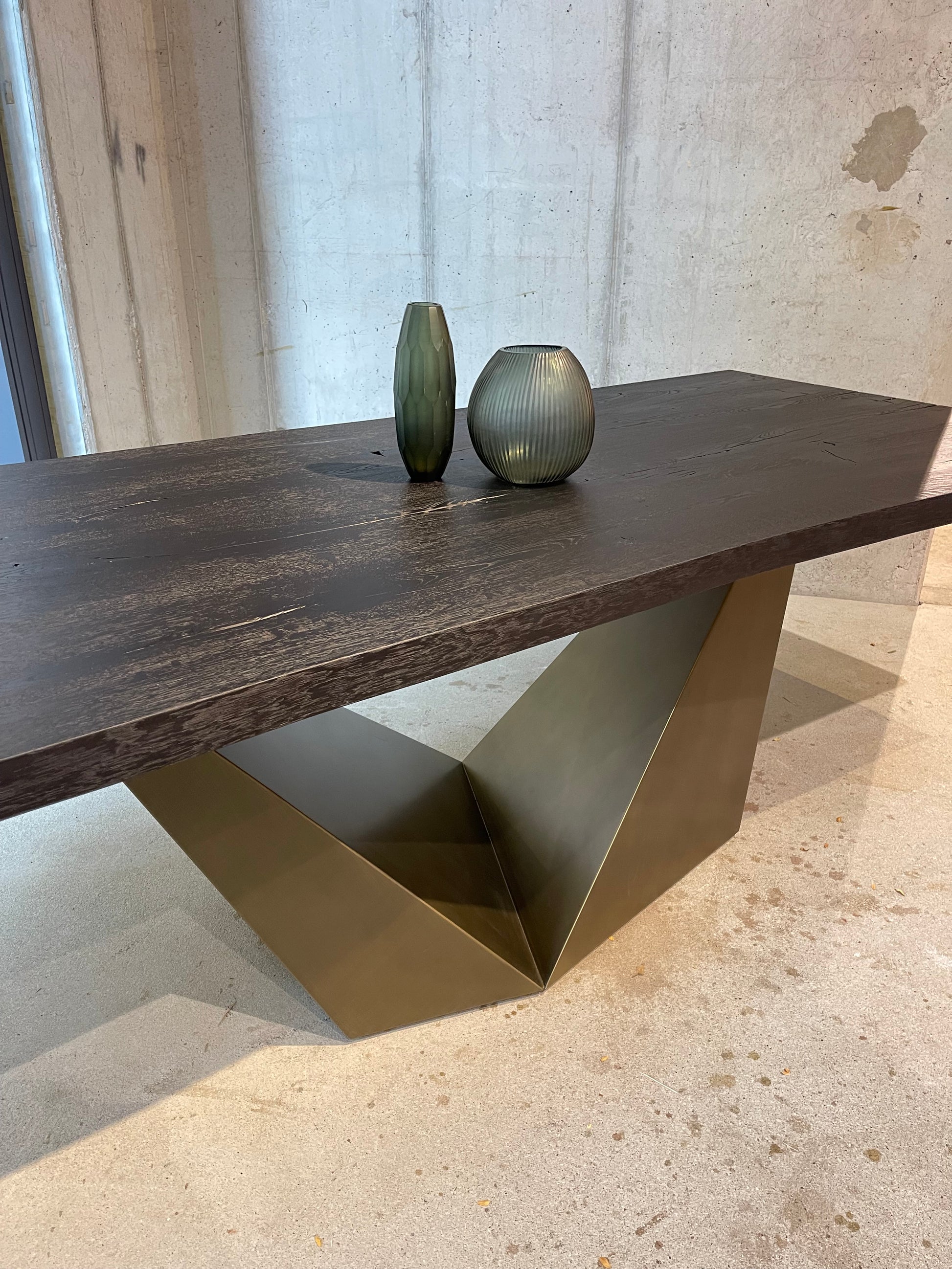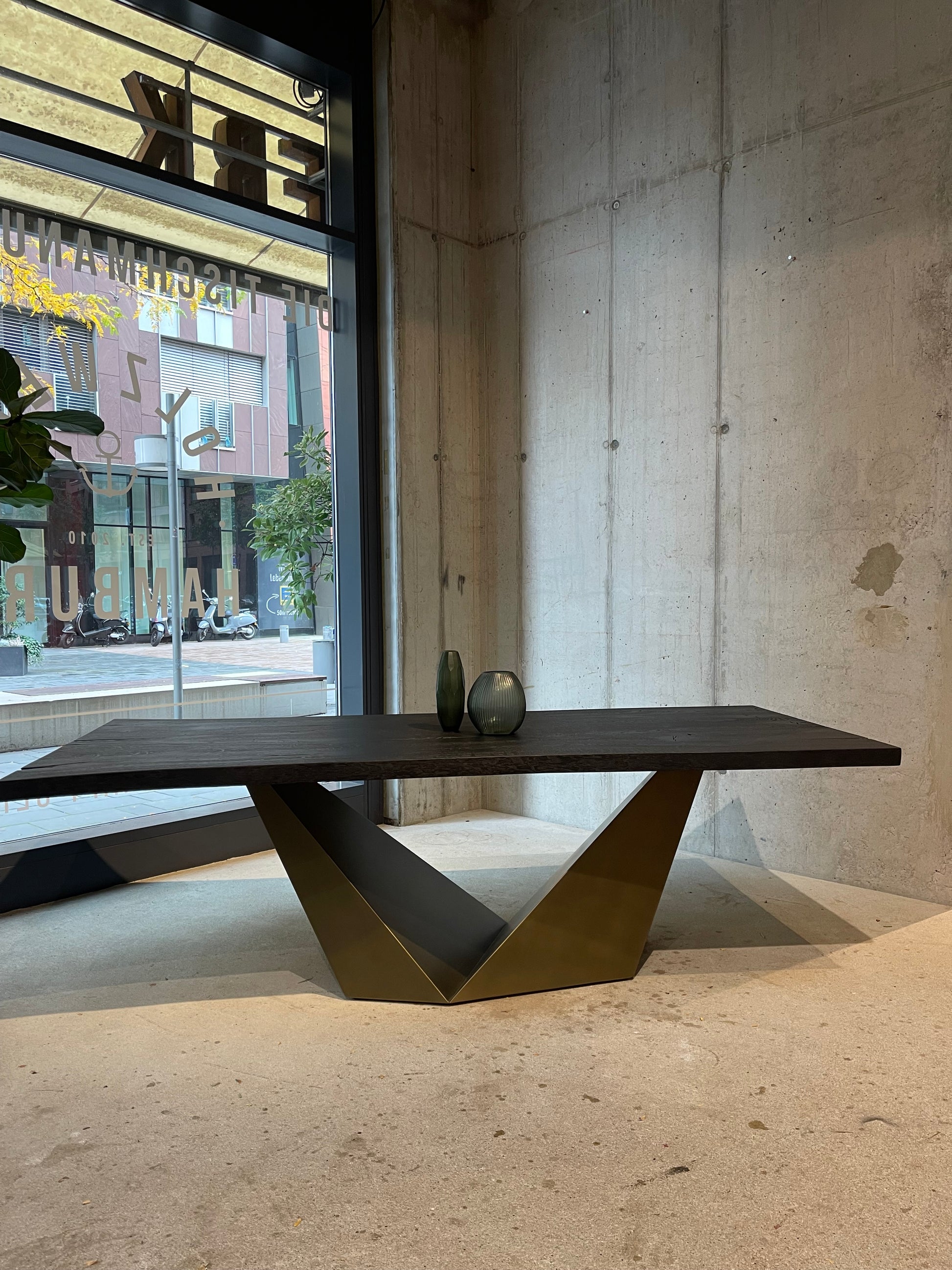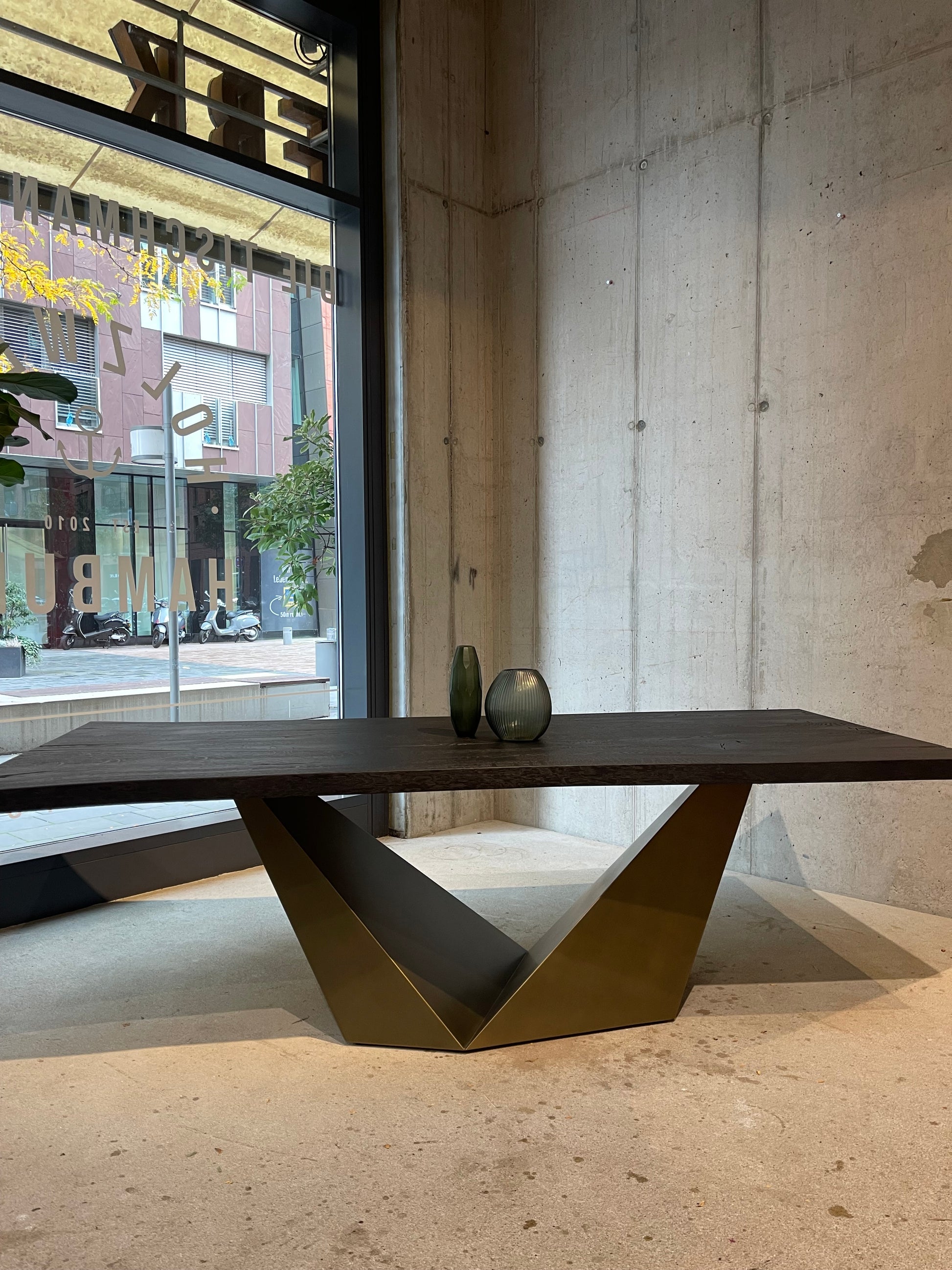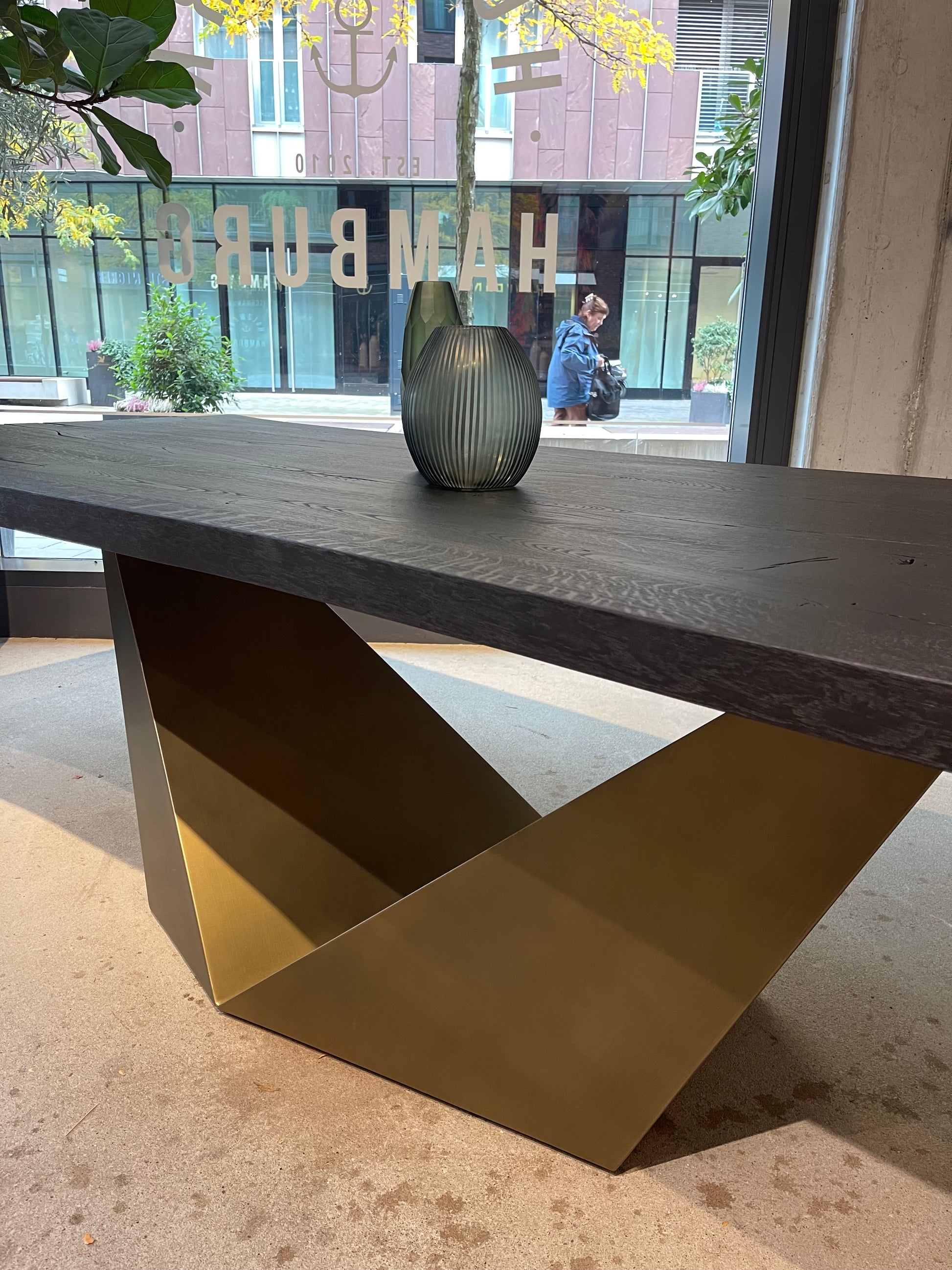 Das Tischgestell ist individuell angefertigt und keine Katalogware. Wir passen jedes Gestell genau an die Form und Stärke der Tischplatte an. Dieses Modell steht auf einem mittigen Stern-Gestell aus Metall im Profil 60x60mm, das mit einer schwarzen Pulverbeschichtung veredelt wurde. Das Design bietet maximale Beinfreiheit und lässt den Tisch wie eine Skulptur im Raum wirken.