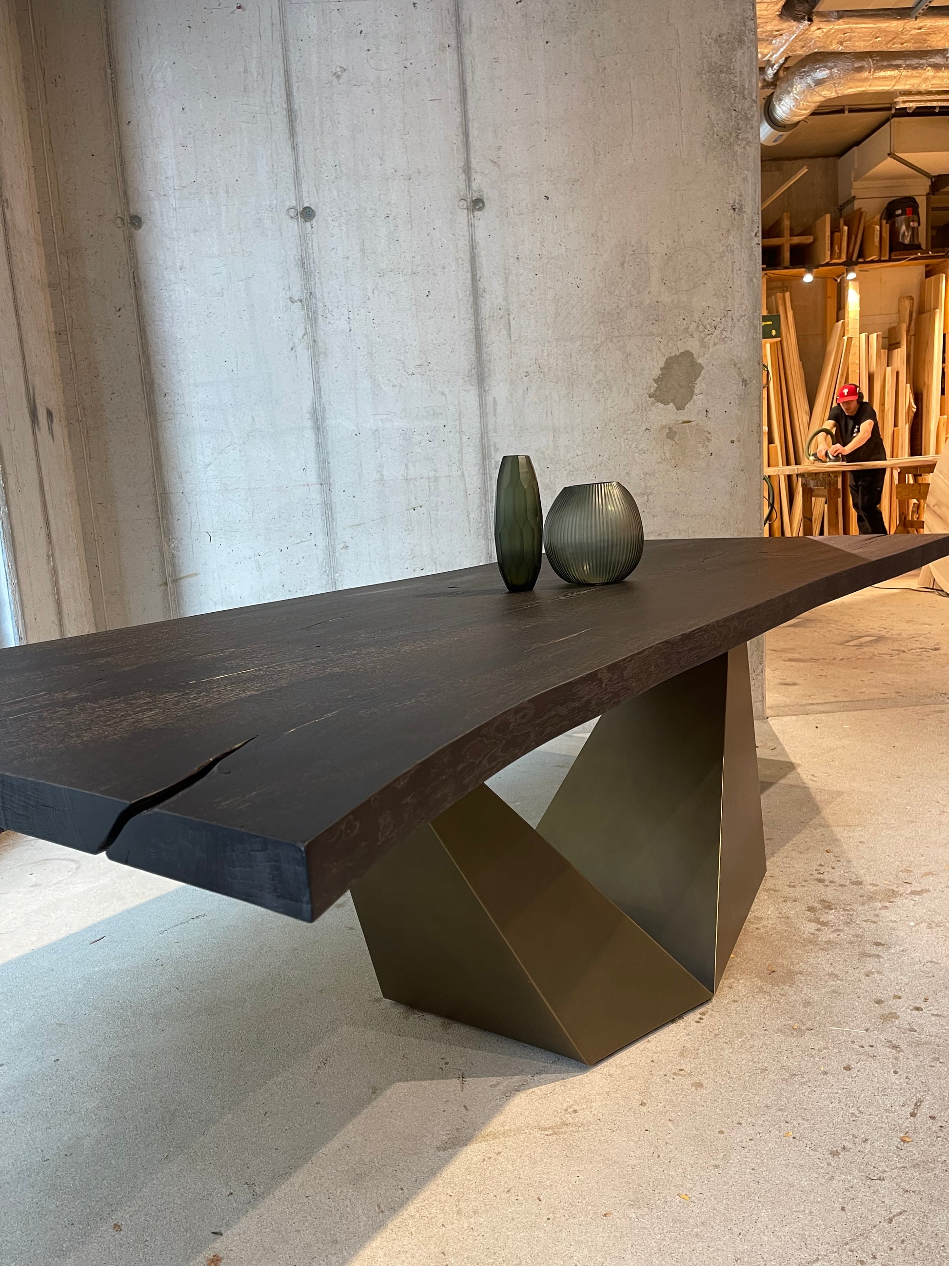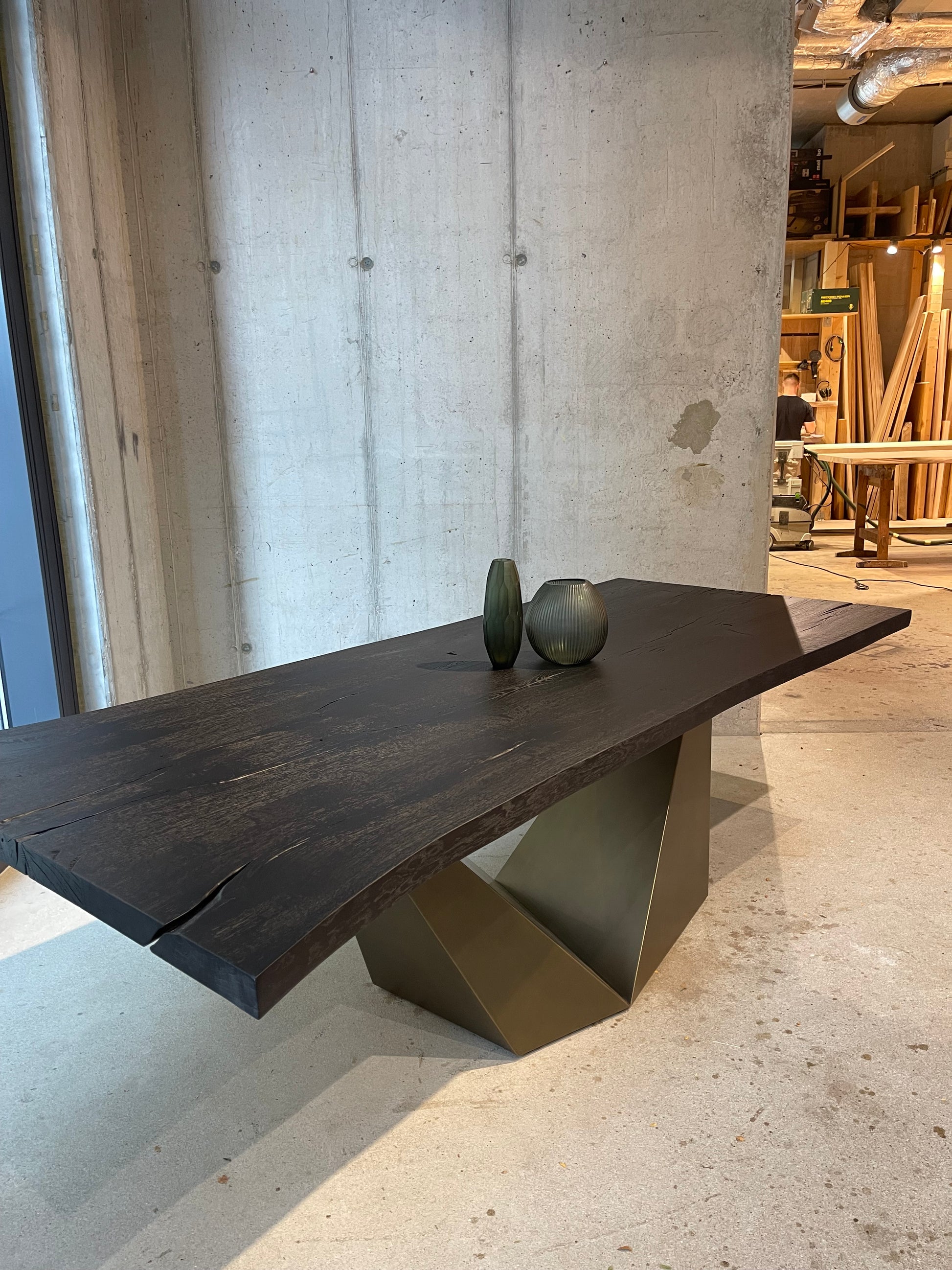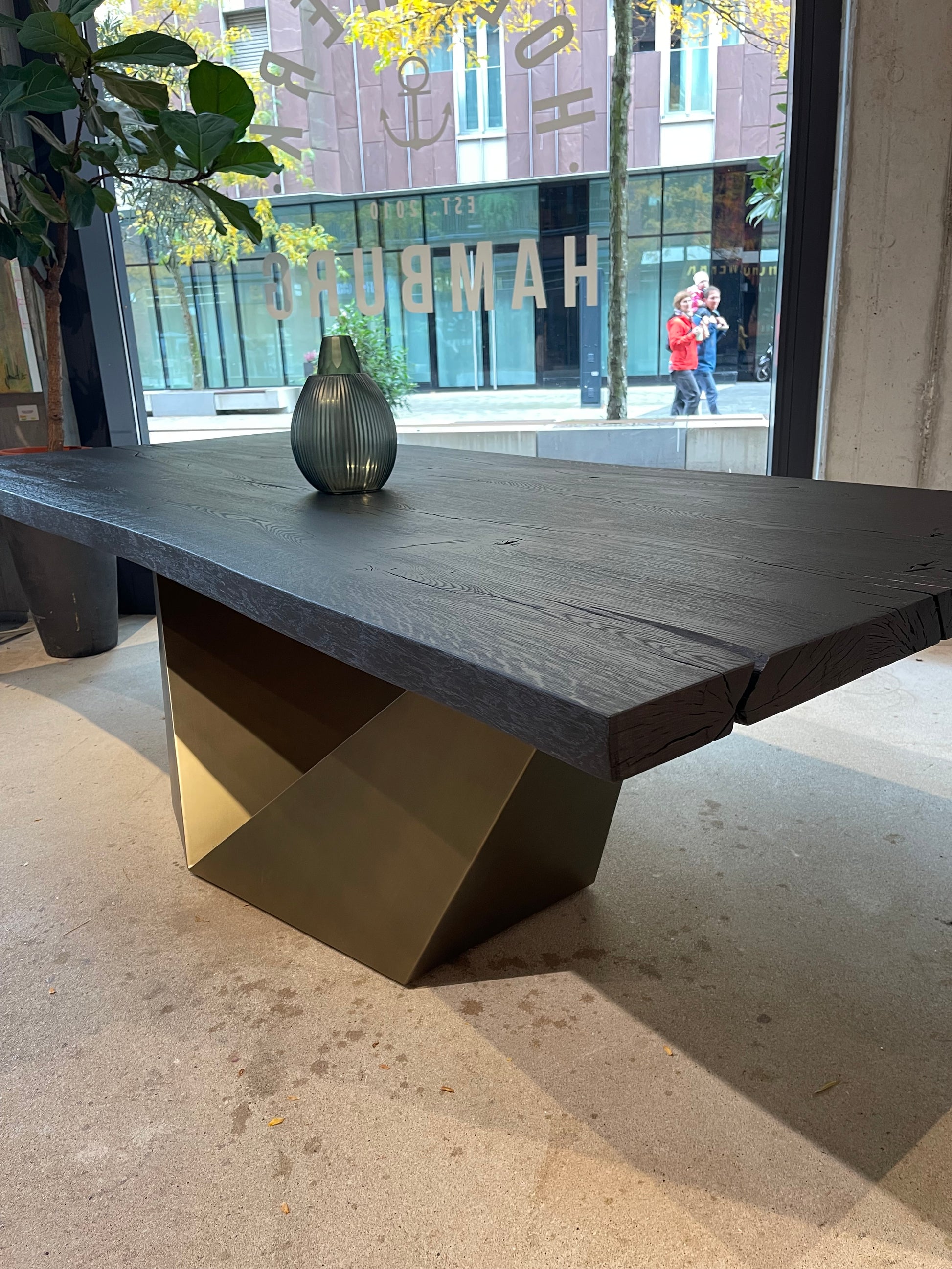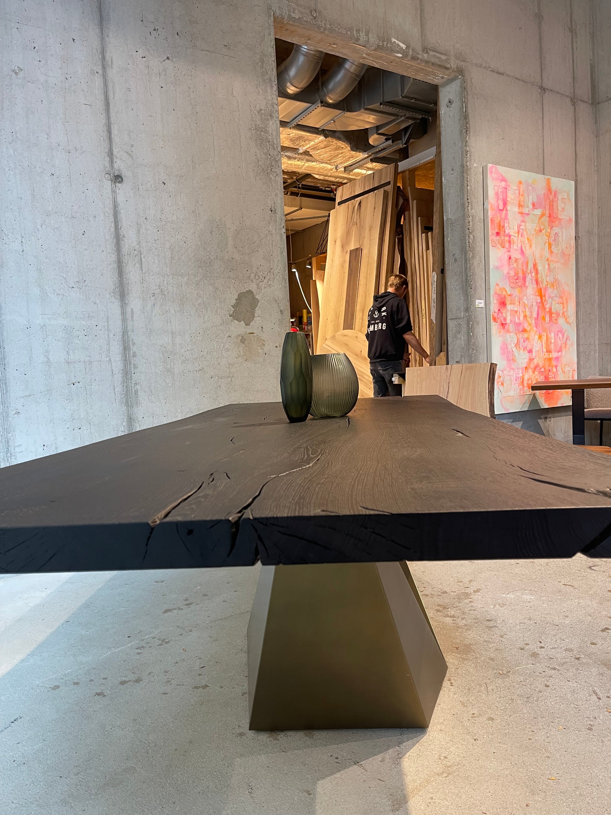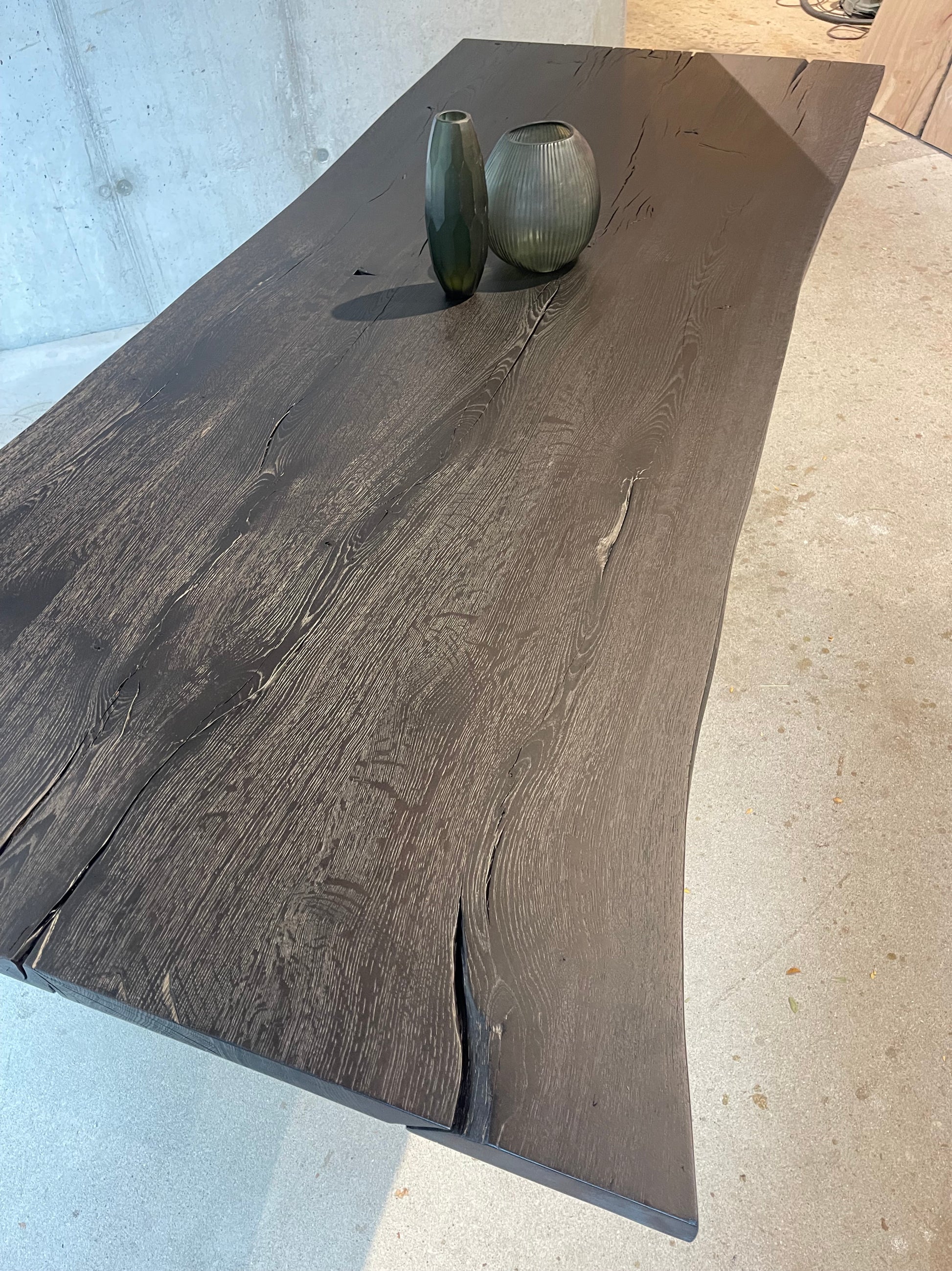 Schwarzer Esstisch aus geköhltem Eichenholz mit natürlicher Baumkante nach Maß