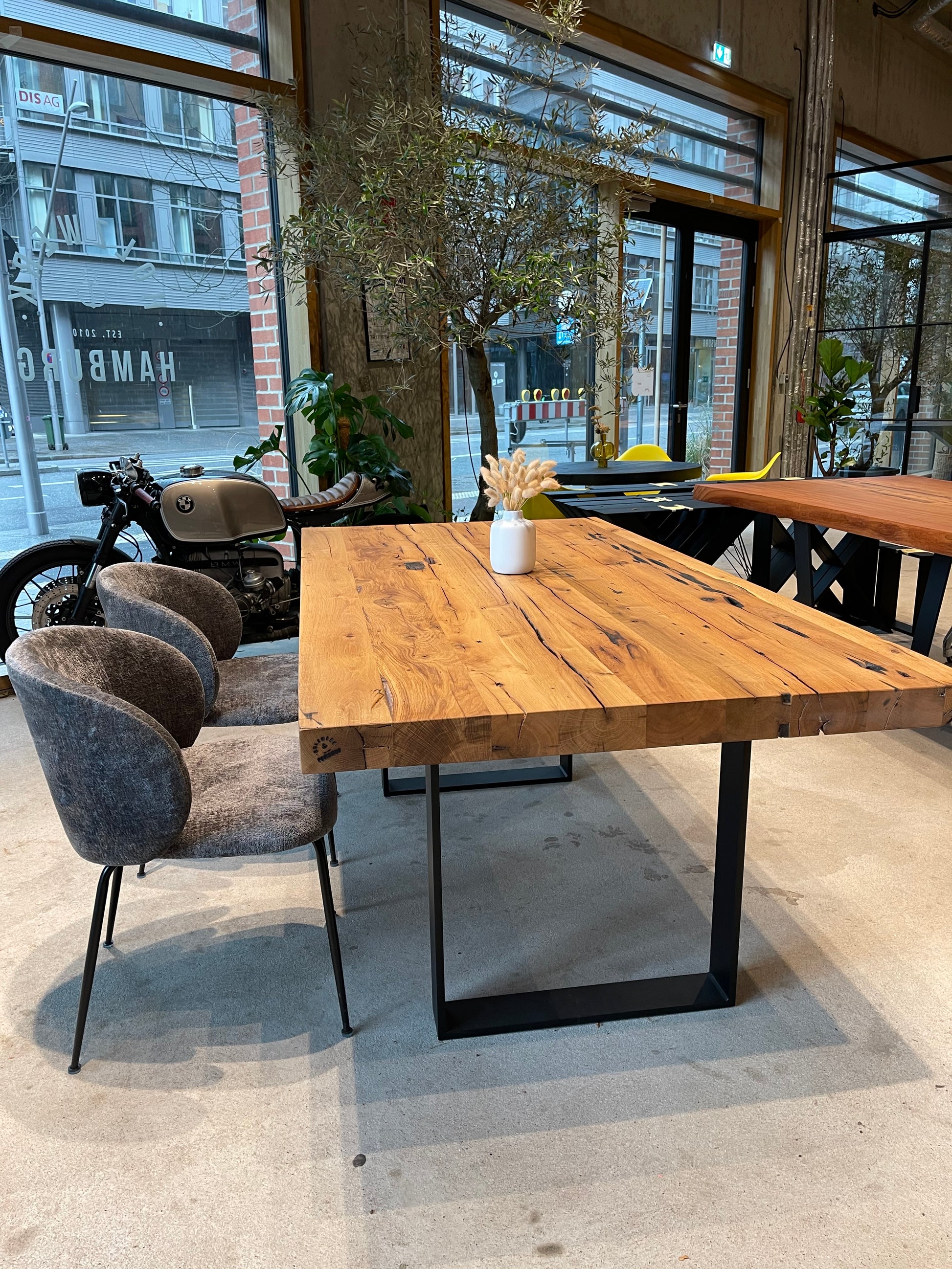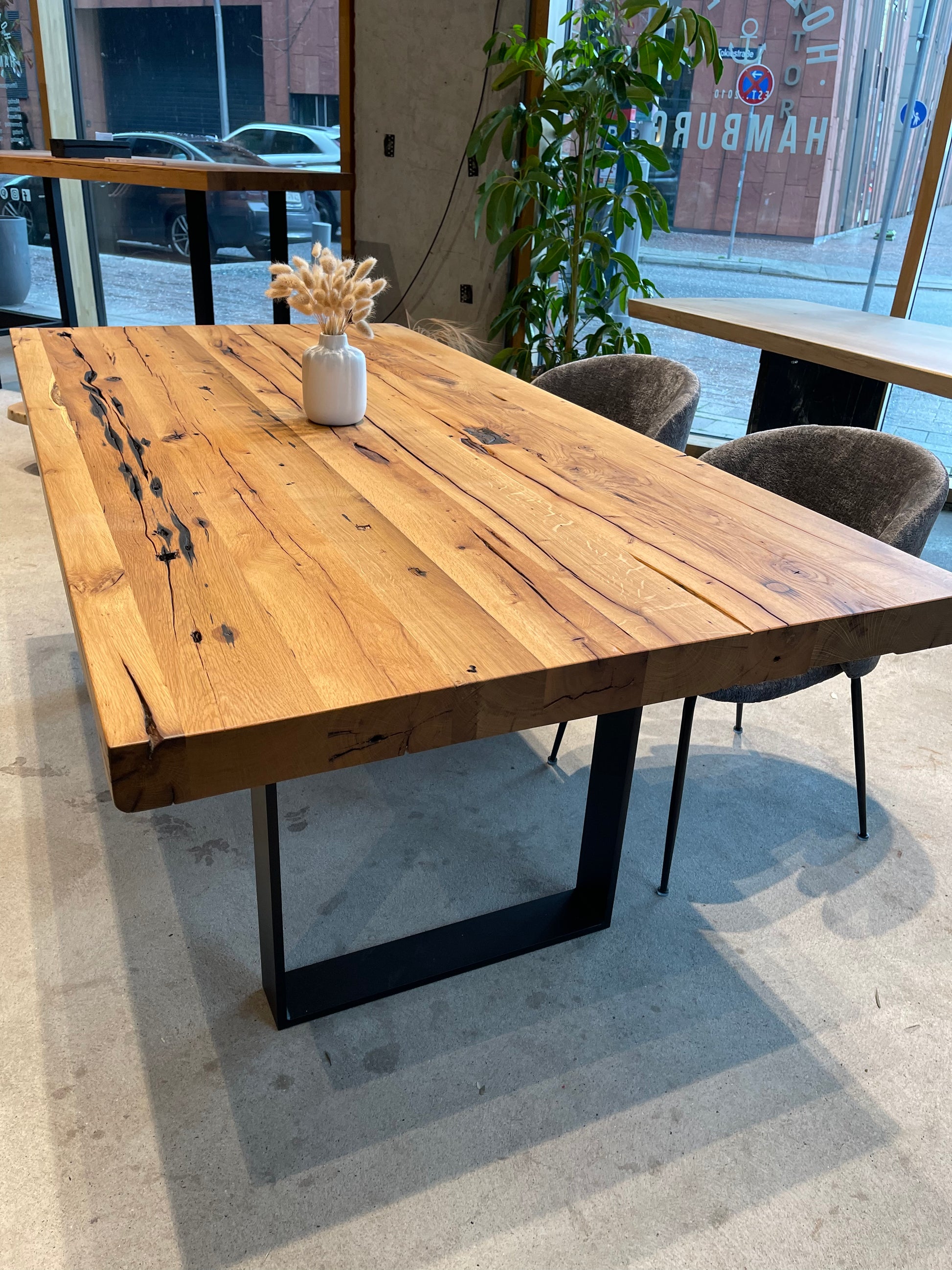 Dieser einzigartige Massivholztisch wird aus bis zu 200 Jahre alten Fachwerkbalken gefertigt, die einst als Baumaterial für historische Gebäude dienten. Das Eichenholz-Altholz wird in aufwendiger Handarbeit restauriert und zu einer beeindruckenden Tischplatte verarbeitet.