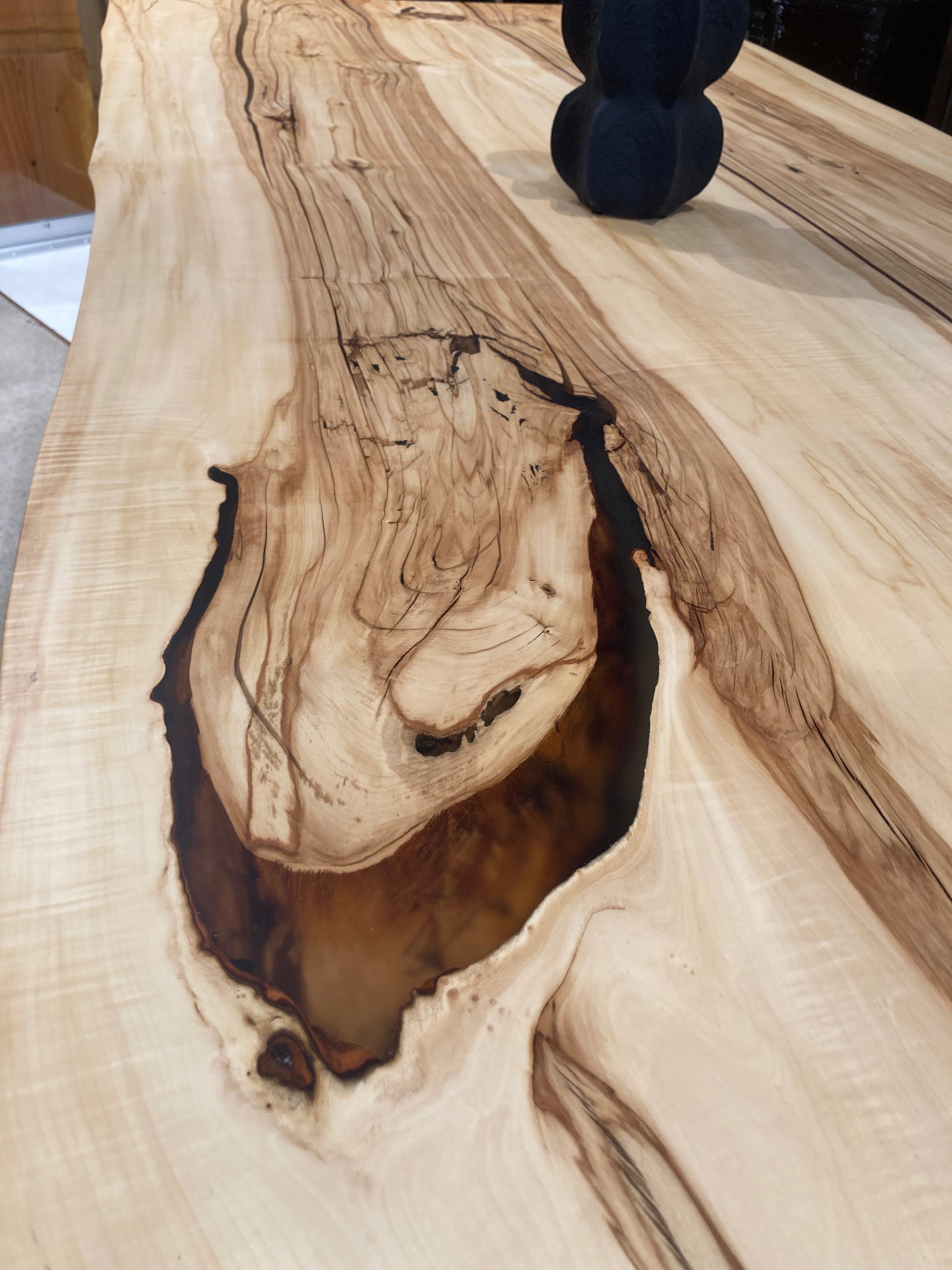 Dieser außergewöhnliche Esstisch wird aus zwei gespiegelt angeordneten Bohlen eines einzigen Eschenstamms gefertigt und miteinander verleimt. Die natürlichen Risse und Löcher sind mit transparentem, lebensmittelechtem Epoxidharz ausgefüllt, wodurch eine absolut glatte und ebene Oberfläche entsteht.
