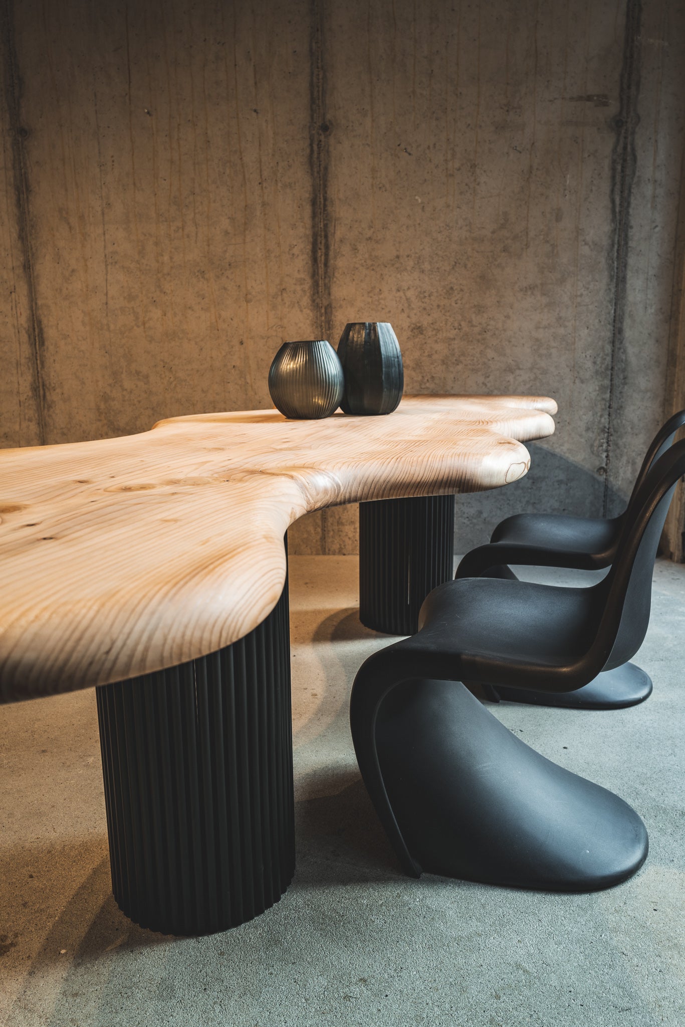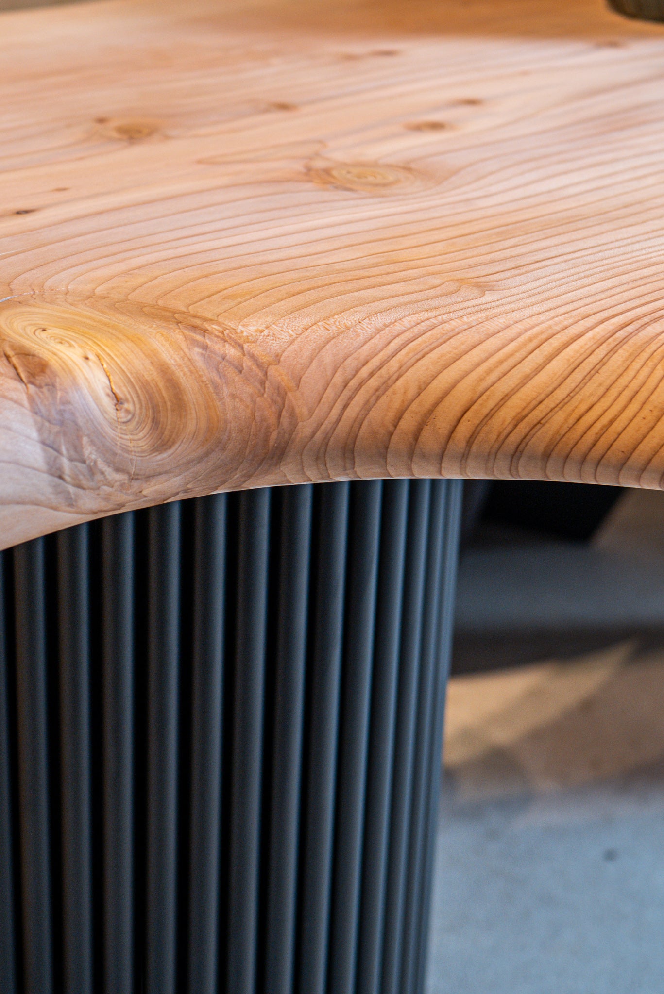 Die Tischplatte besteht aus einem Stück Zedernholz, das die einzigartige Struktur und Wärme des Holzes bewahrt. Die zwei Säulen aus Metall mit einer lamellenartigen Struktur bieten dem Tisch eine moderne, stabile Basis und ergänzen die natürliche Schönheit der Tischplatte perfekt.