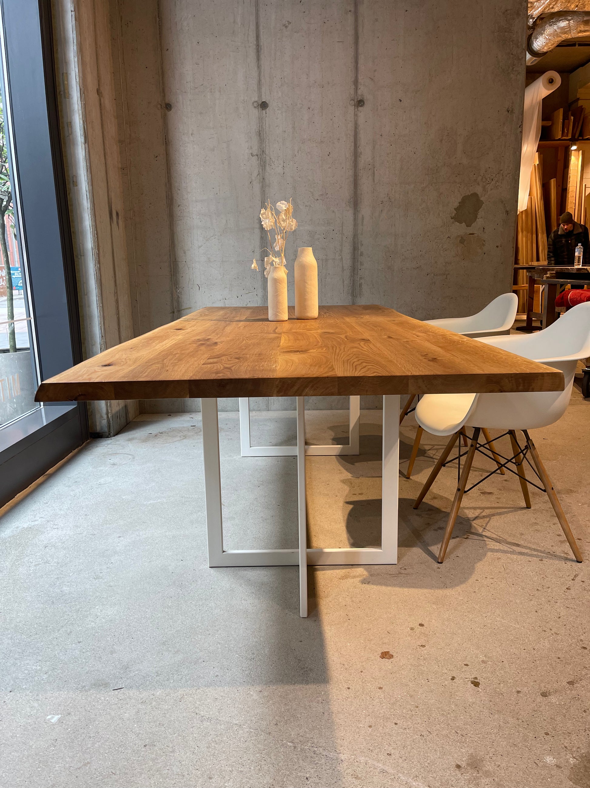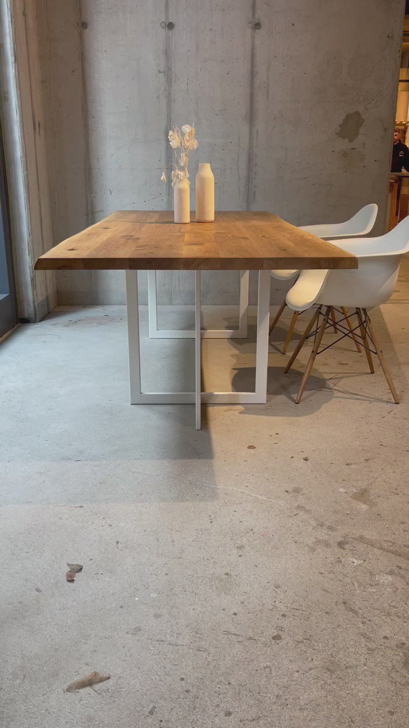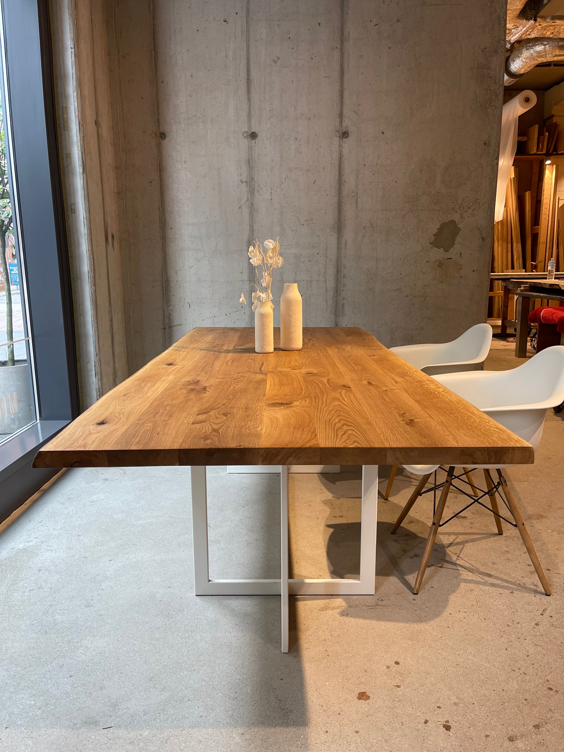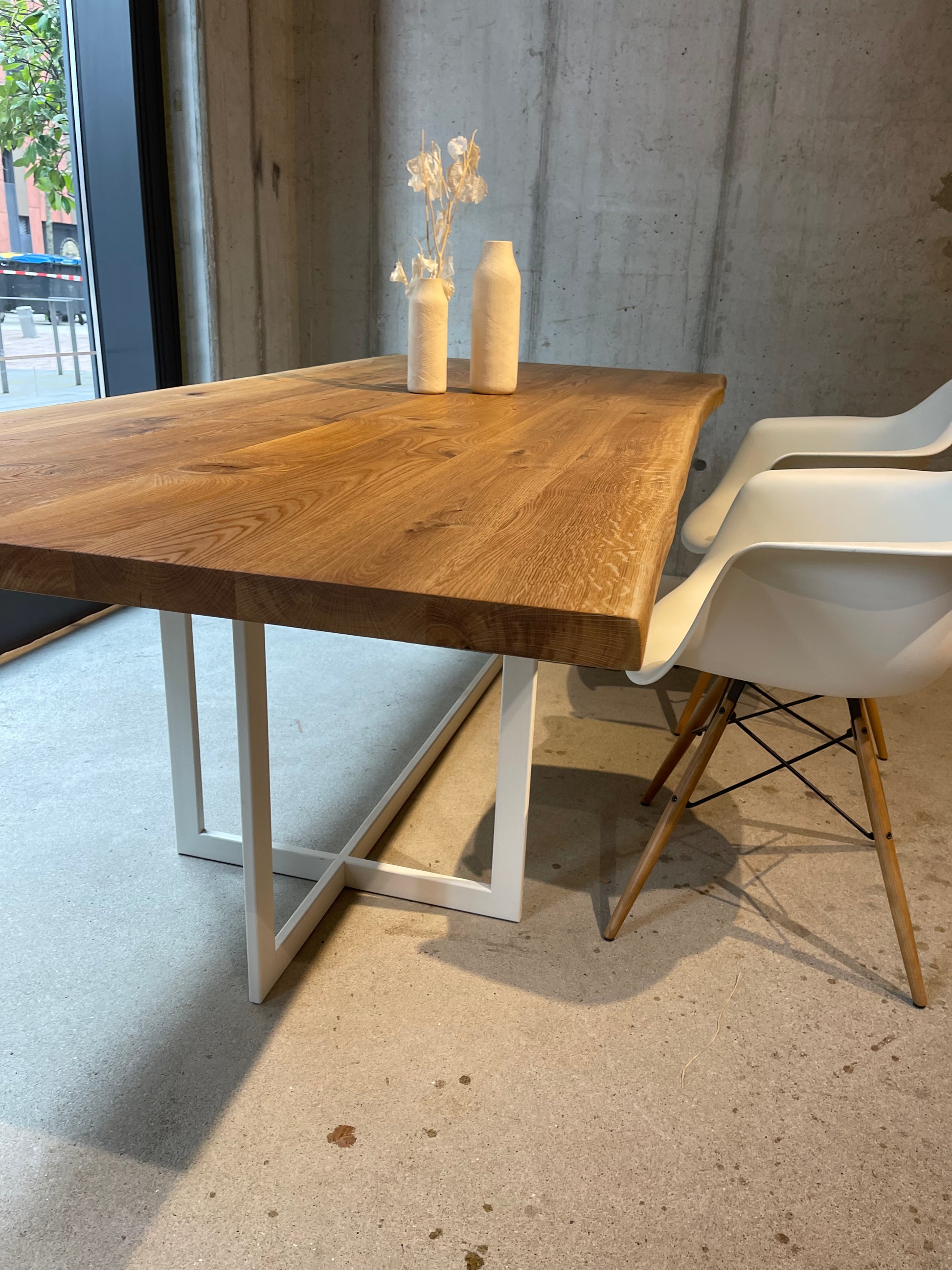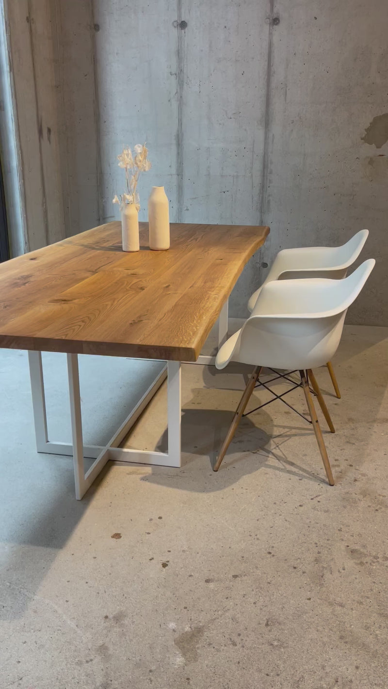 Dieser Naturholztisch besteht aus einer vollmassiven Tischplatte aus hochwertigem Eichenholz mit natürlicher Baumkante, kombiniert mit einem stabilen weißen Metallgestell.