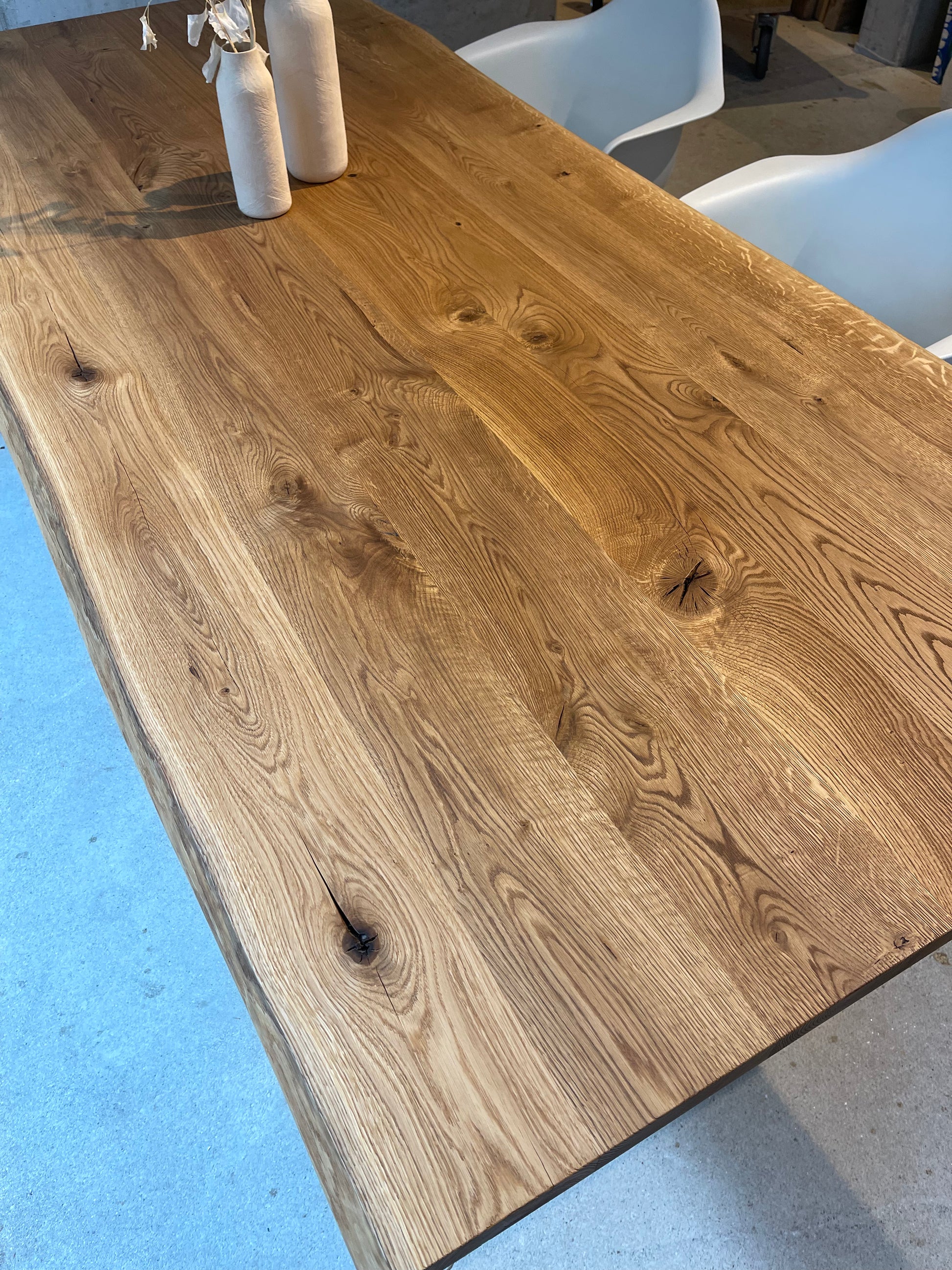 Massivholztisch aus Eichenholz mit Naturkante – zeitlose Eleganz und rustikaler Charme