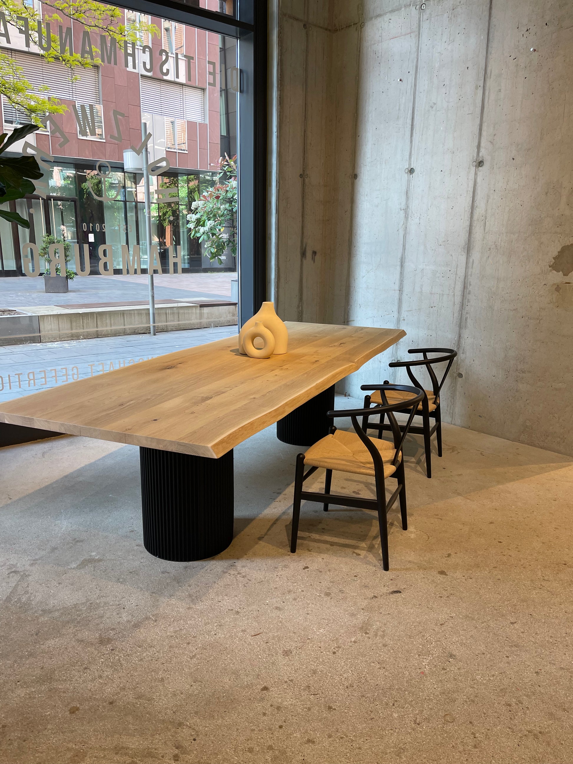 In der Hamburger HafenCity – voll mit Massivholztischen, Platten und persönlicher Beratung im Atelier-Flair. Live vor Ort oder per Video.