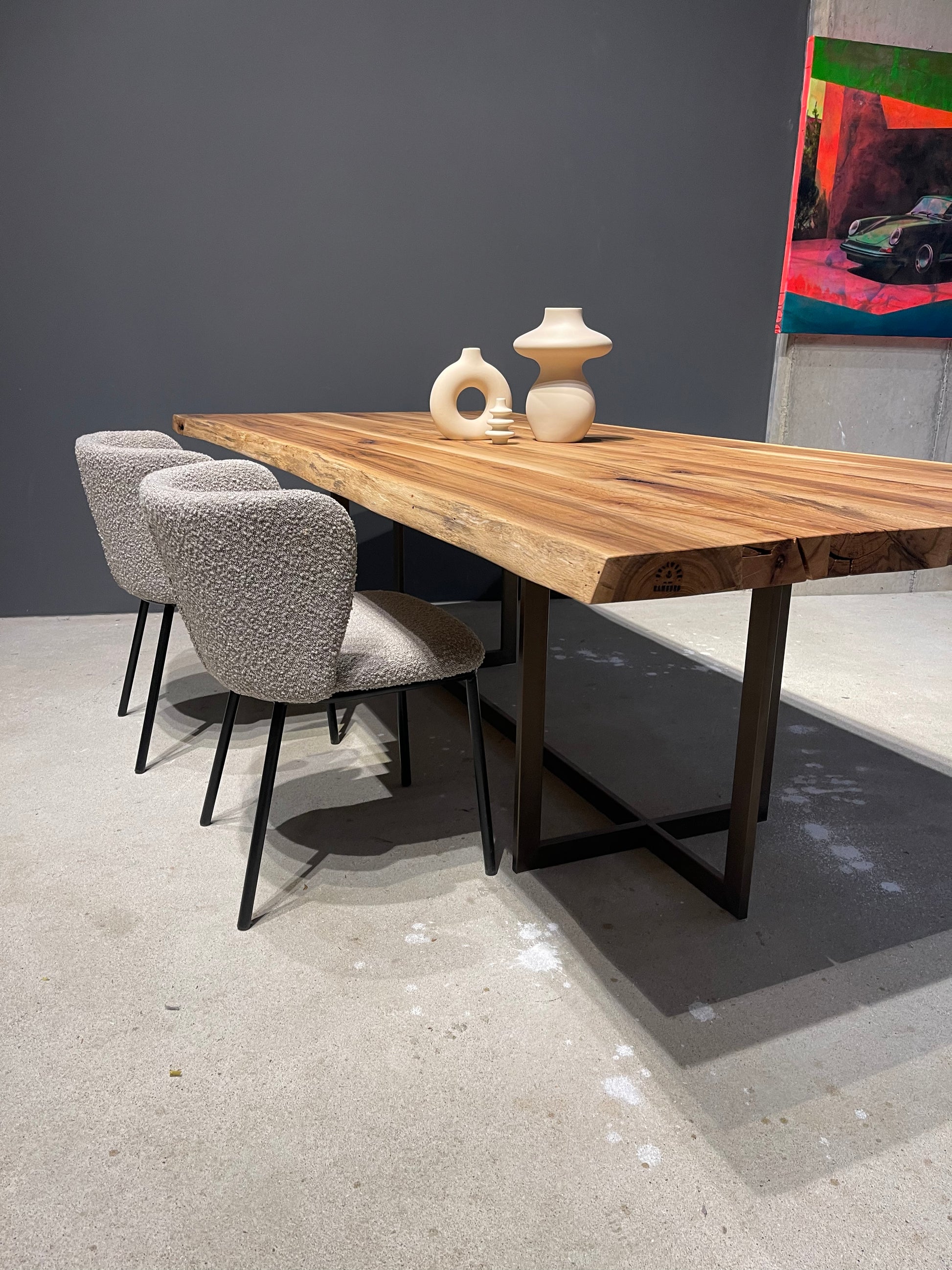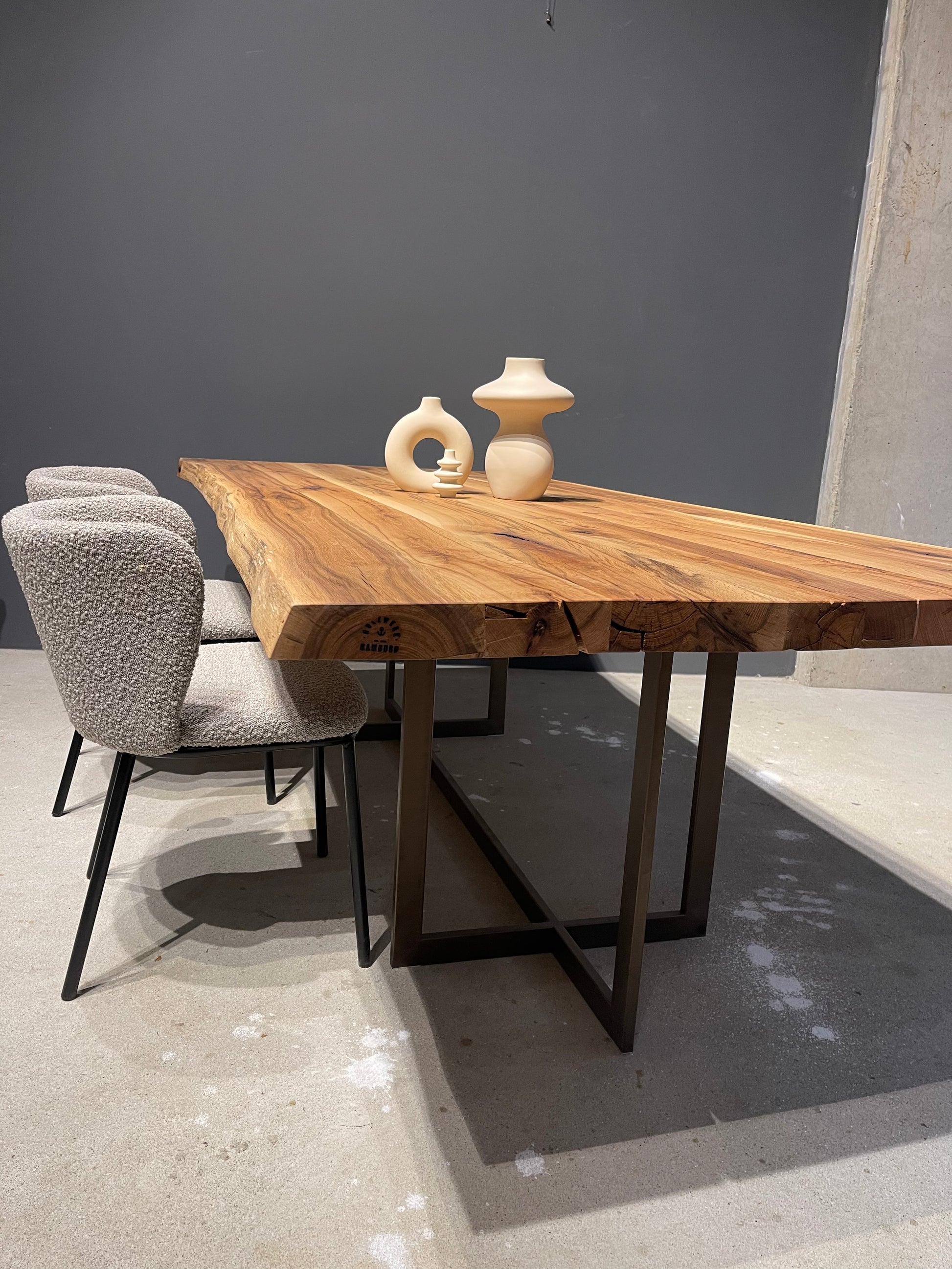 Das Tischgestell ist filigran und modern gefertigt und in der Farbe schwarz gehalten, wodurch es einen eleganten Kontrast zur rustikalen Tischplatte bildet.