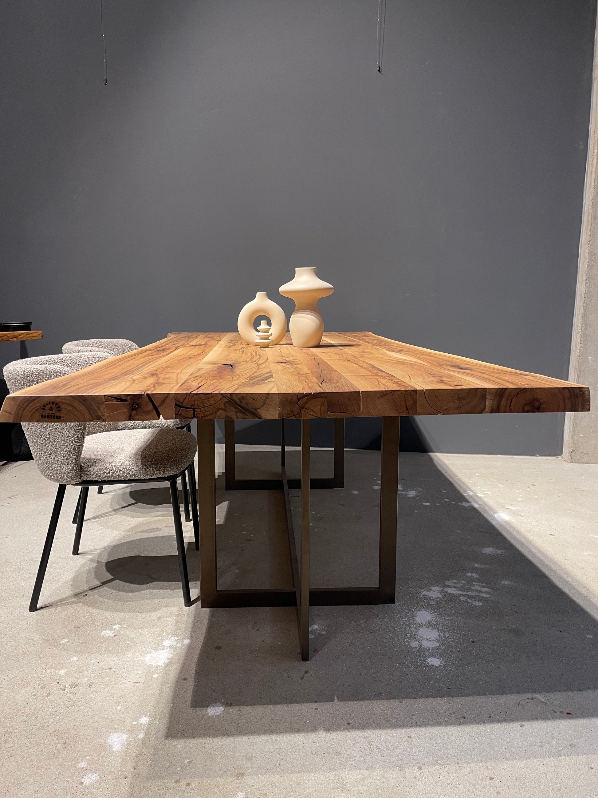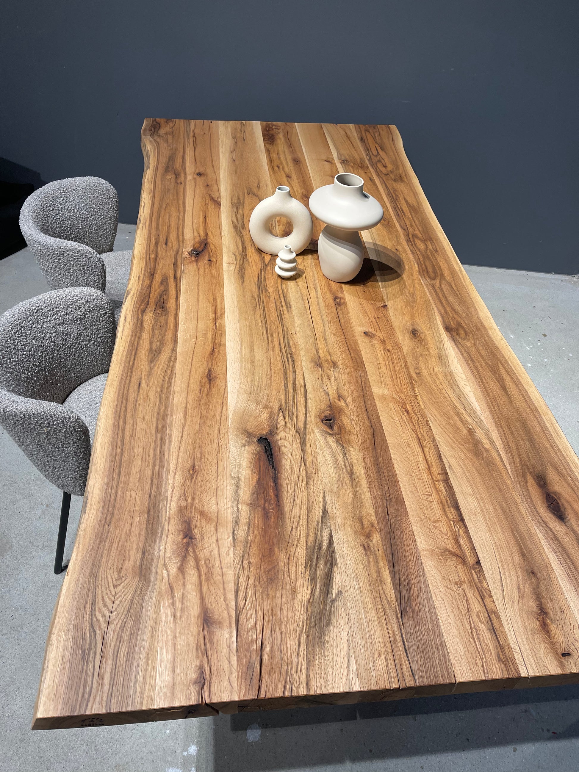 Dieser Massivholztisch ist vorrätig und sofort lieferbar im Maß 240x105-115 cm. Die Plattenstärke beträgt stattliche 5 cm vollmassiv Eichenholz. Das Tischgestell ist individuell veränderbar, um den Tisch perfekt an deine Wünsche anzupassen.