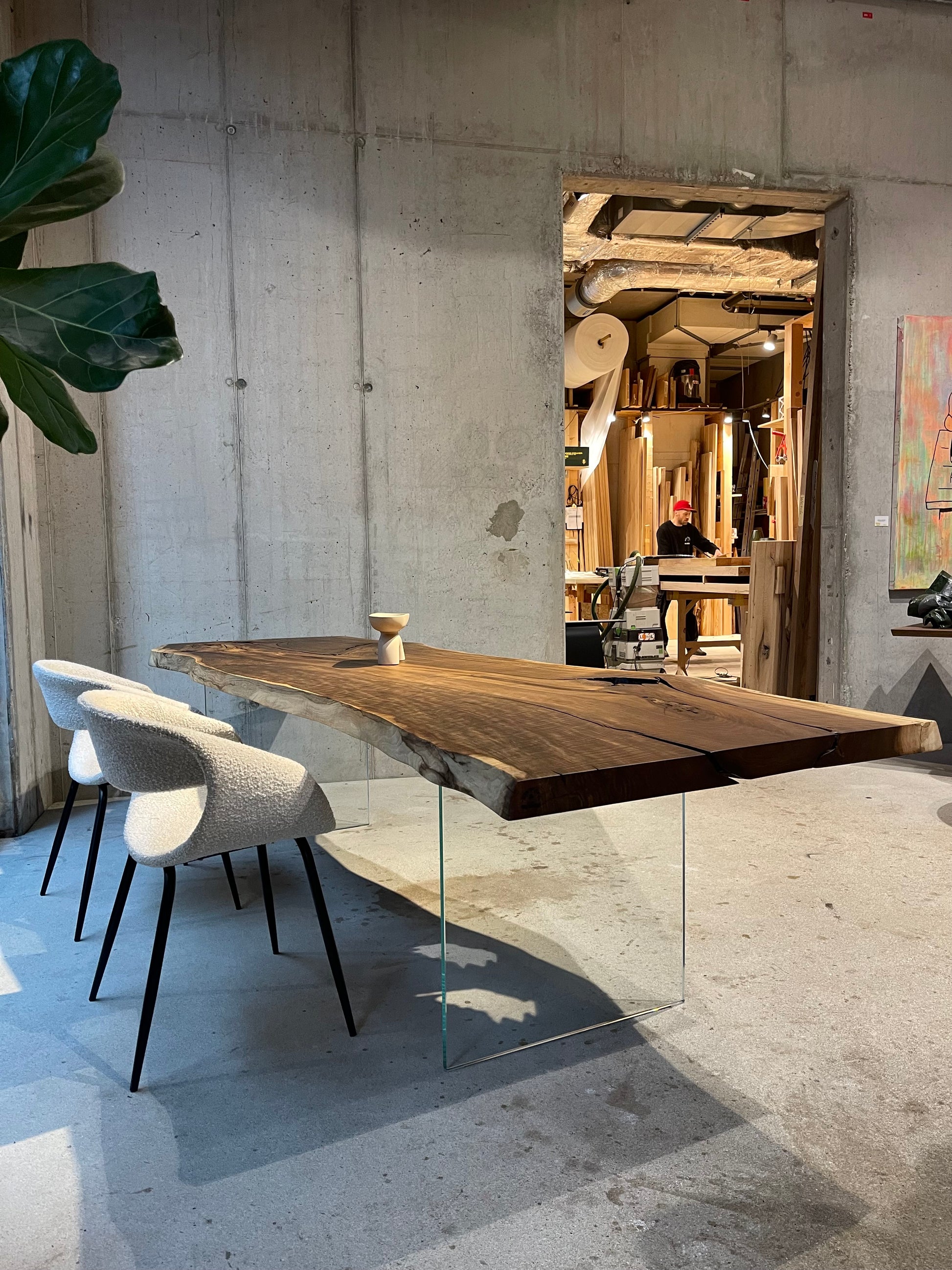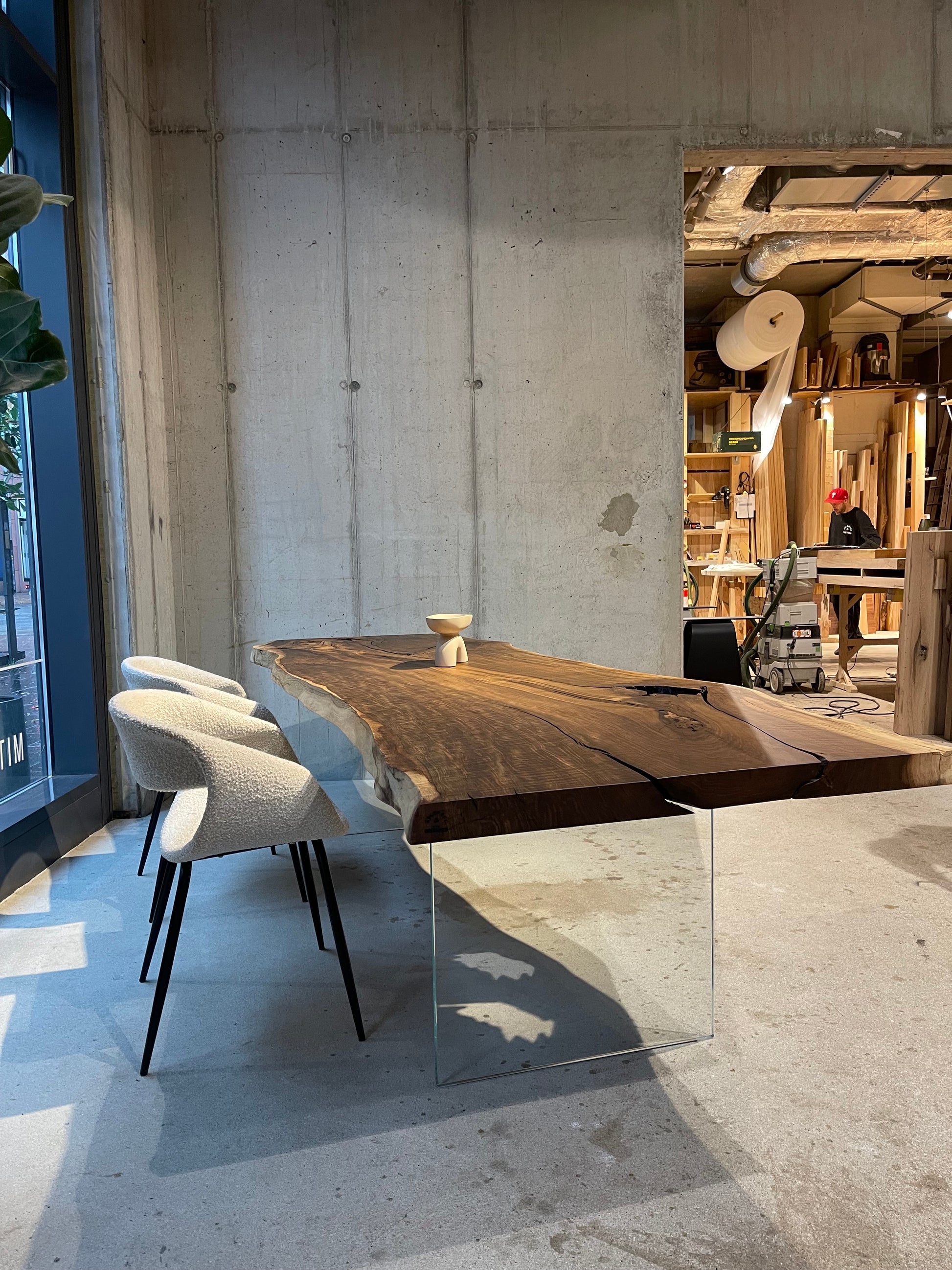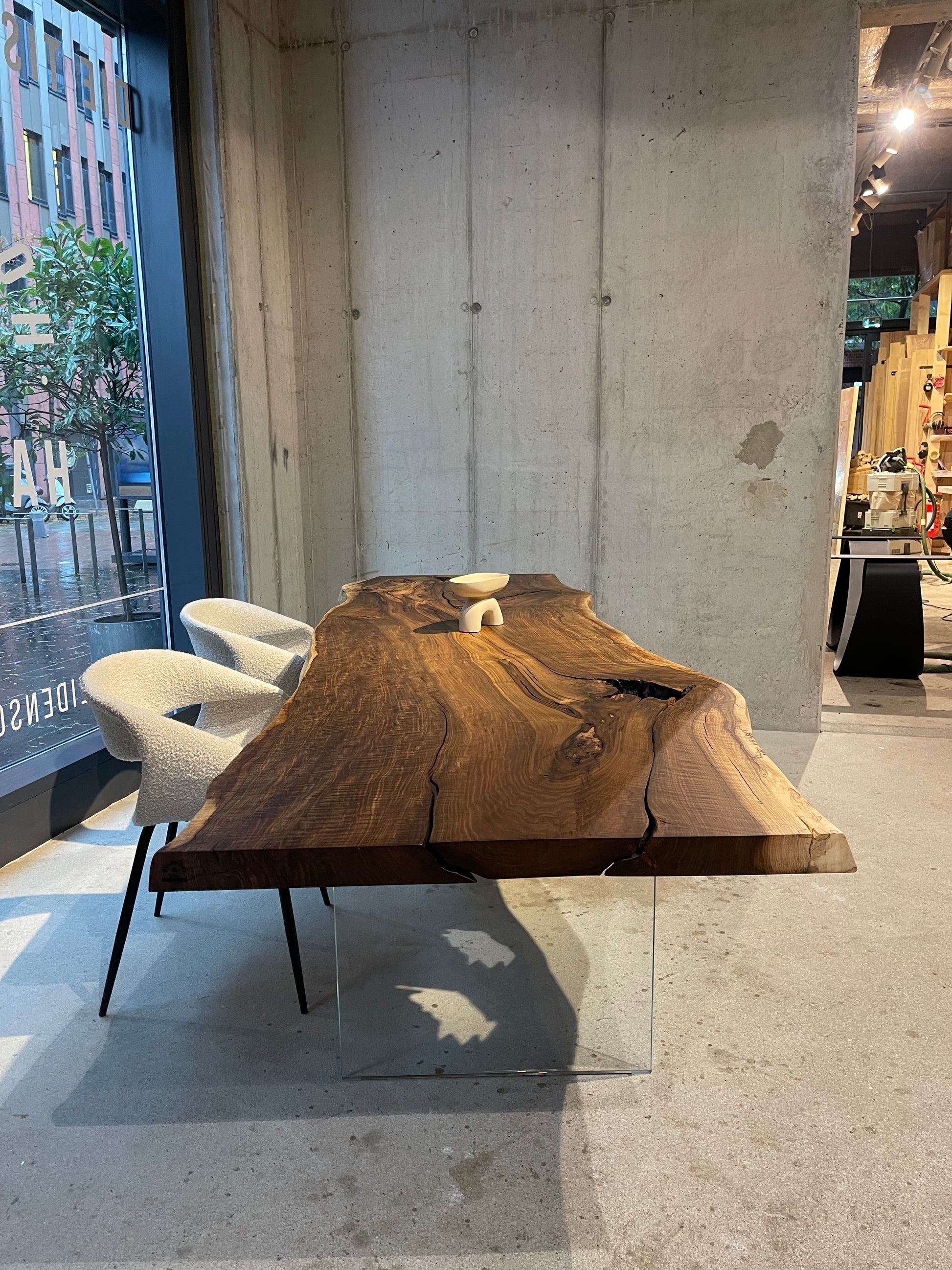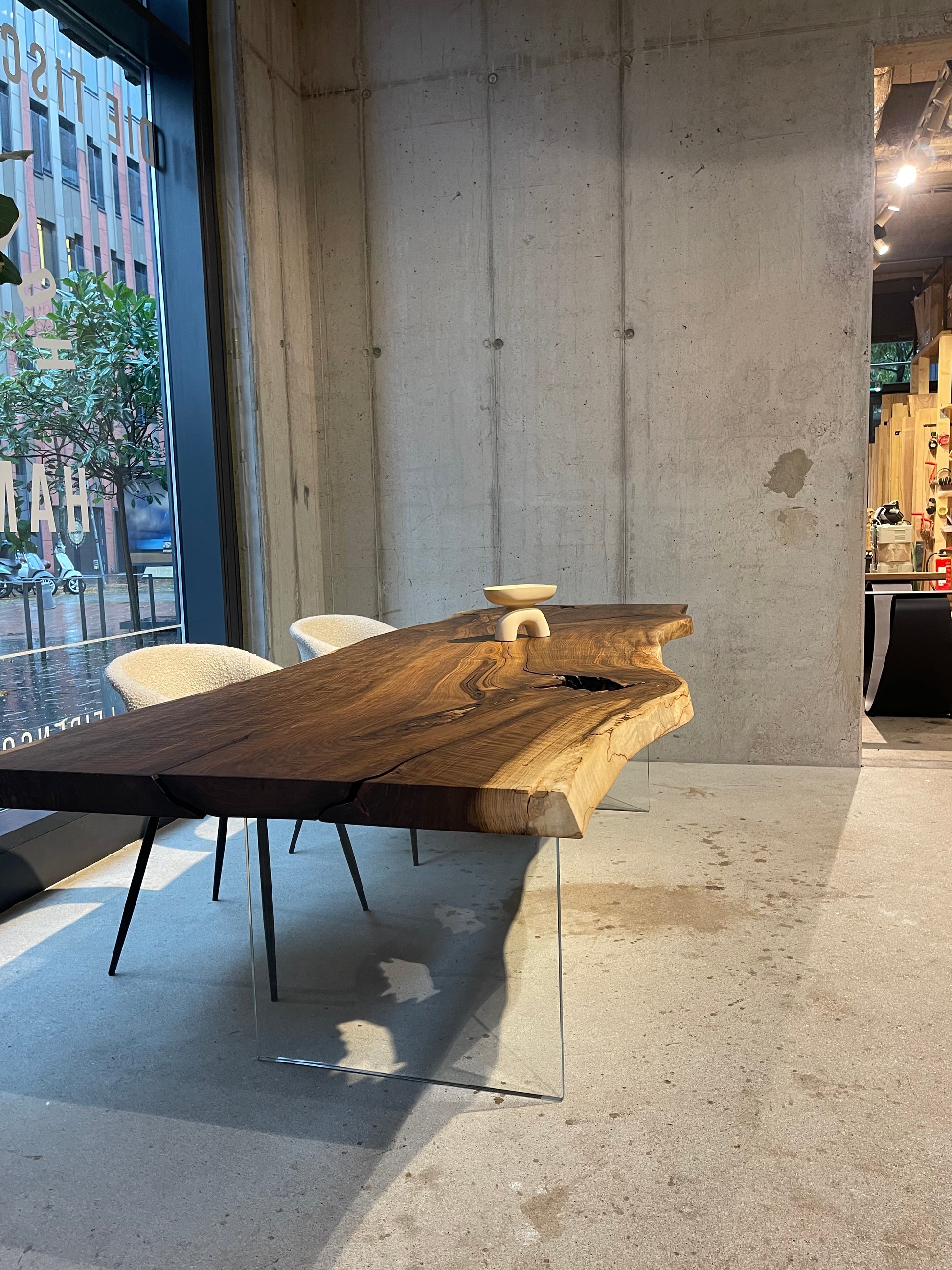 Das transparente Glasgestell lässt die Tischplatte förmlich schweben und setzt die beeindruckende Nussbaumoberfläche perfekt in Szene. Das Gestell ist individuell anpassbar, sodass Sie den Tisch ganz nach Ihren Wünschen gestalten können.