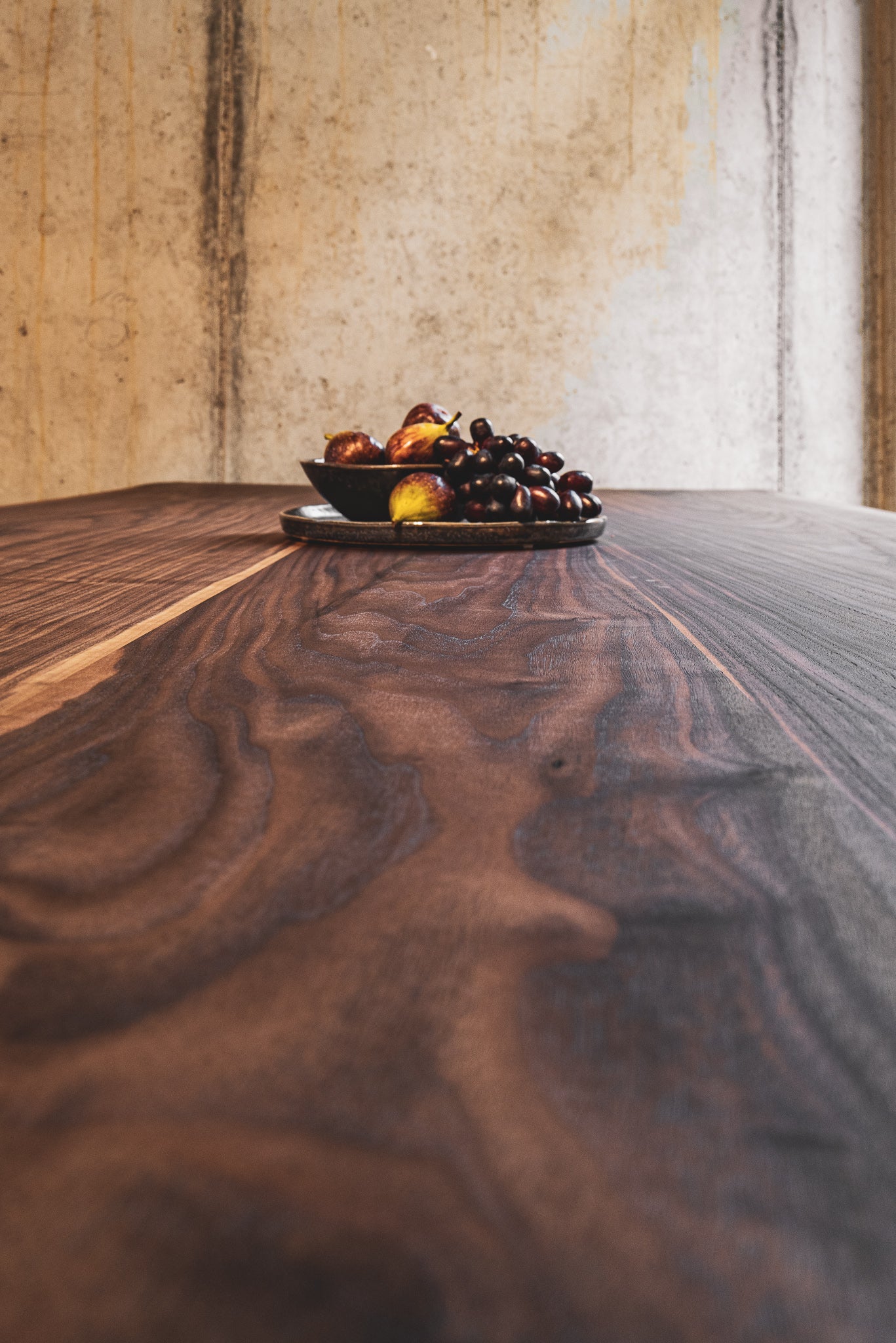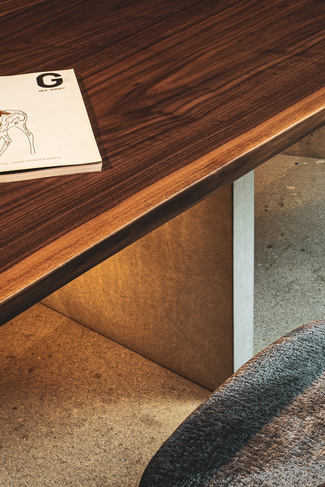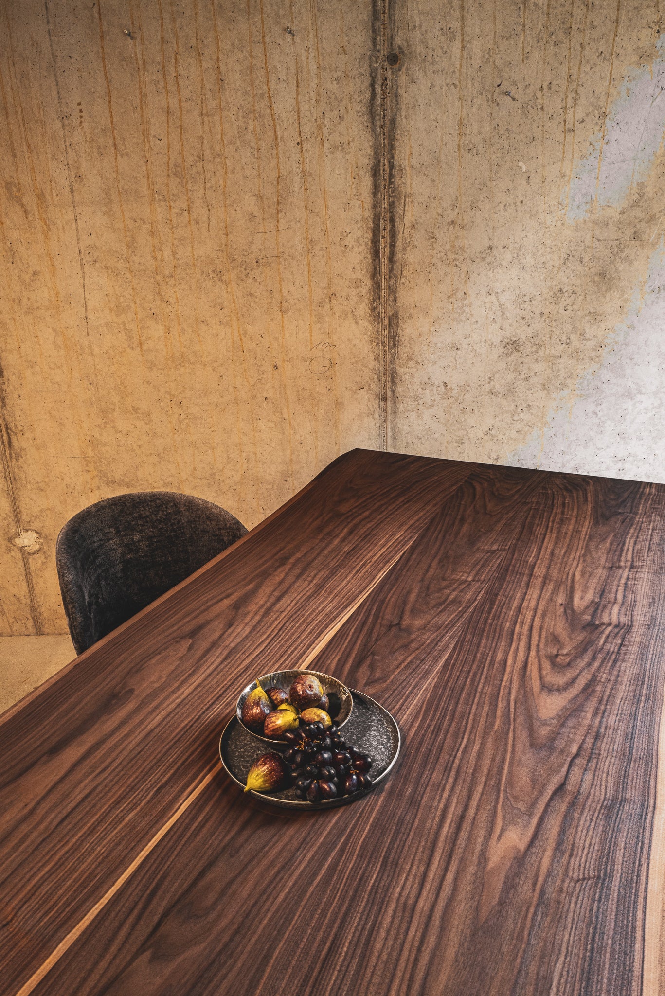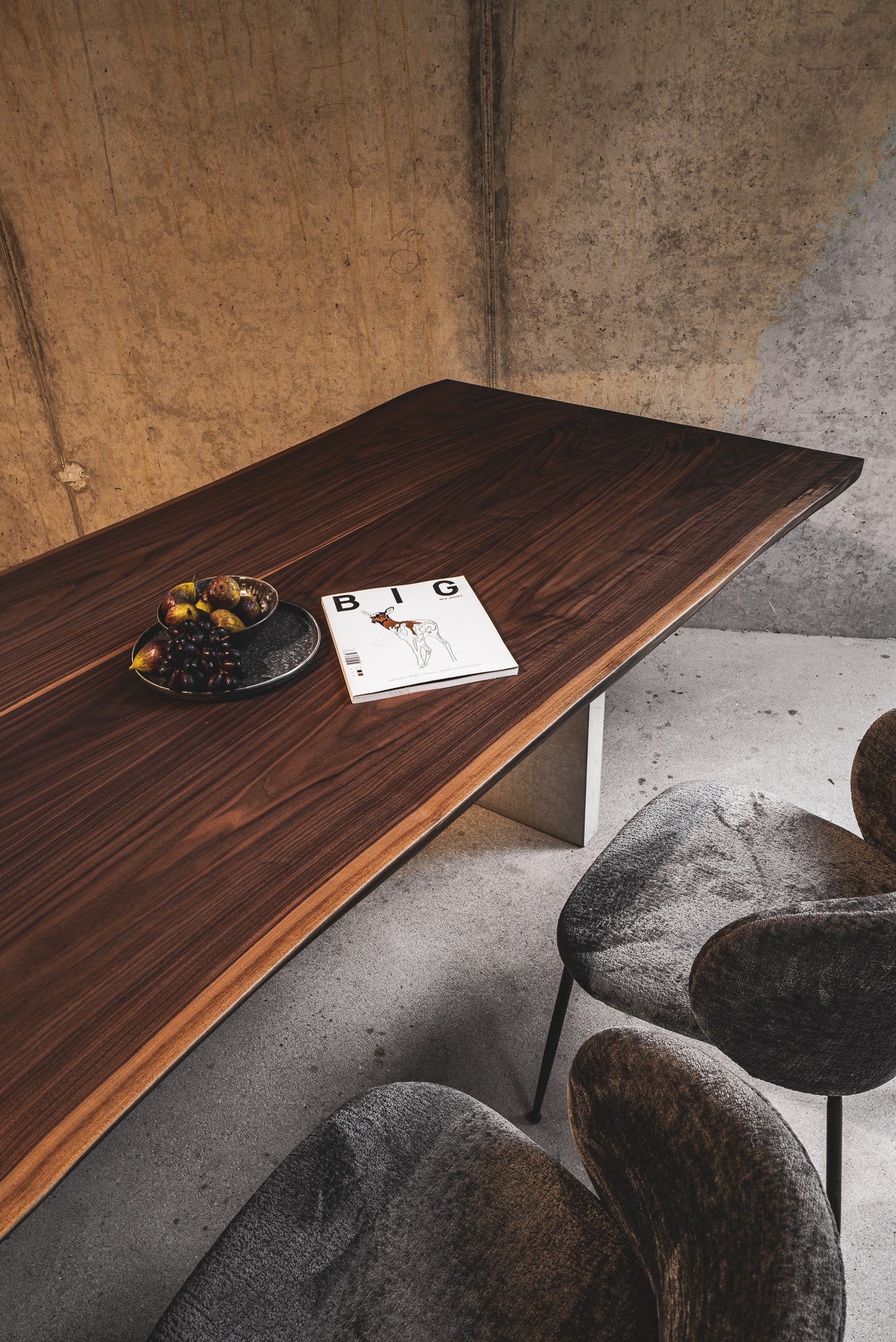 Das Tischgestell aus Beton in Wangenform sorgt für eine stabile Basis und setzt einen modernen Kontrast zur warmen, dunklen Farbe des Nussbaumholzes.