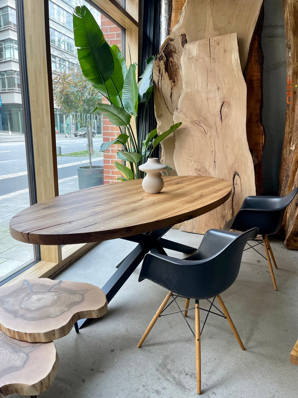In der Hamburger HafenCity – voll mit Massivholztischen, Platten und persönlicher Beratung im Atelier-Flair. Live vor Ort oder per Video.