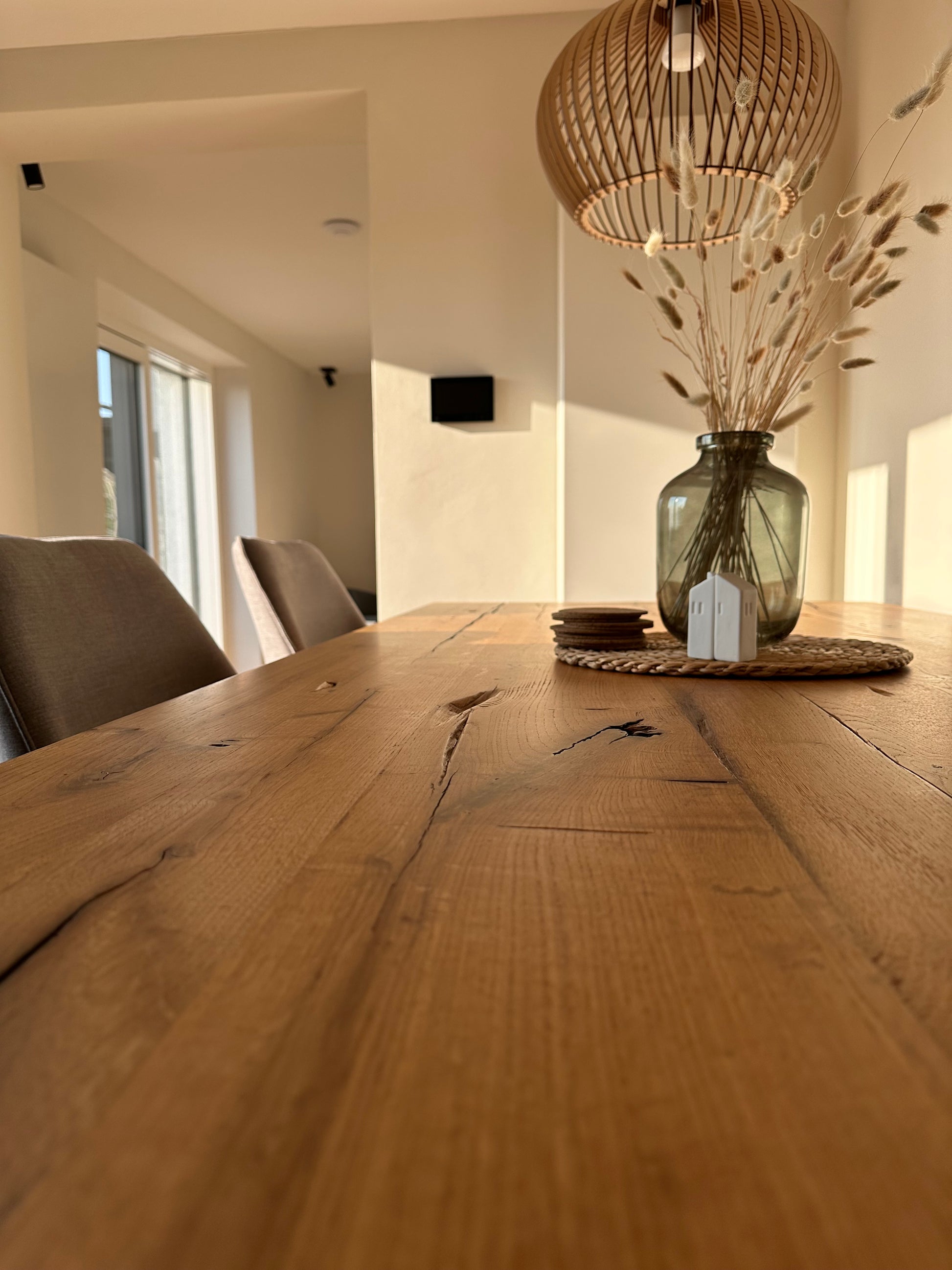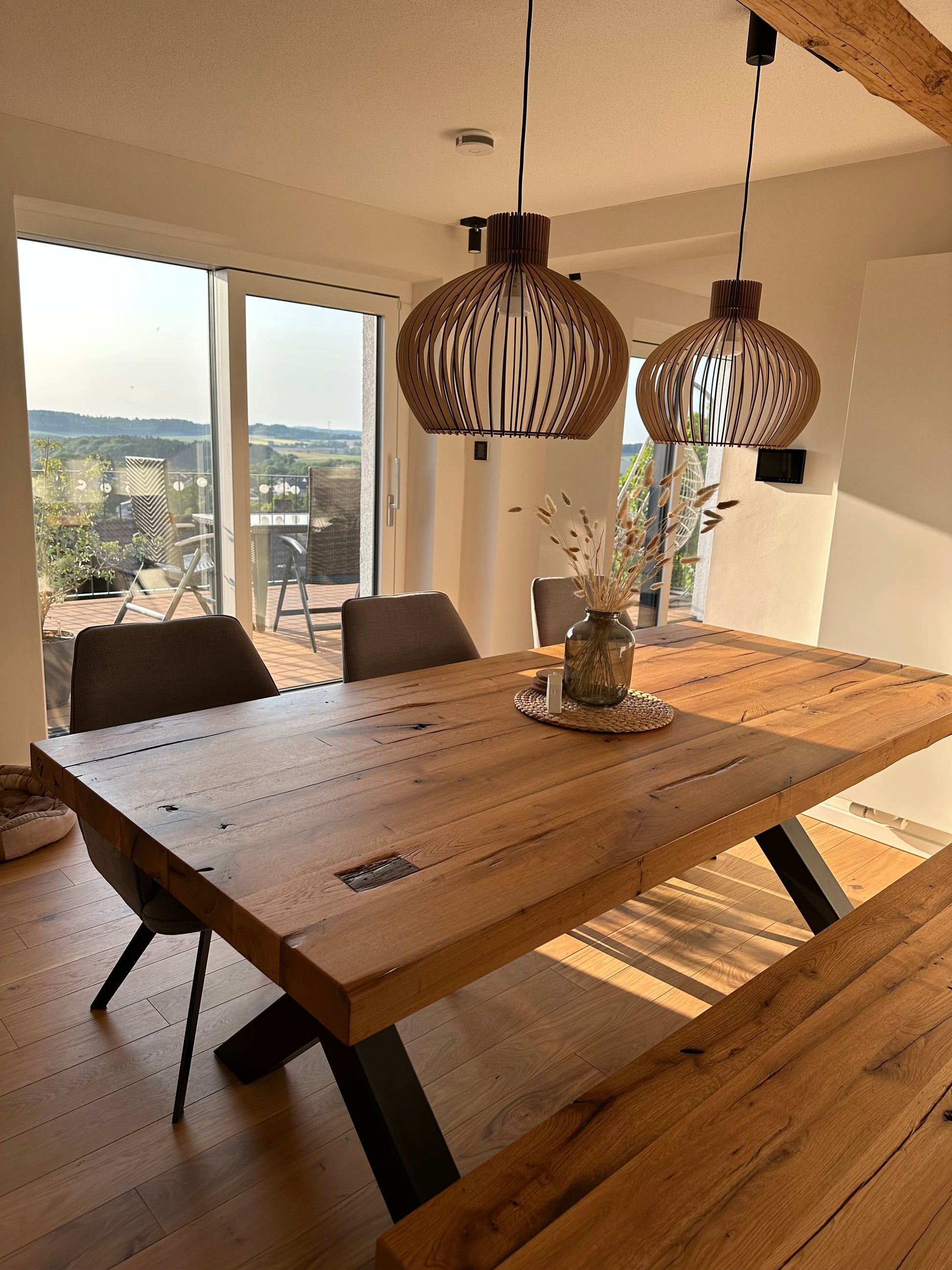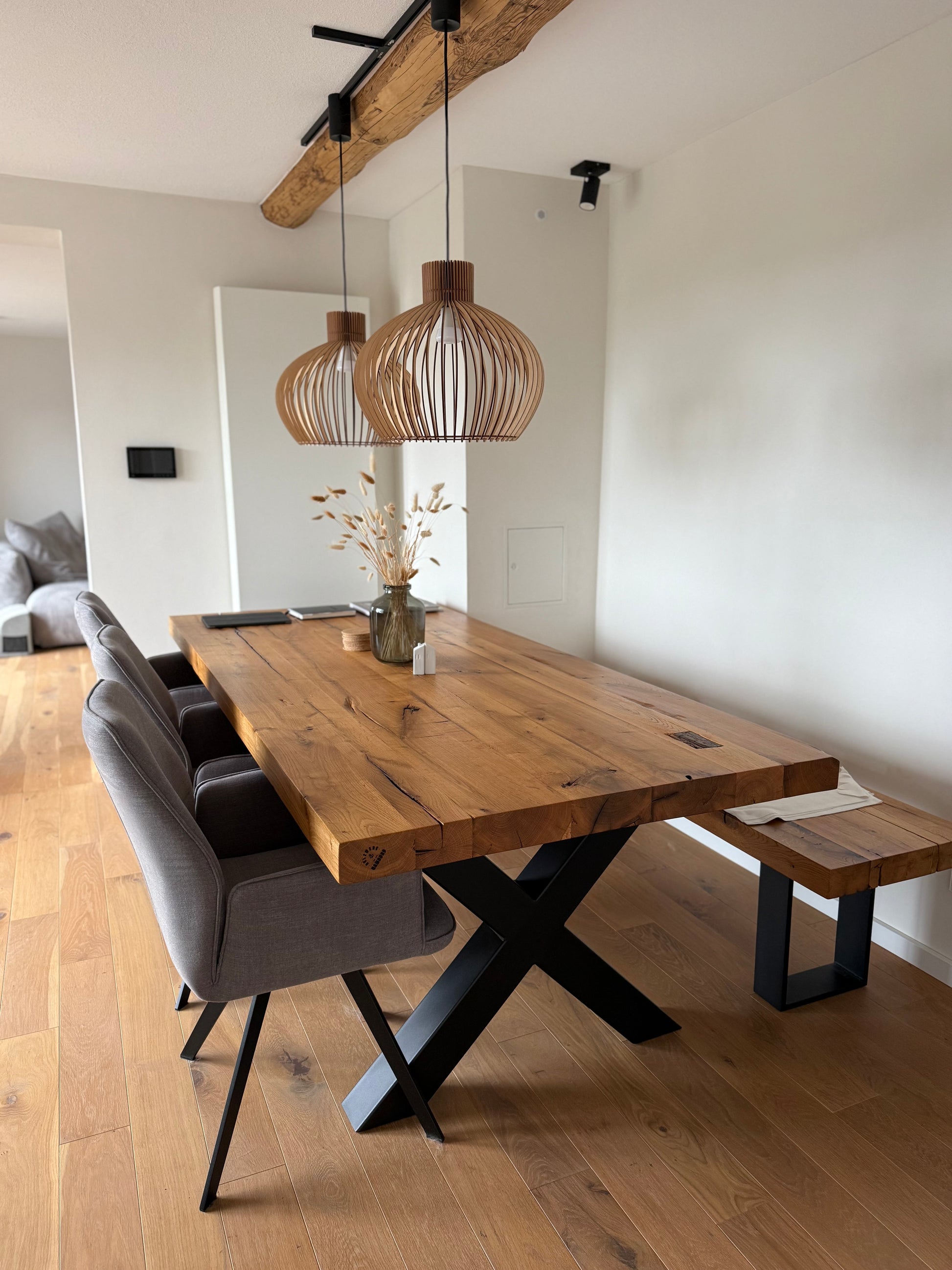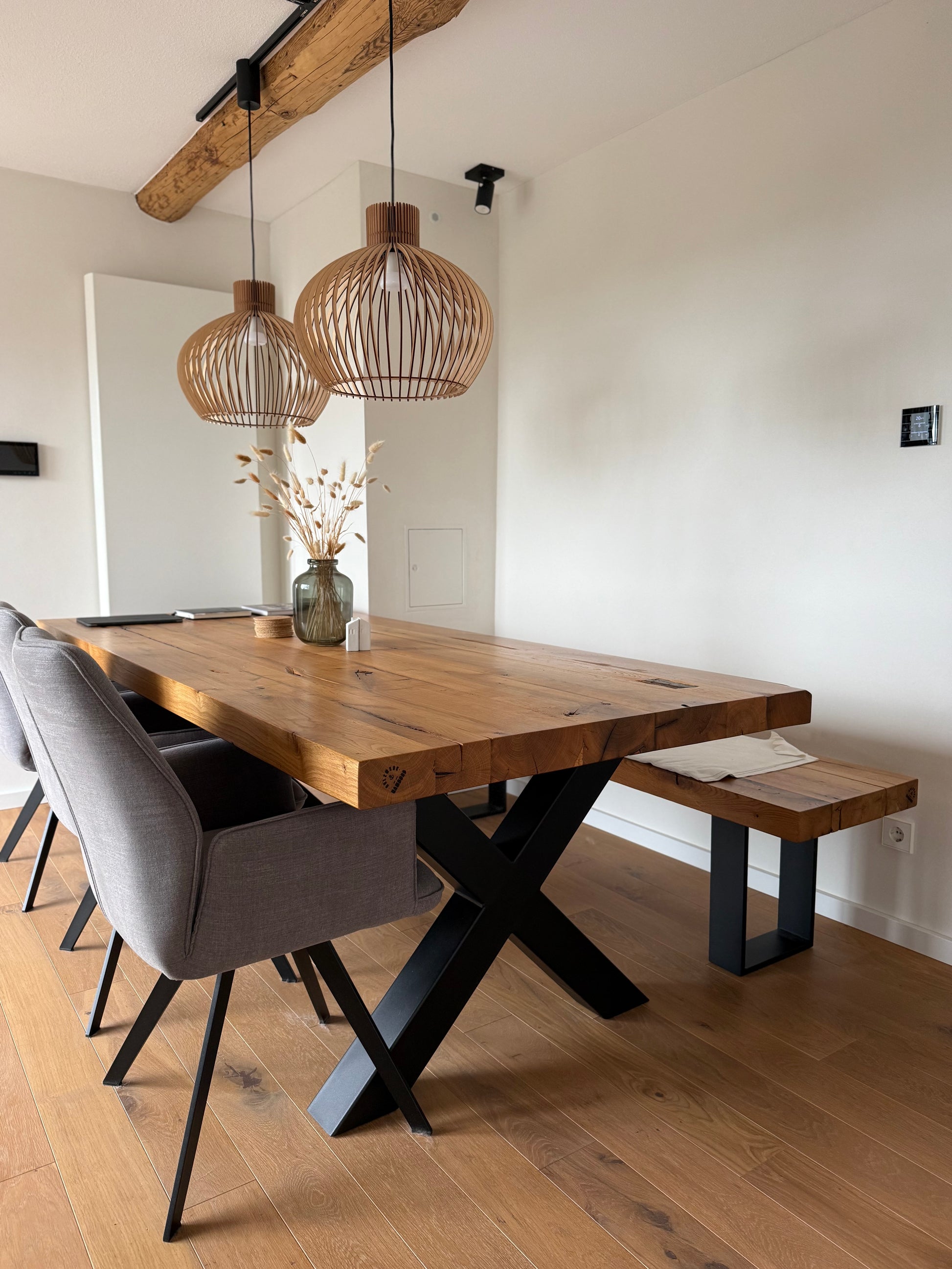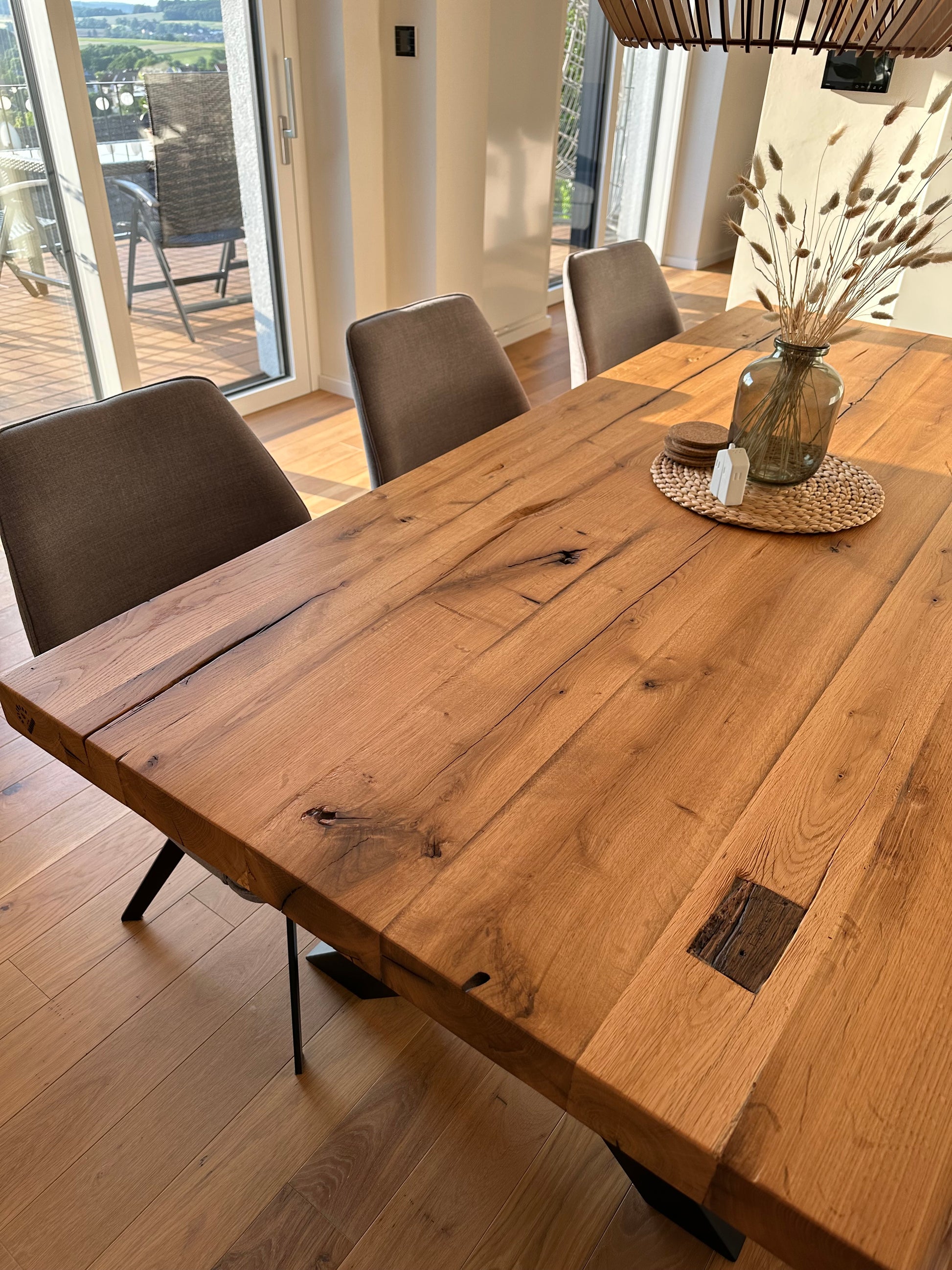 Dieser wunderschöne Esstisch aus Massivholz Eichenholz vereint rustikalen Charme mit höchster Qualität. Die Tischplatte wird aus vollmassiven Fachwerkbalken gefertigt – kein Furnier, keine Aufdopplung, sondern echtes, charaktervolles Vollholz mit einzigartiger Patina.