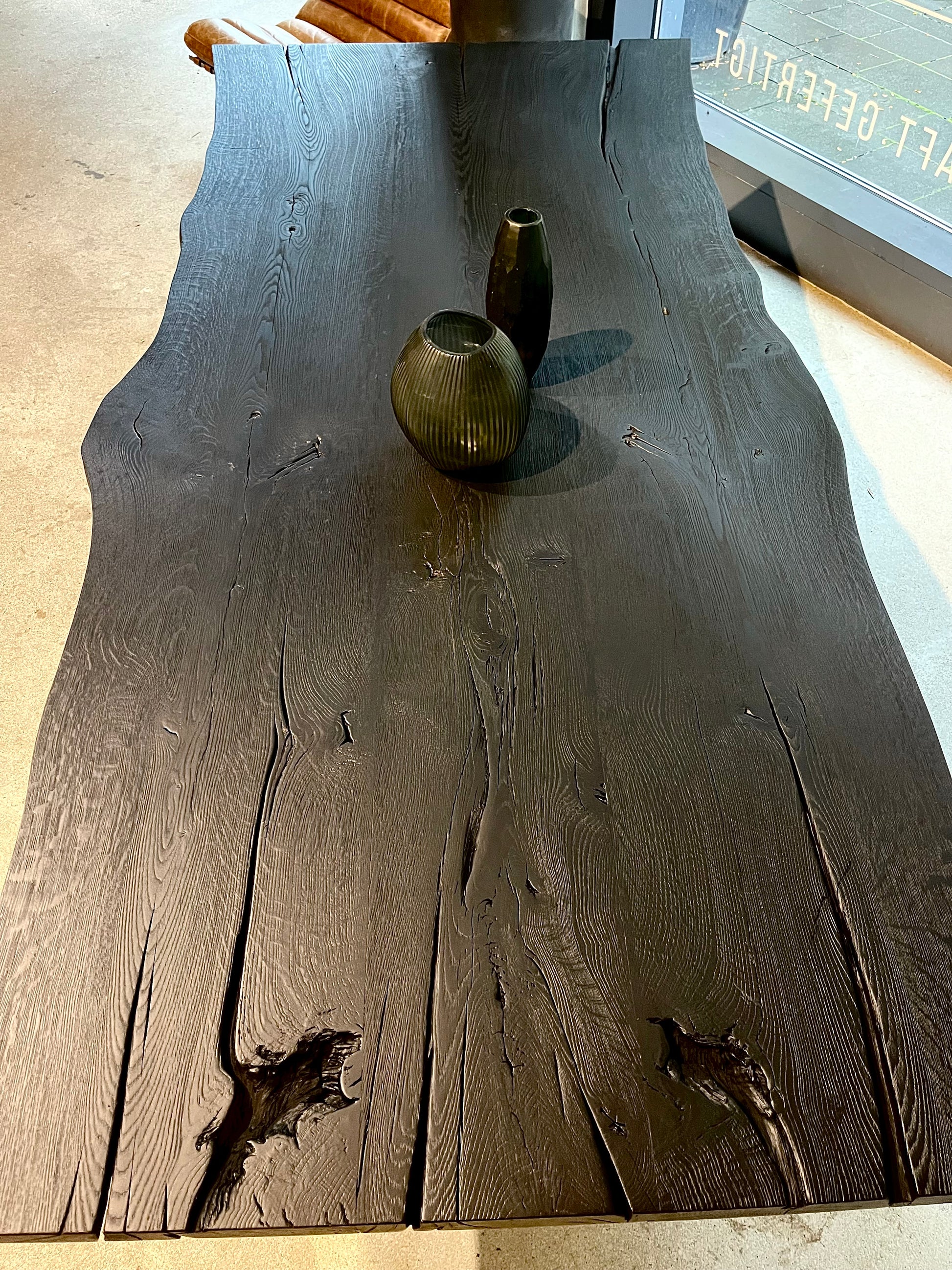 Schwarzer Esstisch aus geköhltem Eichenholz mit natürlicher Baumkante nach Maß