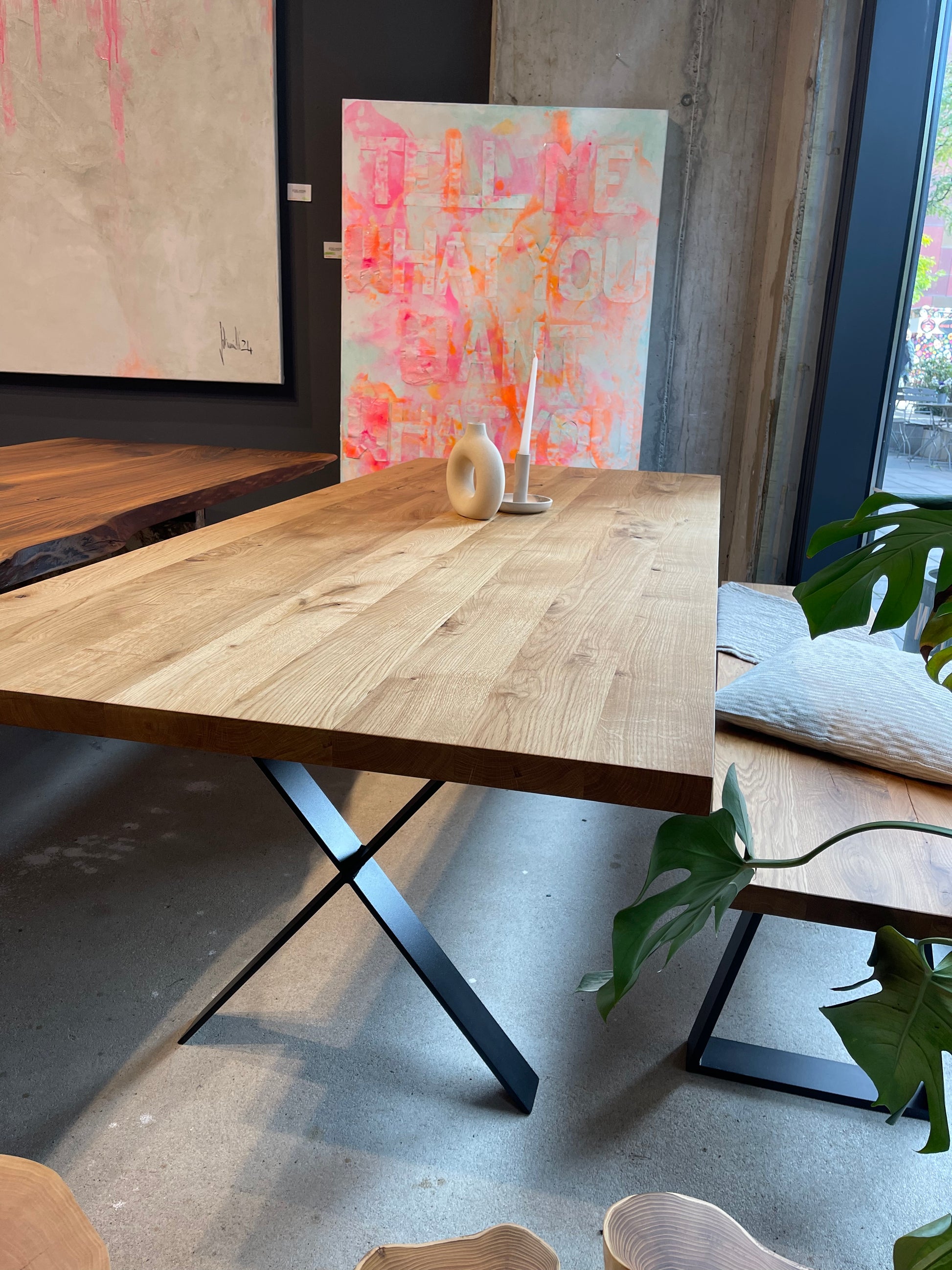 In unserer Ausstellung findest du über 50 sofort verfügbare Massivholztische sowie mehr als 200 Tischplatten zur Auswahl.