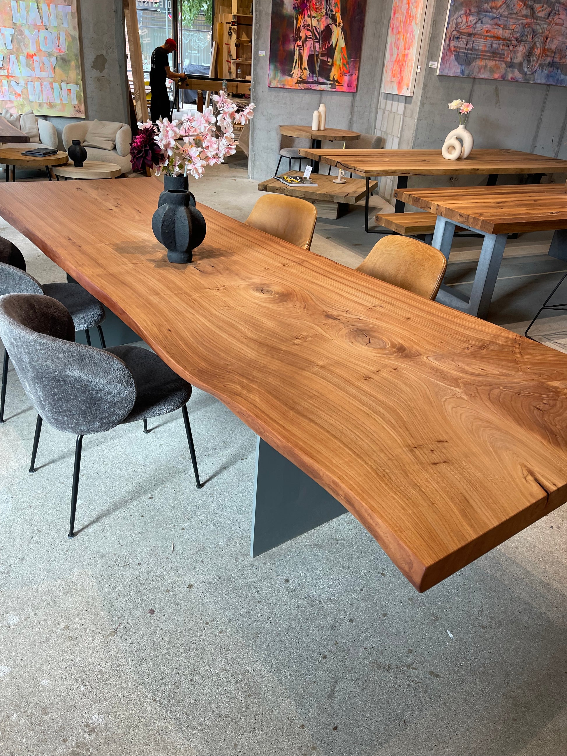 Dieser außergewöhnliche Massivholztisch aus unverleimter Ulme ist ein echtes Unikat. Die Tischplatte besteht aus einer einzigen, großen Stammbohle, wodurch die natürliche Integrität des Holzes vollständig erhalten bleibt. Dies verleiht dem Tisch eine unvergleichliche Ausstrahlung und macht ihn zu einem ganz besonderen Möbelstück.