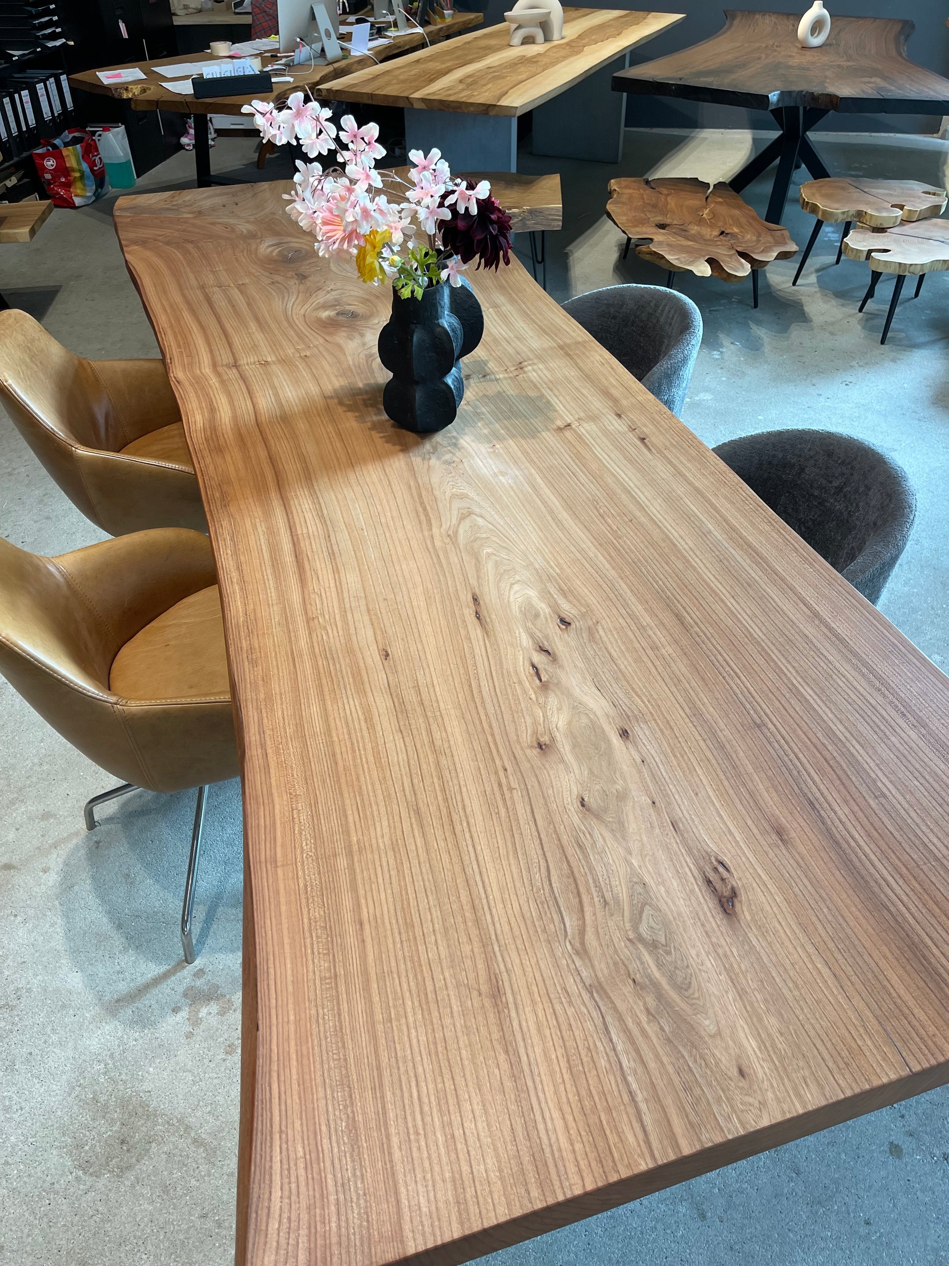 Unsere Esstische aus unverleimter Ulme werden von erfahrenen Handwerkern mit höchster Präzision gefertigt. Jeder Tisch wird sorgfältig ausgewählt und bearbeitet, um die markante Struktur und die besondere Eleganz des Holzes zur Geltung zu bringen.