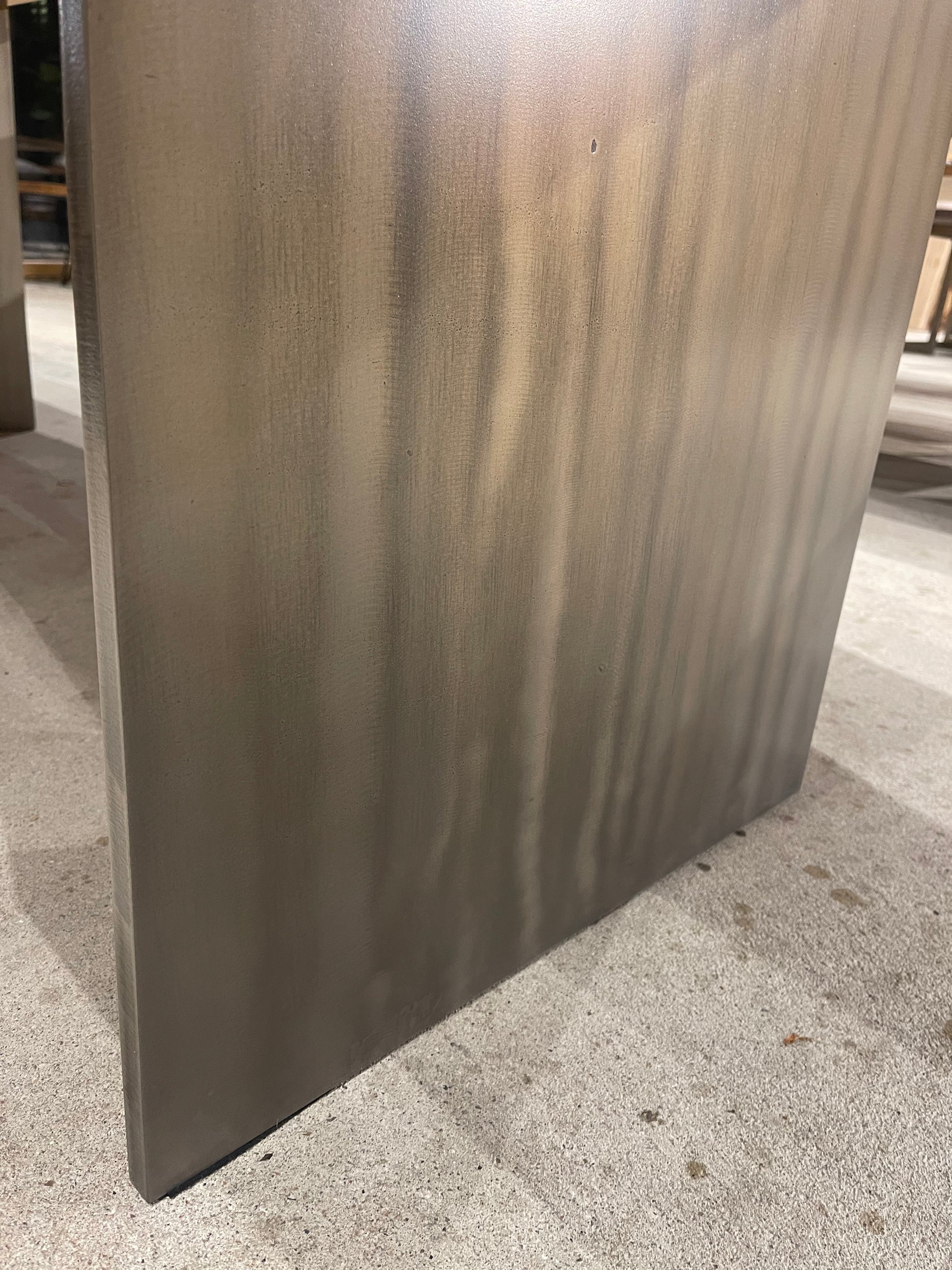 Das Metallgestell aus Stahl besteht aus zwei stabilen Stahlplatten, die dem Tisch eine schwebende Optik verleihen und gleichzeitig für maximale Standfestigkeit sorgen. Die Oberfläche des Gestells besitzt einen besonderen Schliff, der je nach Lichteinfall zwischen Silber und Anthrazit schimmert. Jedes Gestell wird in Hamburg handgefertigt – keine Massenware, sondern individuell anpassbar in Höhe, Stärke, Form und Farbe.