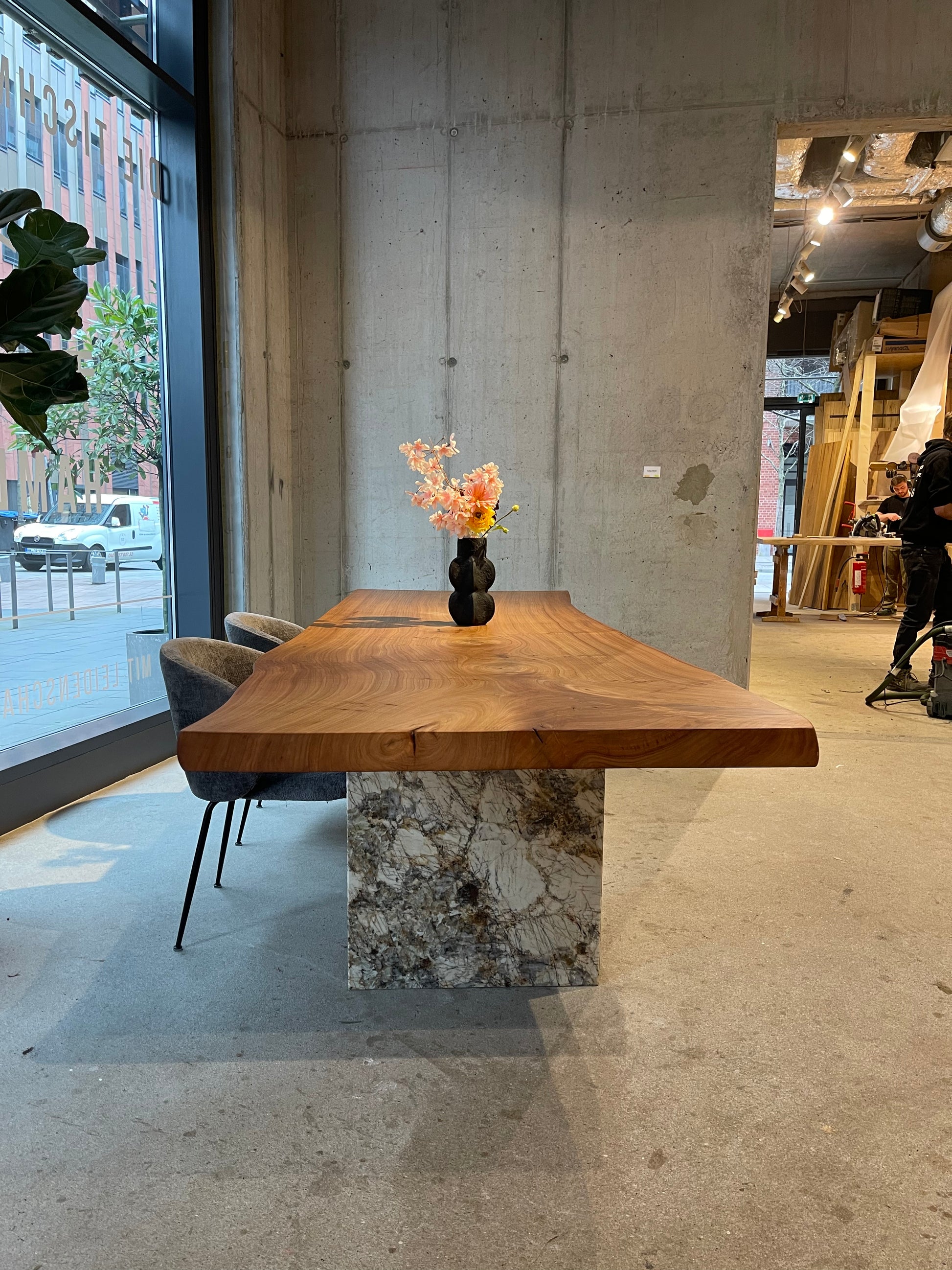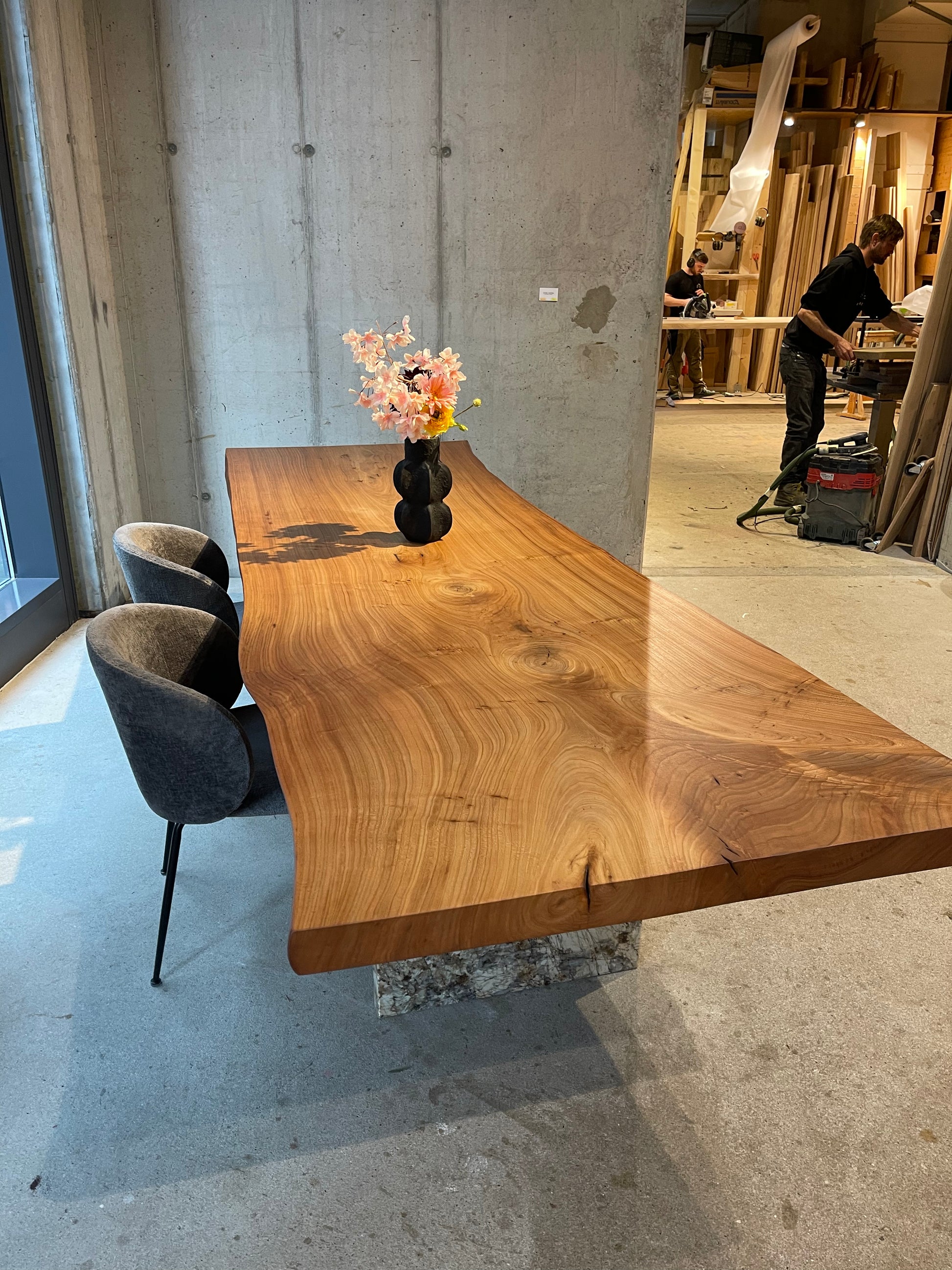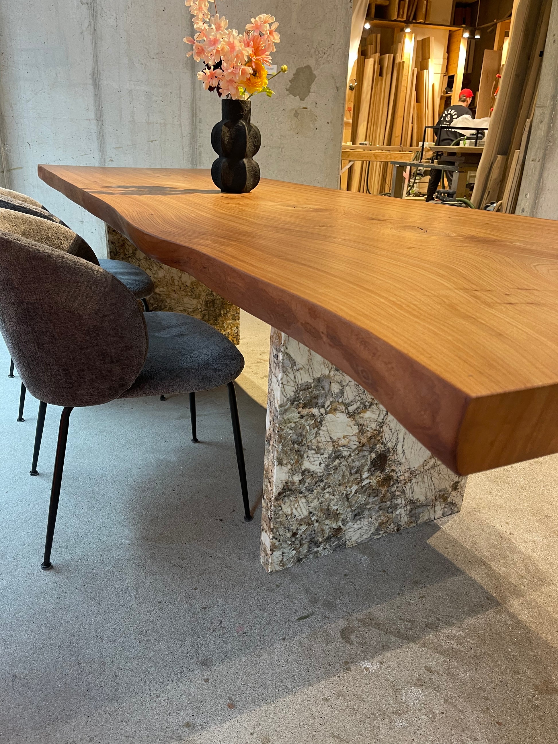 Exklusiver Massivholztisch aus Ulmenholz mit Natursteingestell 330x100cm