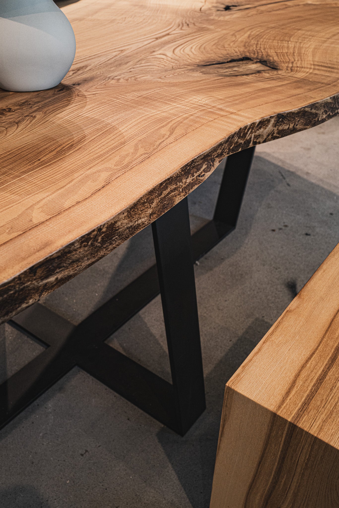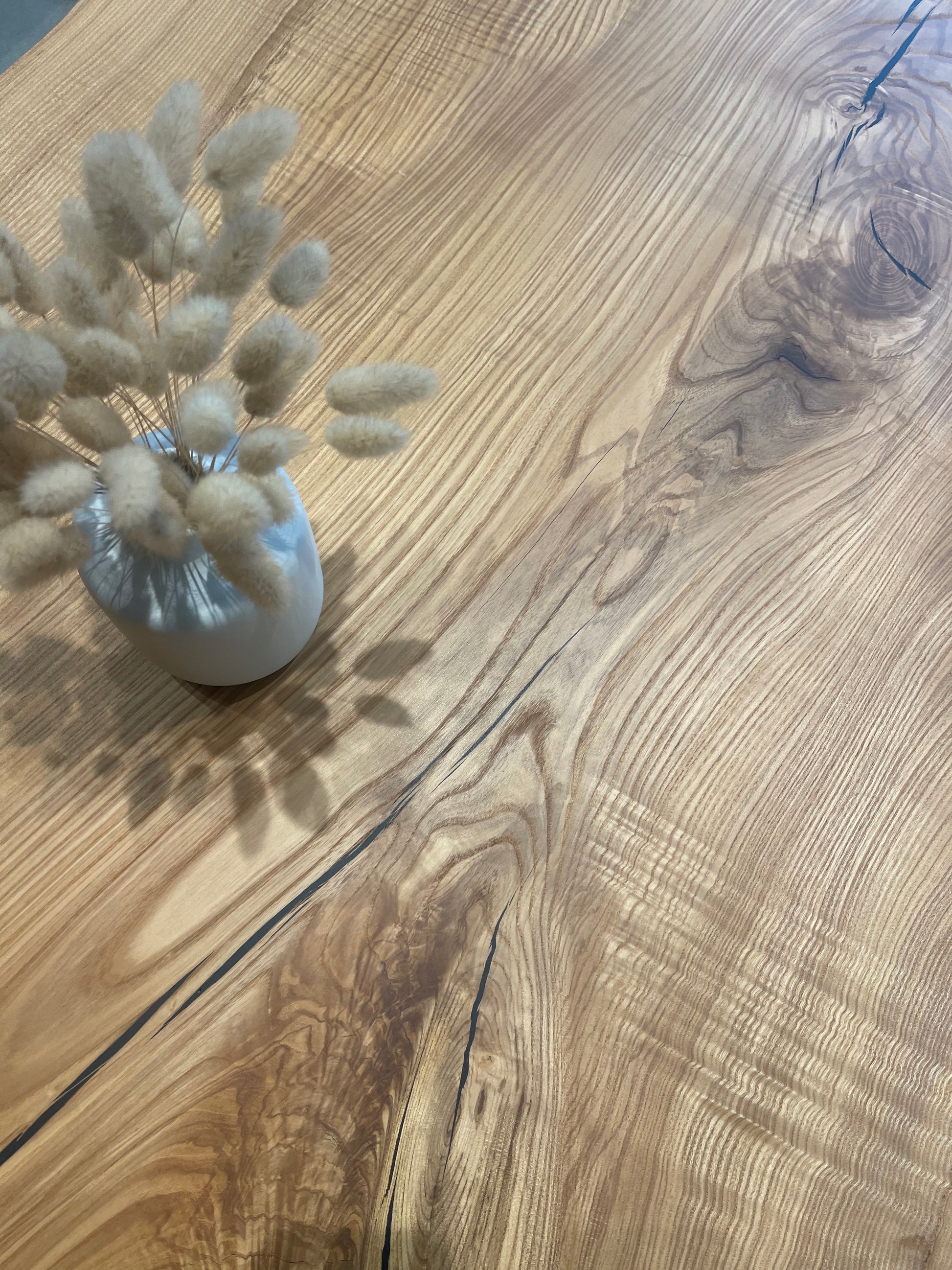 Dieser exklusive Esstisch aus massivem Eschenholz beeindruckt mit seiner einzigartigen Baumkante und der hochwertigen Verarbeitung. Die Tischplatte besteht aus einer einzigen Stammbohle, was den Tisch zu einem echten Unikat macht. Die Oberfläche ist sorgfältig geölt und gewachst, wodurch das Holz optimal geschützt wird. Flecken, Flüssigkeiten und Wasserränder haben keine Chance – selbst Tomatensauce lässt sich problemlos entfernen.