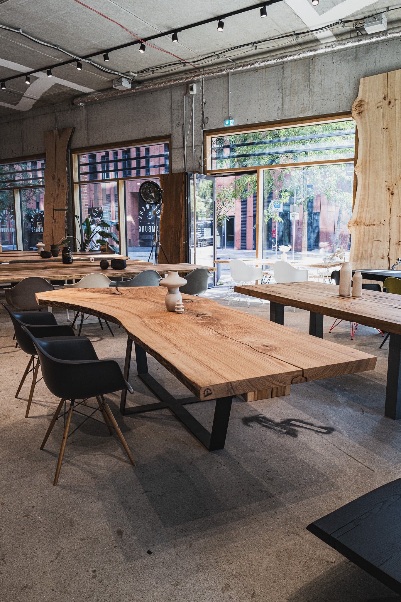 In der Hamburger HafenCity – voll mit Massivholztischen, Platten und persönlicher Beratung im Atelier-Flair. Live vor Ort oder per Video.