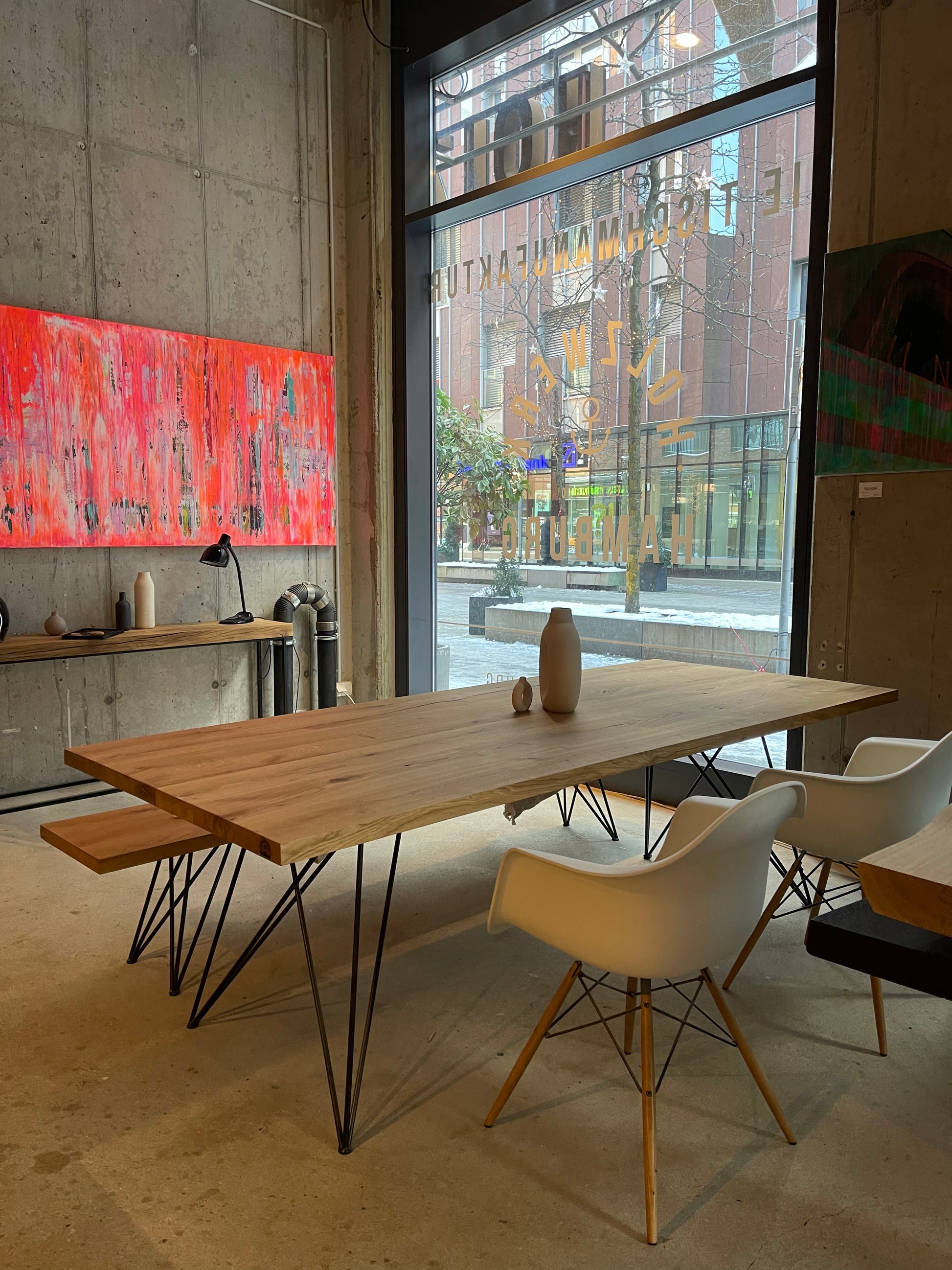 In der Hamburger HafenCity – voll mit Massivholztischen, Platten und persönlicher Beratung im Atelier-Flair. Live vor Ort oder per Video.
