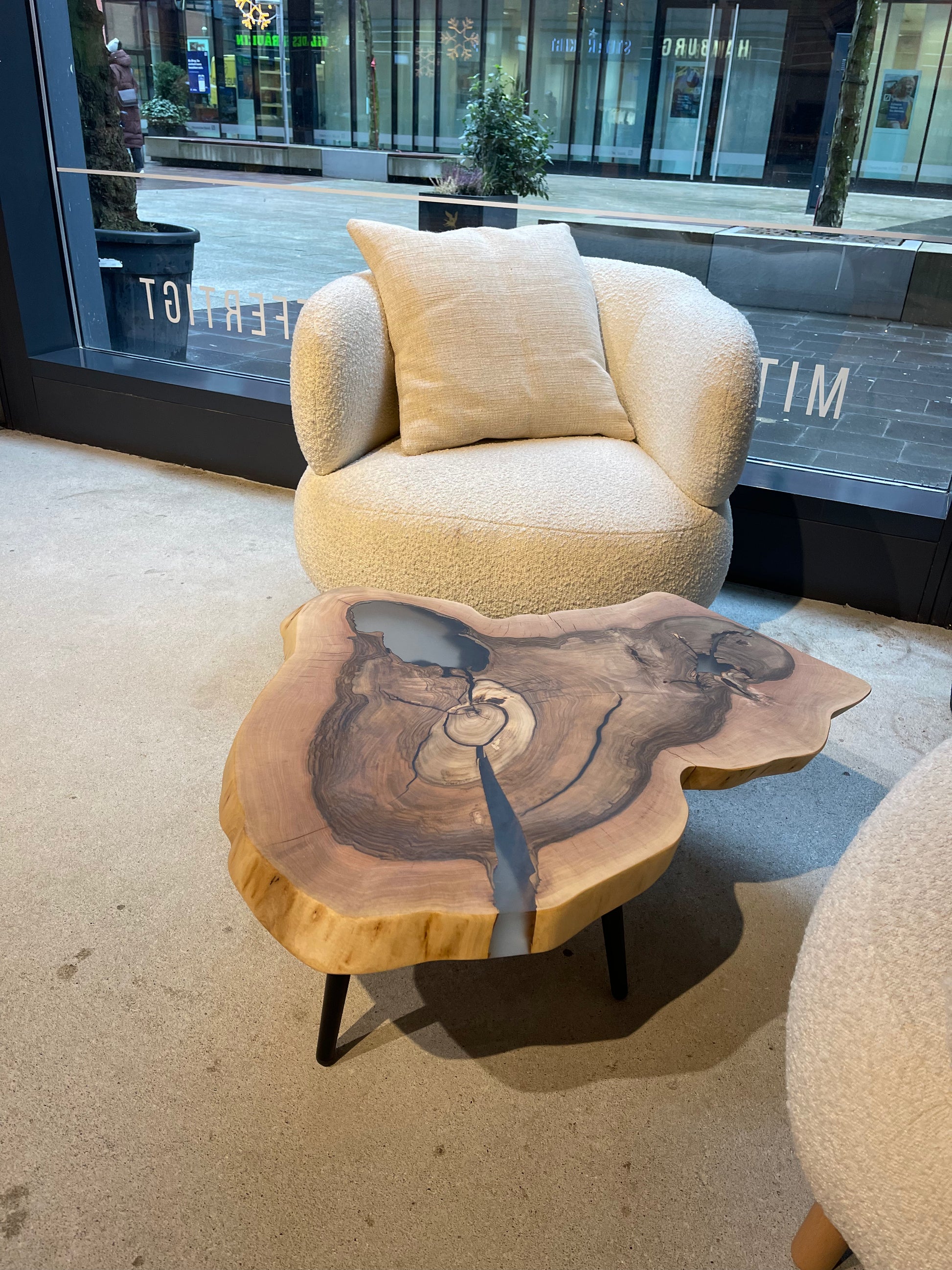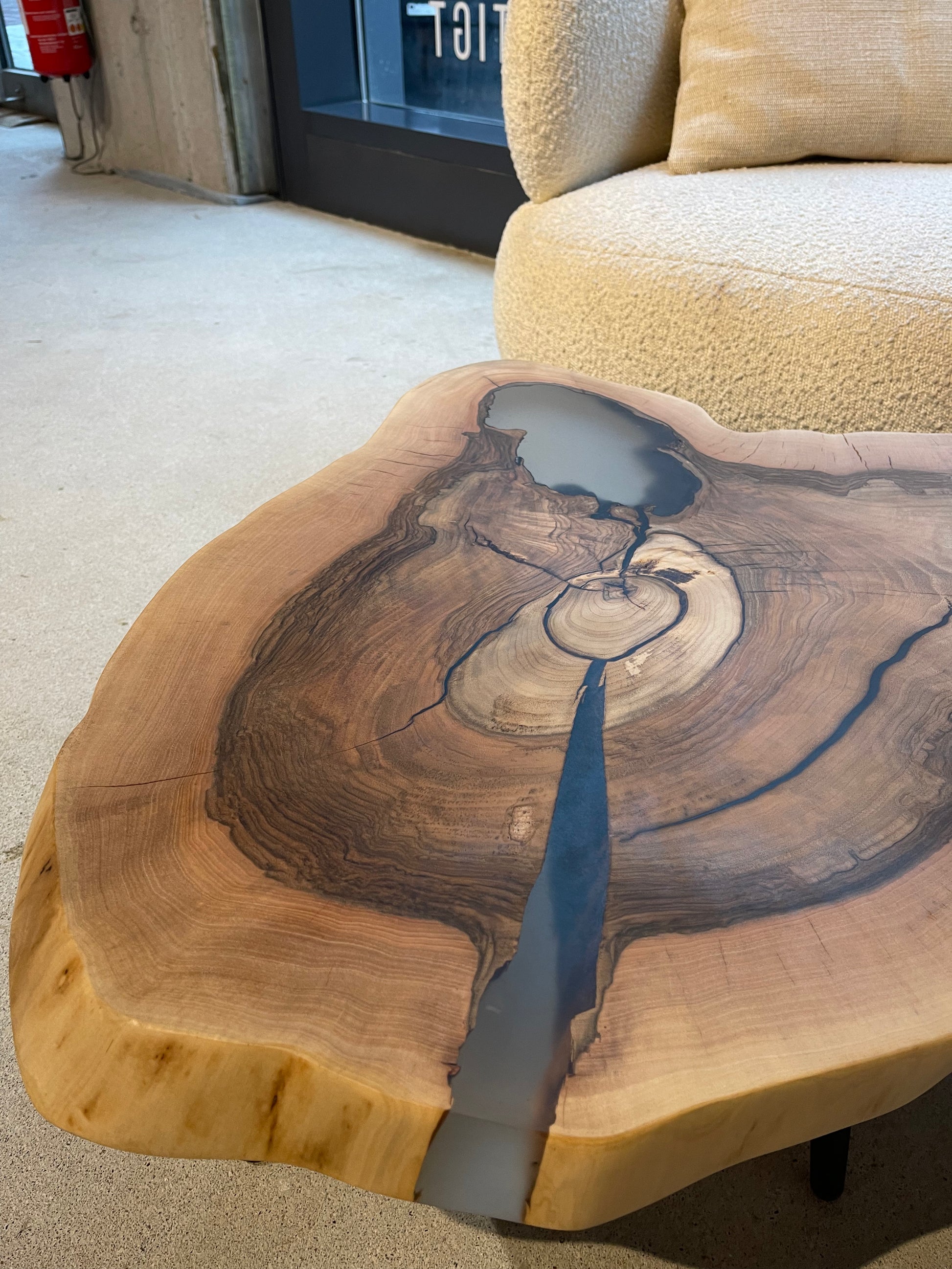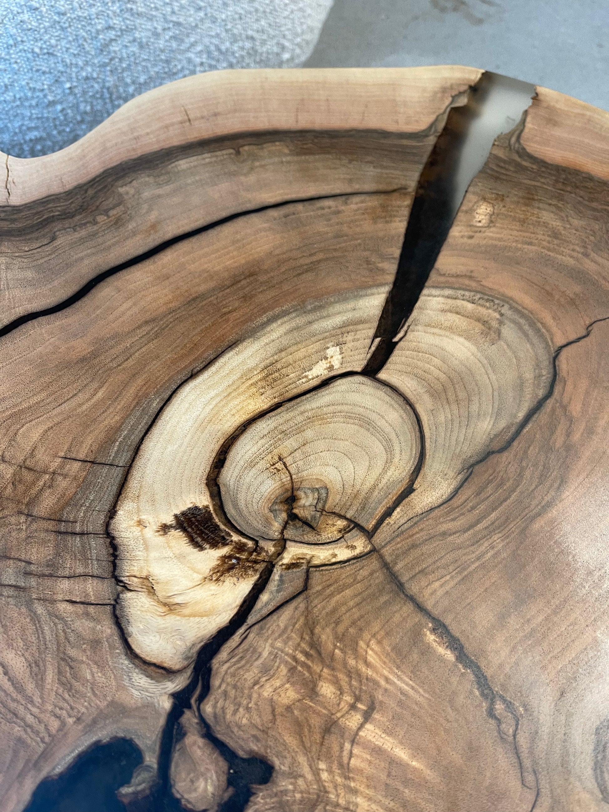 Couchtisch Walnuss aus einer Baumscheibe verfüllt mit Epoxy