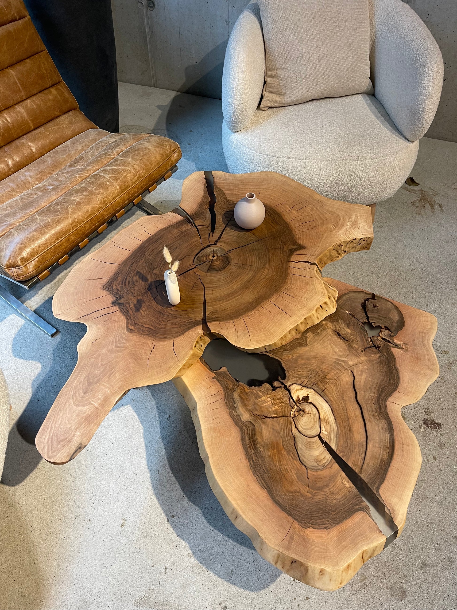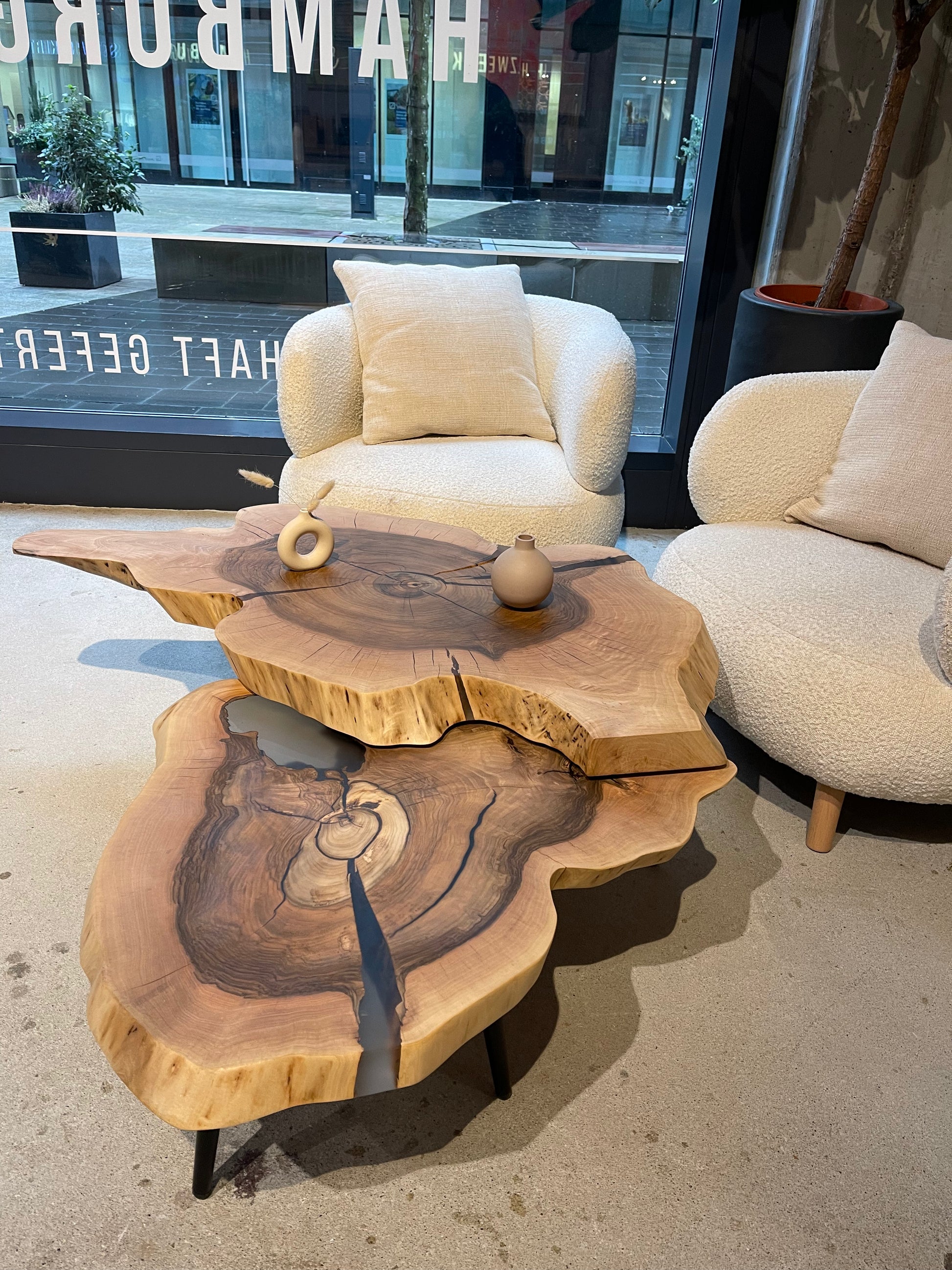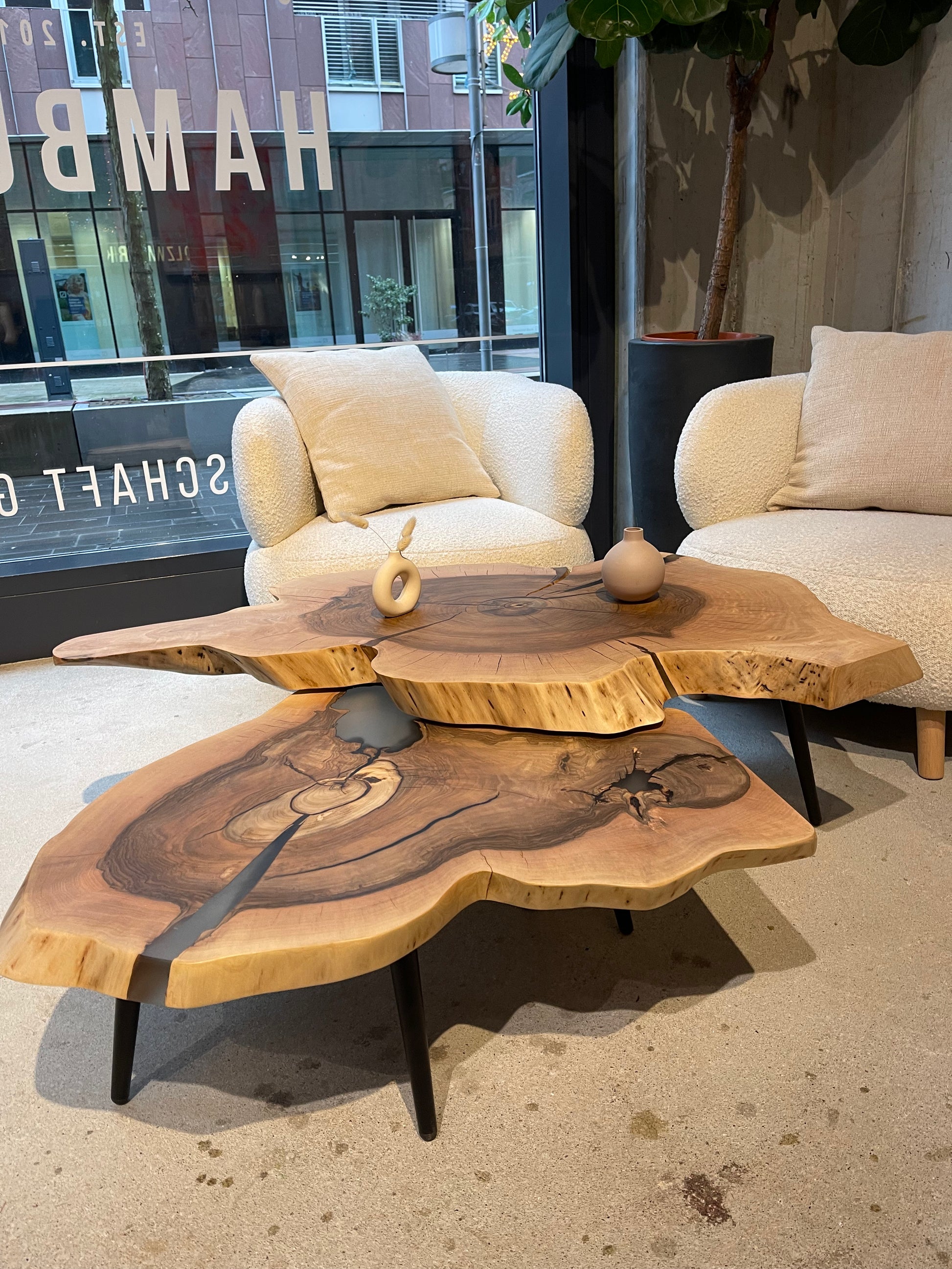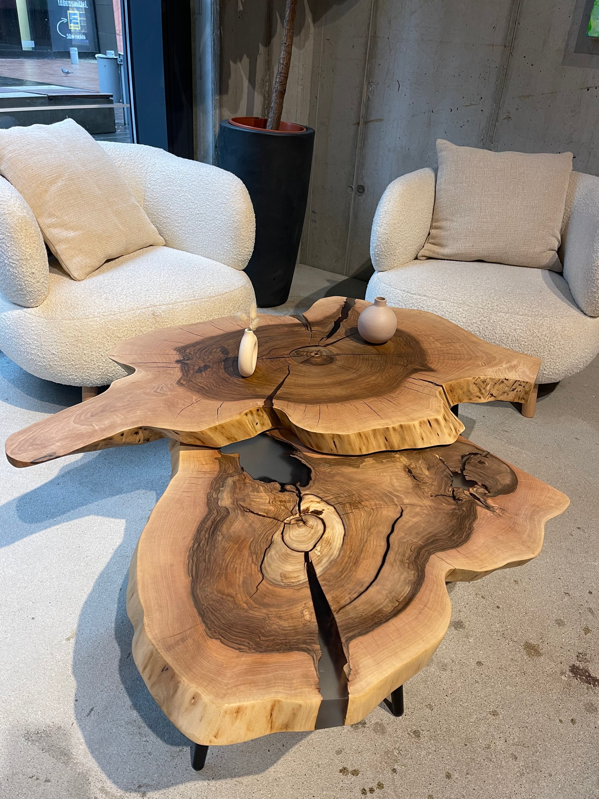 Diese exklusiven Couchtische aus europäischem Nussbaum überzeugen durch ihre außergewöhnliche, bunte Maserung und natürlichen Kanten. Jede Baumscheibe ist ein Unikat und bringt mit ihrer organischen Form und lebendigen Holzstruktur ein Stück Natur in Ihr Zuhause.