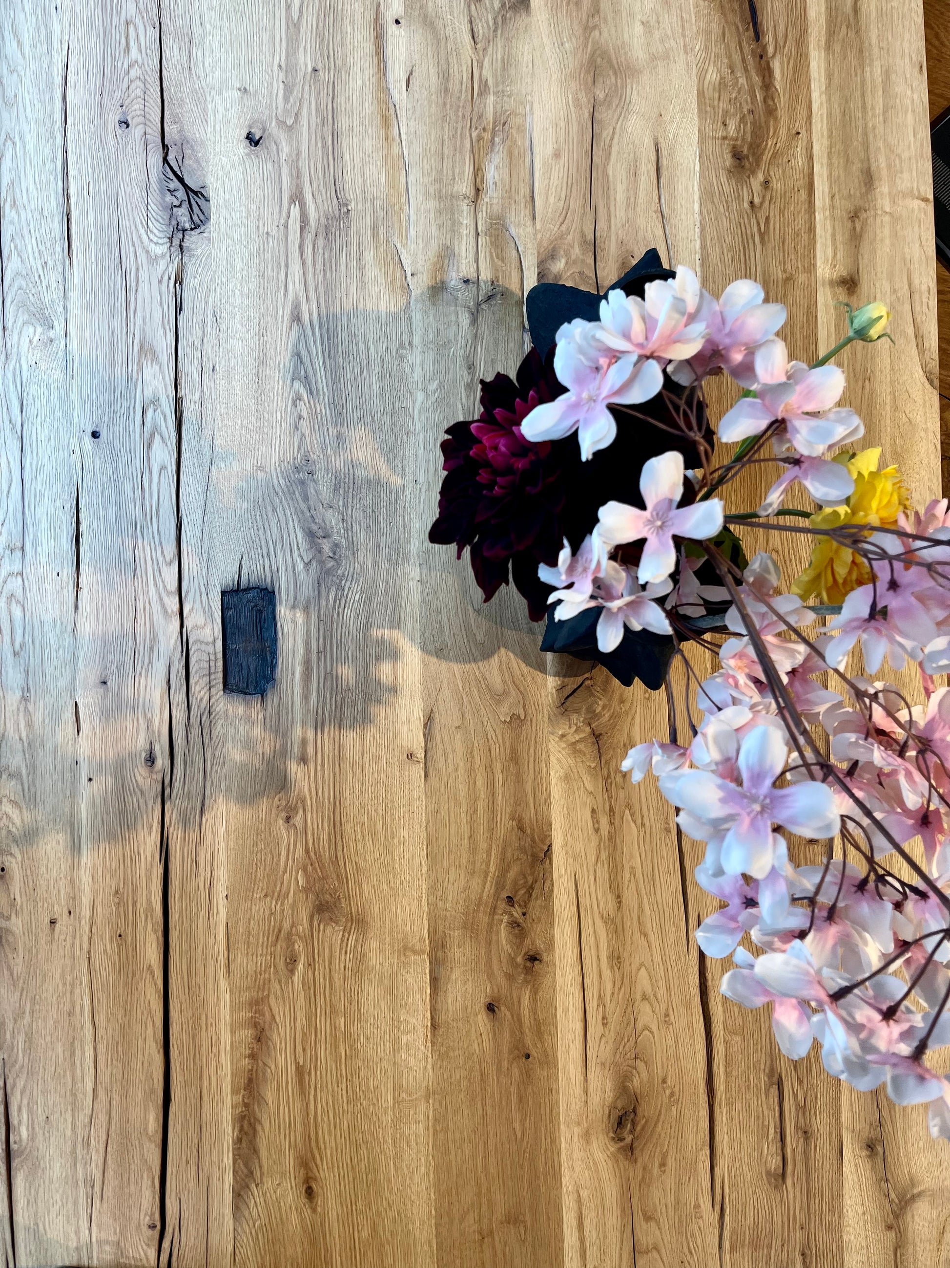 Die Tischplatte beeindruckt mit einer stattlichen Stärke von 7 cm, besteht aus vollmassivem Holz und bewahrt die charakteristischen Merkmale des alten Eichenholzes. Die Bearbeitung erfolgt größtenteils in Handarbeit, wodurch jeder Riss präzise ausgeschliffen wird, ohne den ursprünglichen Charakter durch maschinelle Verarbeitung zu verfälschen. Abschließend wird die Oberfläche mit hochwertigem Hartwachsöl behandelt, das für einen natürlichen Look sorgt und gleichzeitig Schutz vor Flecken und Flüssigkeiten bietet.