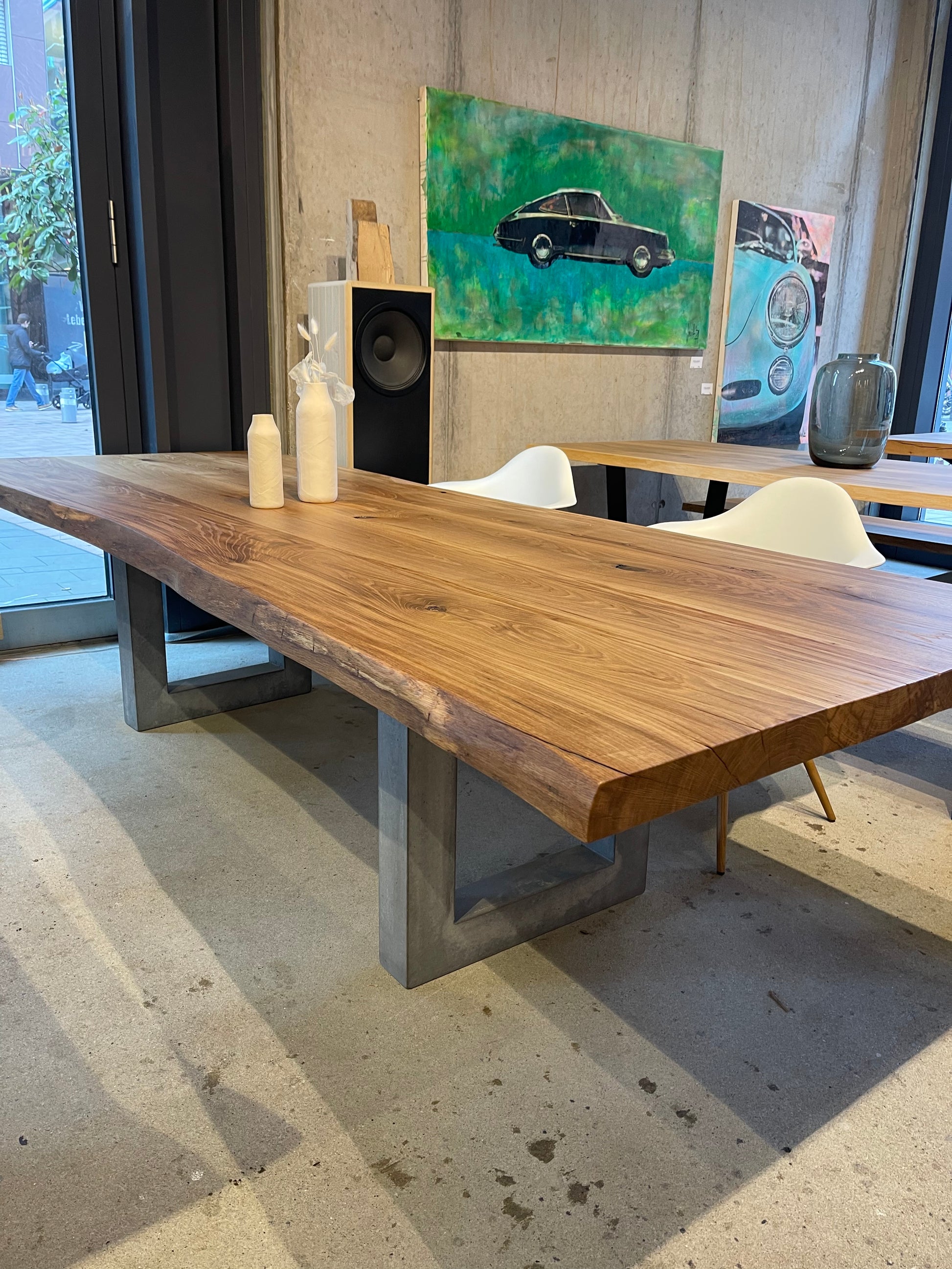 Ein besonderes Highlight ist das massive Tischgestell aus Beton, das in U-Form gefertigt ist. Mit einer Profilstärke von 10 × 10 cm sorgt es für maximale Stabilität und verleiht dem Tisch eine markante, stilvolle Optik. Die Kombination aus natürlichem Holz und industriellem Beton macht diesen Tisch zu einem echten Statement-Stück.