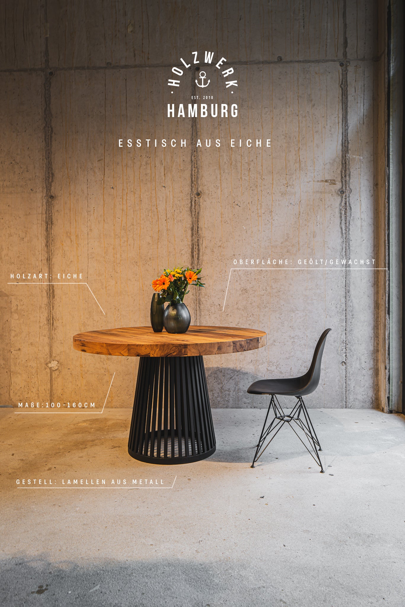 Dieser wunderschöne runde Massivholztisch kombiniert die Authentizität von historischem Eichenholz-Altholz mit einem modernen Mittelfuß aus Metall mit Lamellen. Der besondere Materialmix aus Holz und Metall macht diesen Tisch zu einem echten Blickfang in jedem Wohnraum.