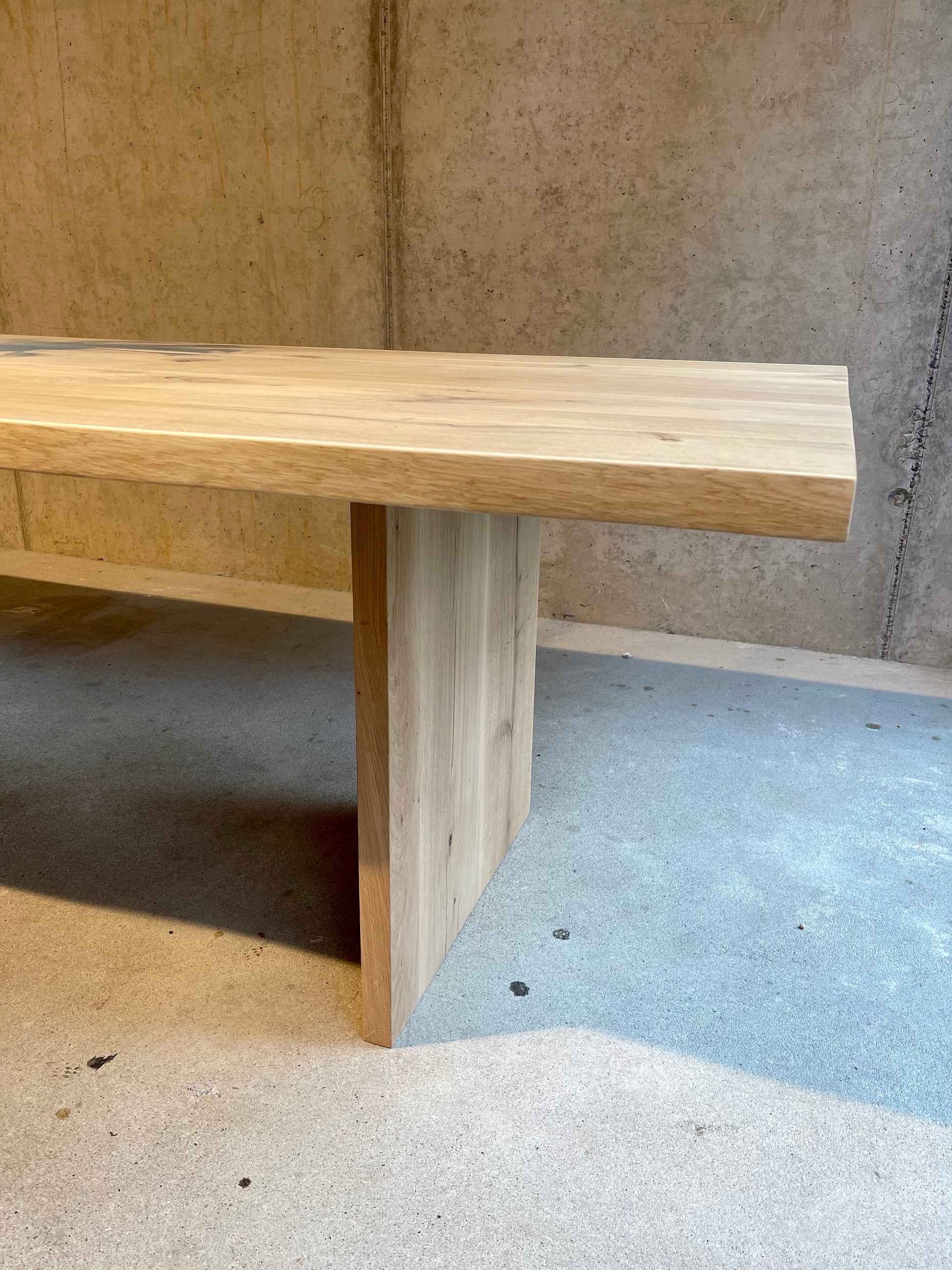 Das Tischgestell aus massiver Eiche in Wangenform passt perfekt zur Tischplatte und sorgt für eine harmonische Optik sowie hohe Stabilität.