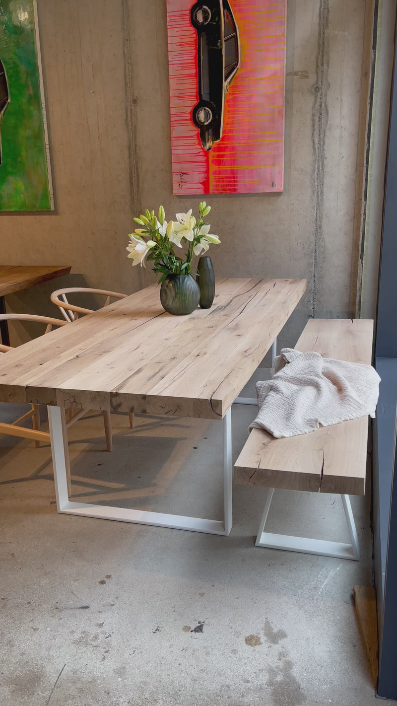 Das weiße U-förmige Stahlgestell bildet einen modernen Kontrast zur rustikalen Schönheit des Altholzes. Diese harmonische Verbindung aus Alt und Neu verleiht dem Tisch einen zeitlosen Charakter, der sich mühelos in unterschiedliche Einrichtungsstile integriert.