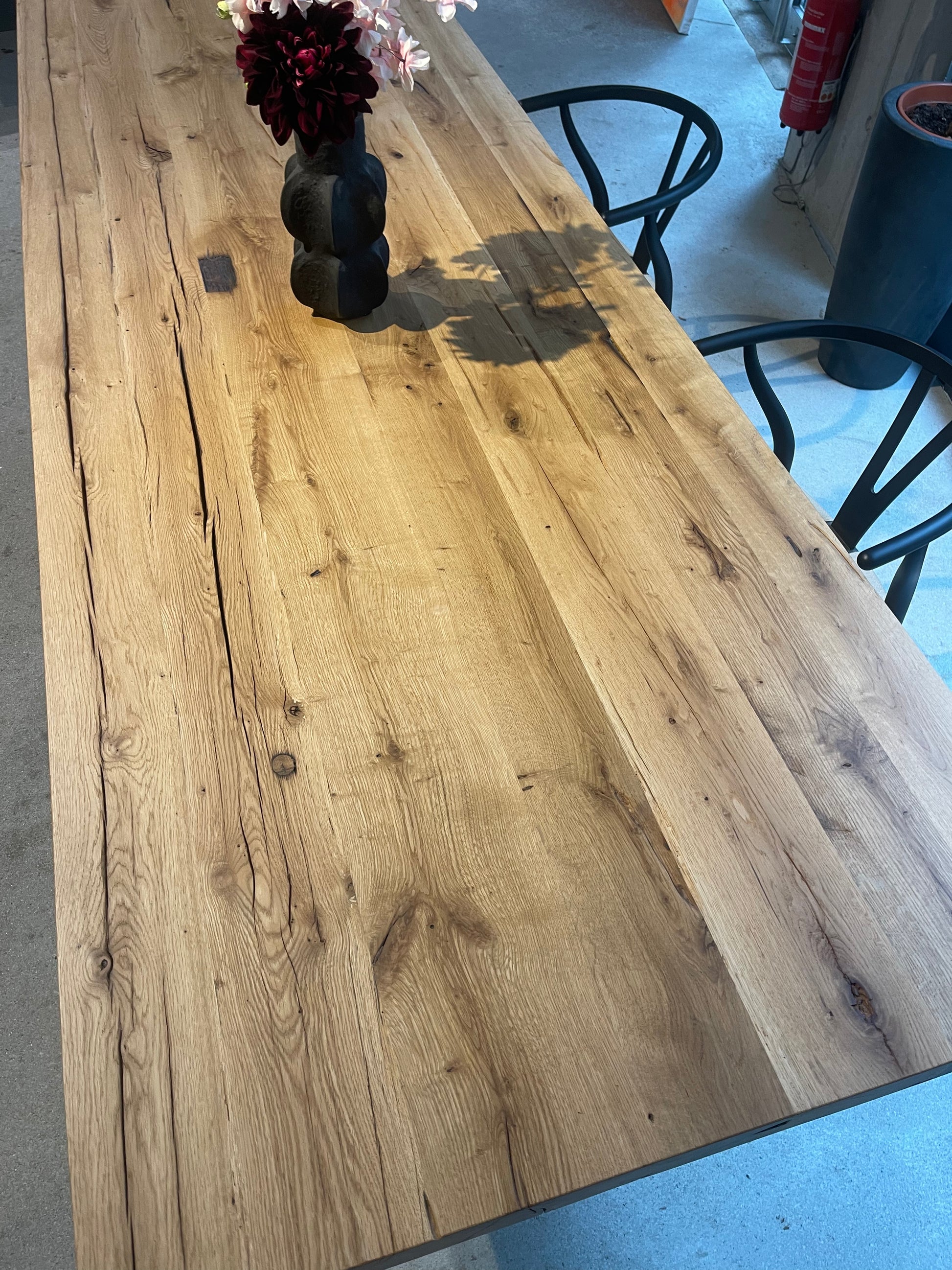 Die 7 cm starke, vollmassive Tischplatte besteht ausschließlich aus hochwertigem Eichenholz – keine Aufdopplung oder Furnier, sondern echtes Handwerk. Jeder Tisch wird in sorgfältiger Handarbeit bearbeitet, wobei Risse und natürliche Strukturen bewusst erhalten bleiben. So entsteht eine charmante, rustikale Oberfläche, die die Geschichte des Holzes widerspiegelt.