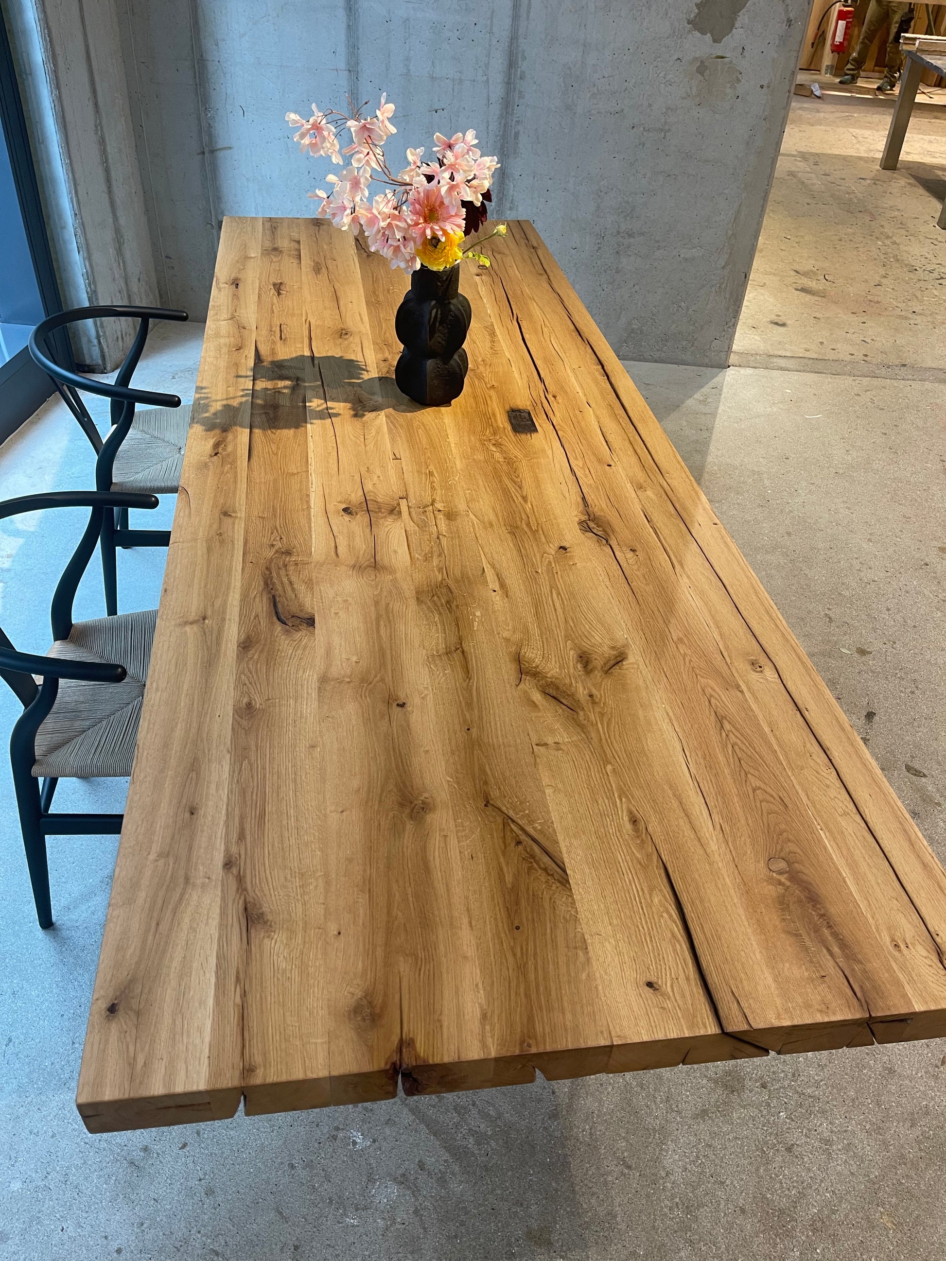 Ein einzigartiger Massivholztisch, der Geschichte, Handwerkskunst und modernes Design perfekt verbindet.