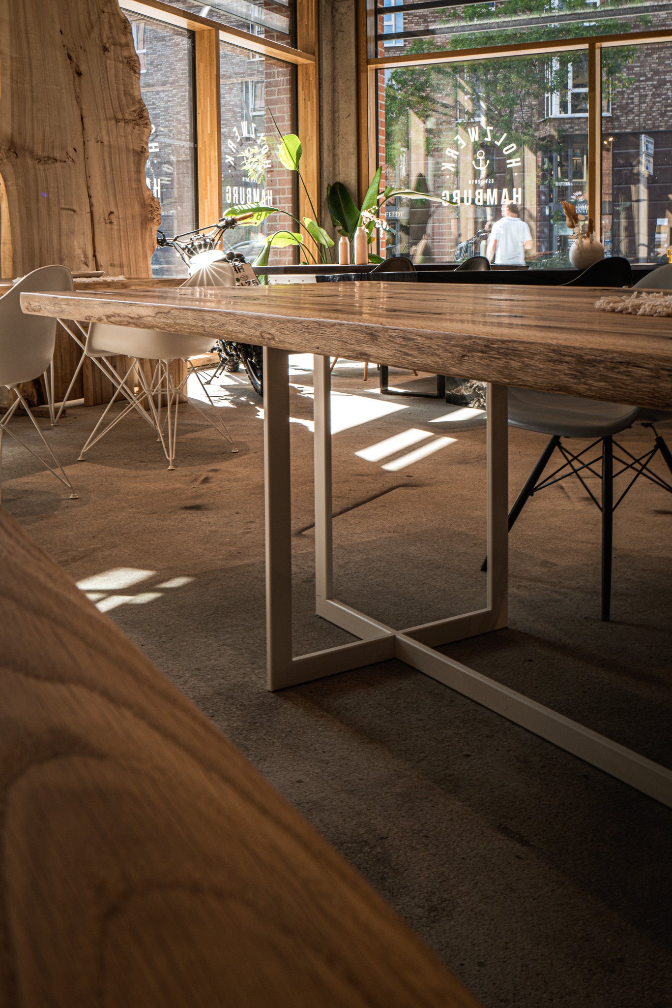 Das Tischgestell aus Metall mit weißer Pulverbeschichtung sorgt für eine moderne, leichte Optik und bildet einen stilvollen Kontrast zur massiven Holzplatte. Andere Gestellformen und Farben sind nach Absprache individuell anpassbar.