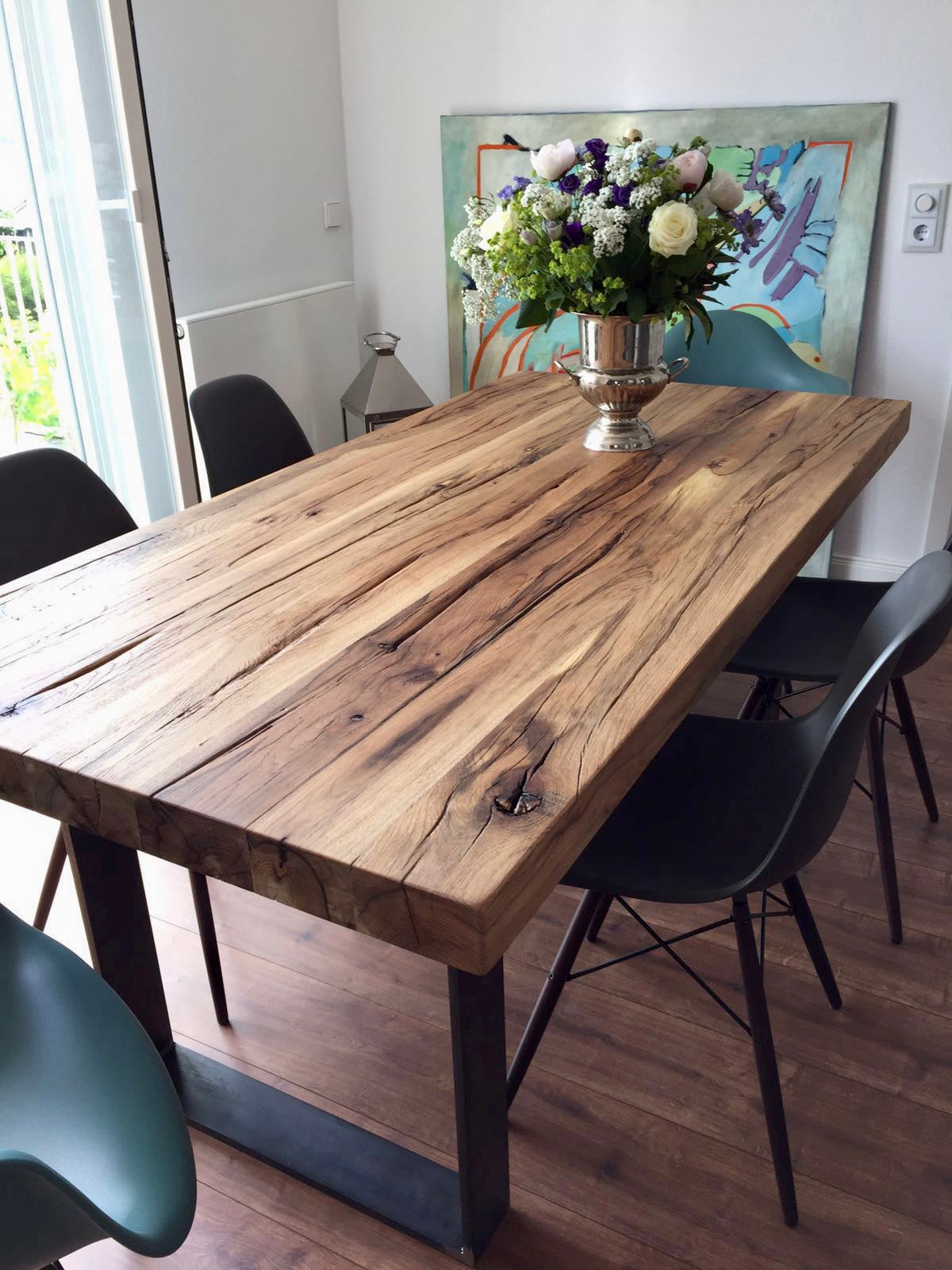 Dieser einzigartige Esstisch aus massiver, wilder Eiche vereint ursprünglichen Charme mit modernem Design. Die natürliche Maserung mit ästhetischen Ästen und Rissen macht jede Tischplatte zu einem unverwechselbaren Unikat.