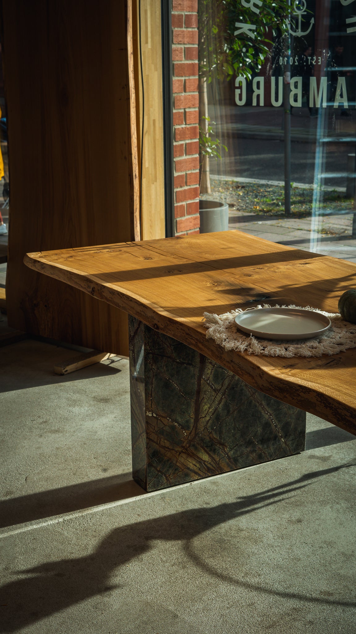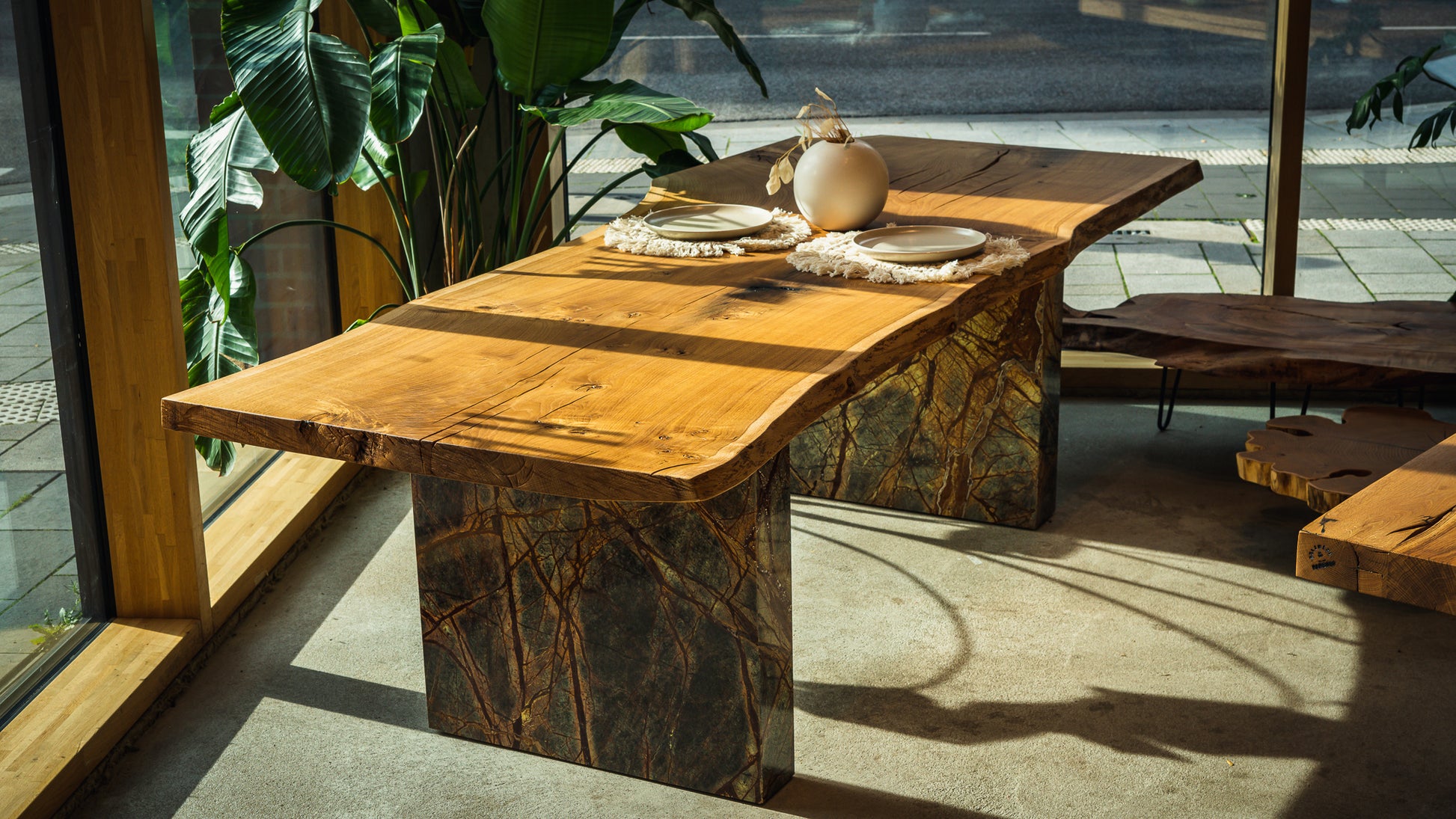 Ein einzigartiger Monolith-Tisch, der mit handwerklicher Perfektion, natürlichen Materialien und außergewöhnlichem Design überzeugt.